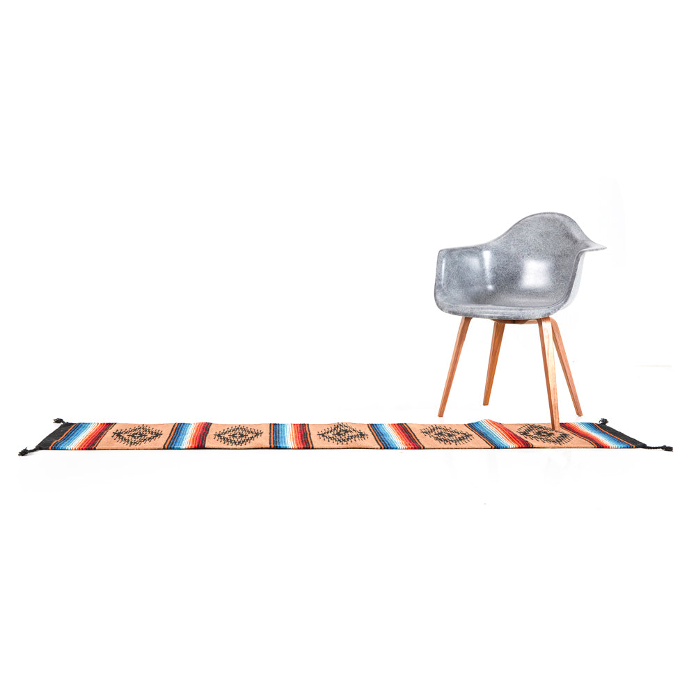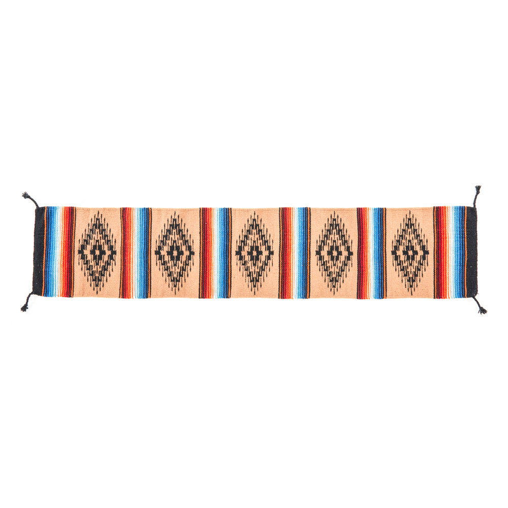 Details: Multicolored (tan-red-blue-white-black) southwestern/aztec design runner rug