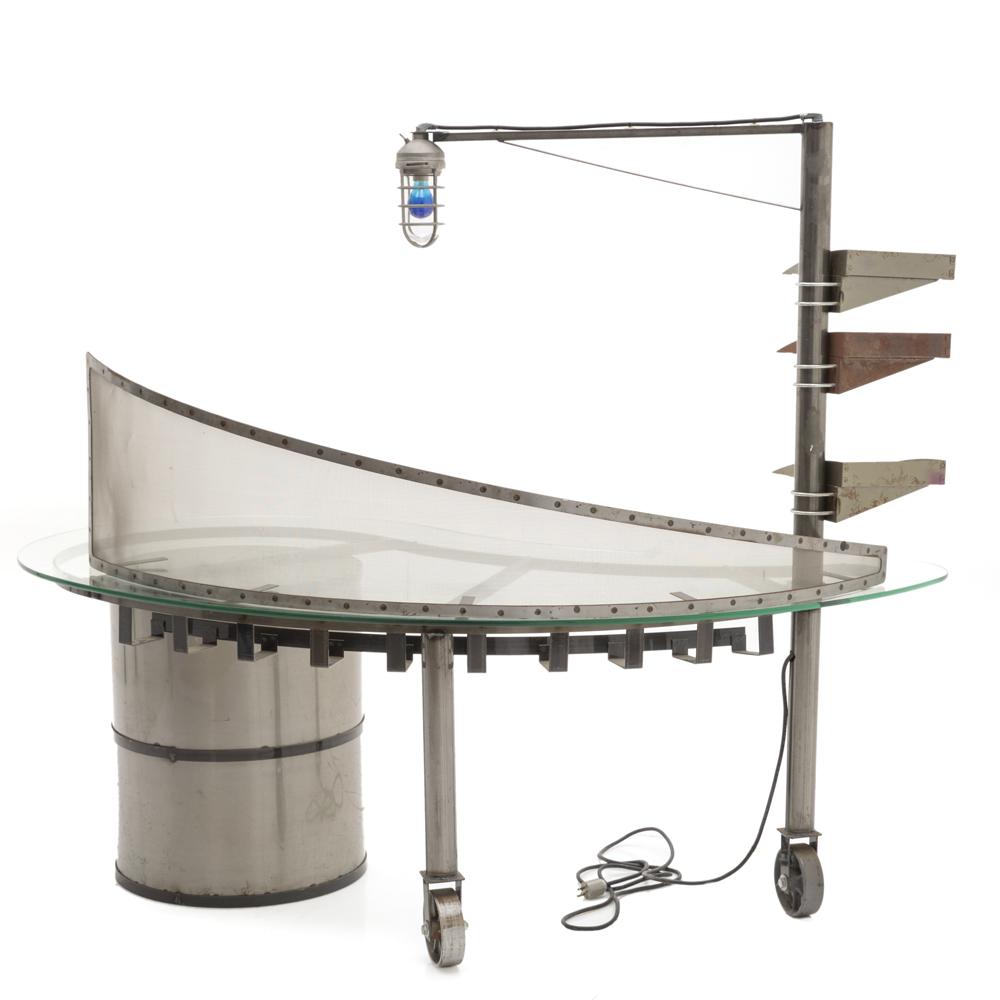 Details: Modern armchair with a narrow backrest and curved arms, constructed of ash wood, iron rods and a black leather seat Dimensions: 32.25" H x 23.5"...