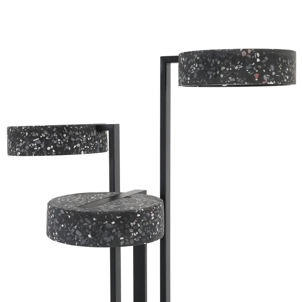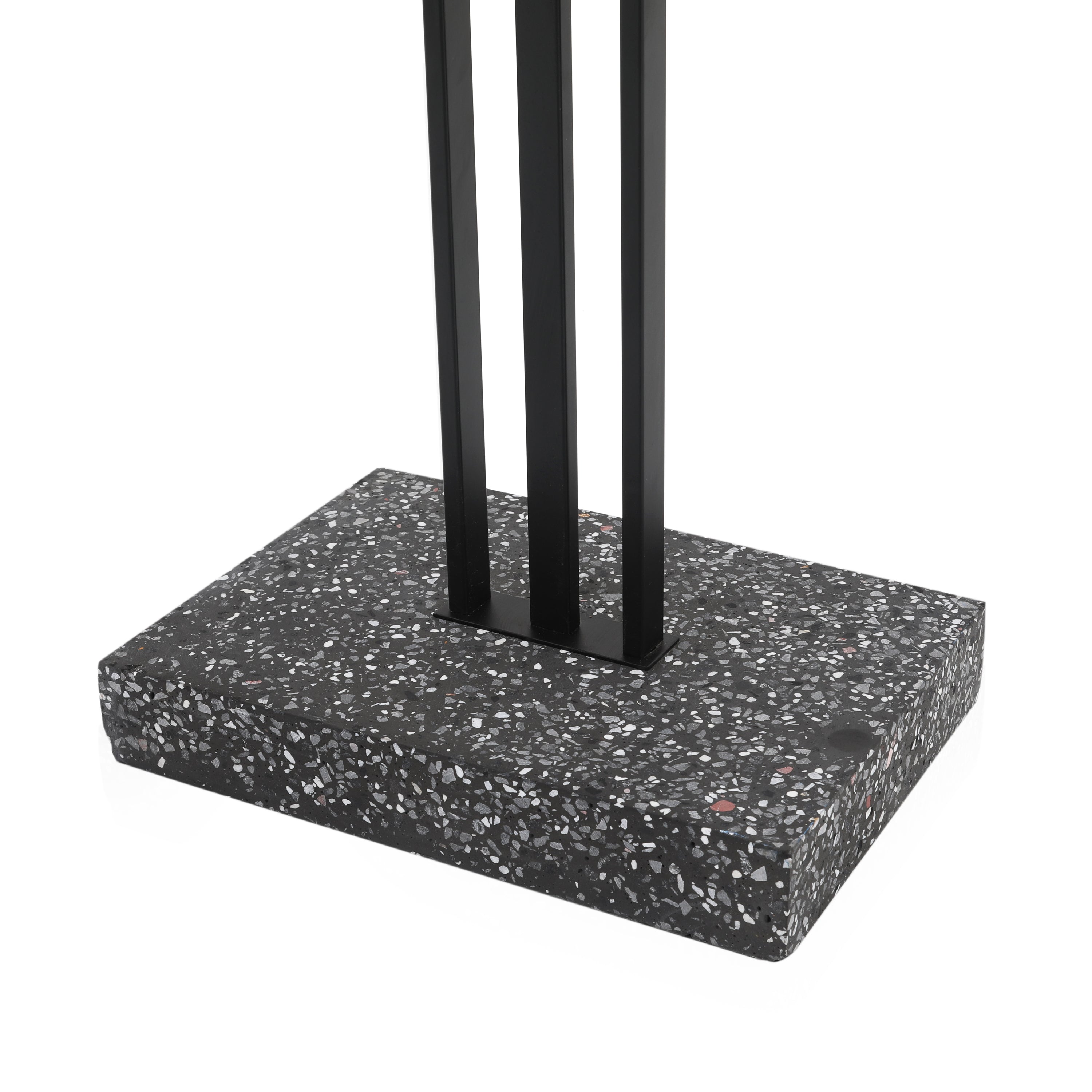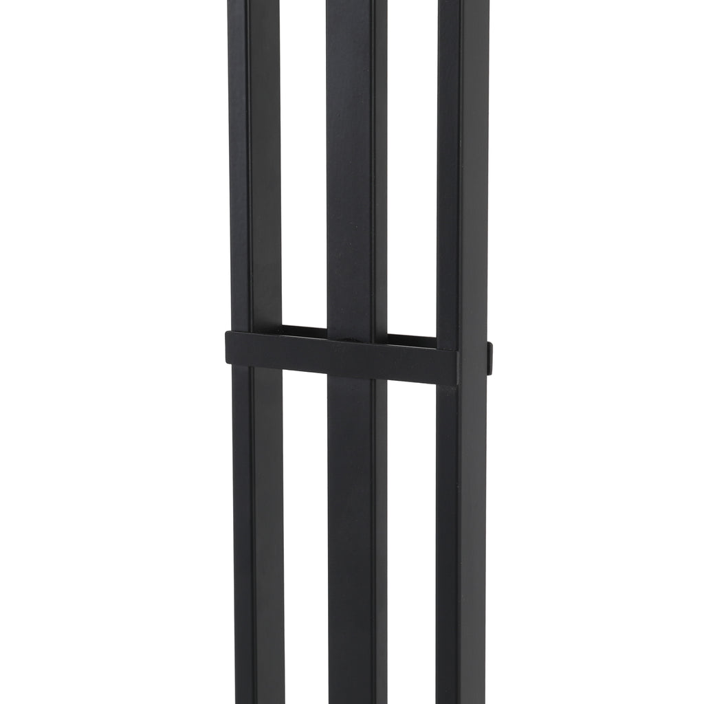 Details: Black oval cutout frame mid-century floor lamp with long cream fabric shade on metal pole and round base NOTICEABLE WEAR (RENTED AS IS) Dimensions: 59"...