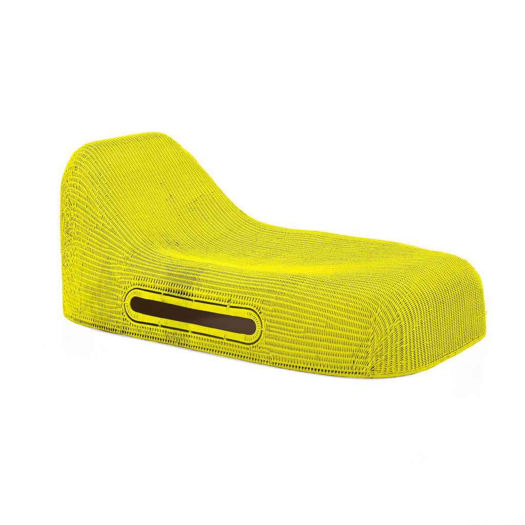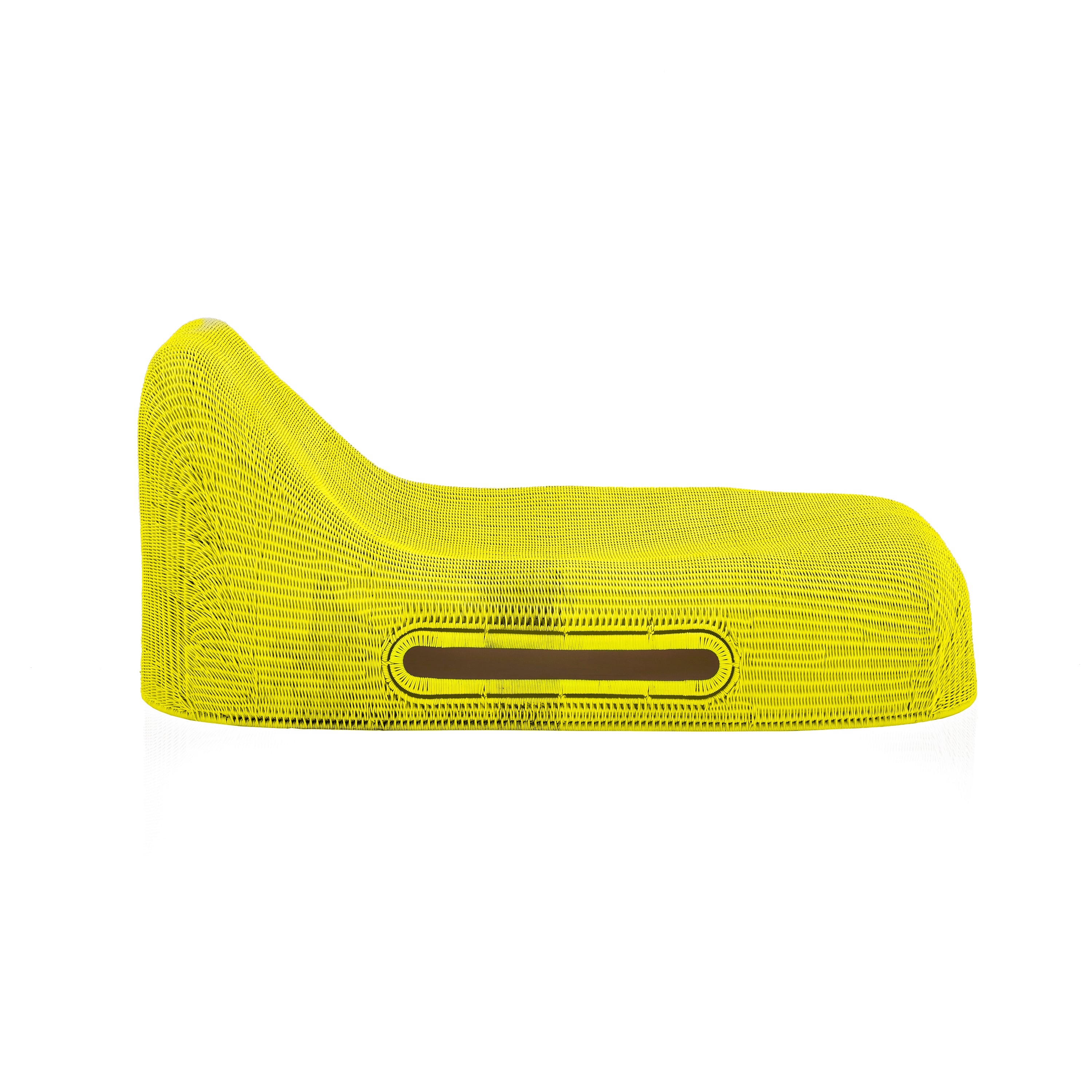 Details: Yellow Ultra Suede, Gossip Bench, Curved Seating, Chrome Legs, White Material Table Connector, Curved Back Rest, Chrome Slanted Legs Dimensions: 36" H x 115"...
