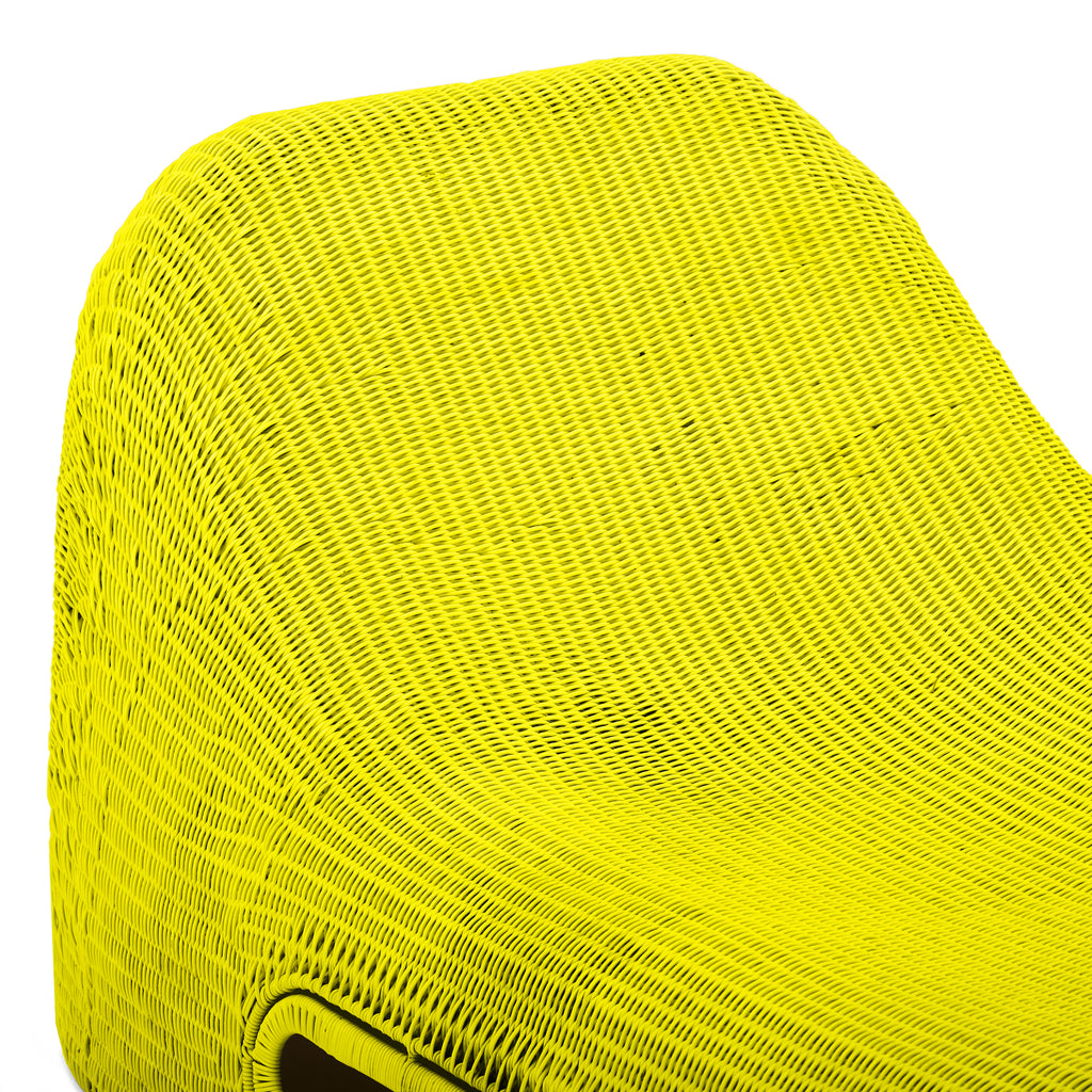 Details: Mid-century dining chair with yellow metal frame, wicker back and patterned vinyl seat cushion