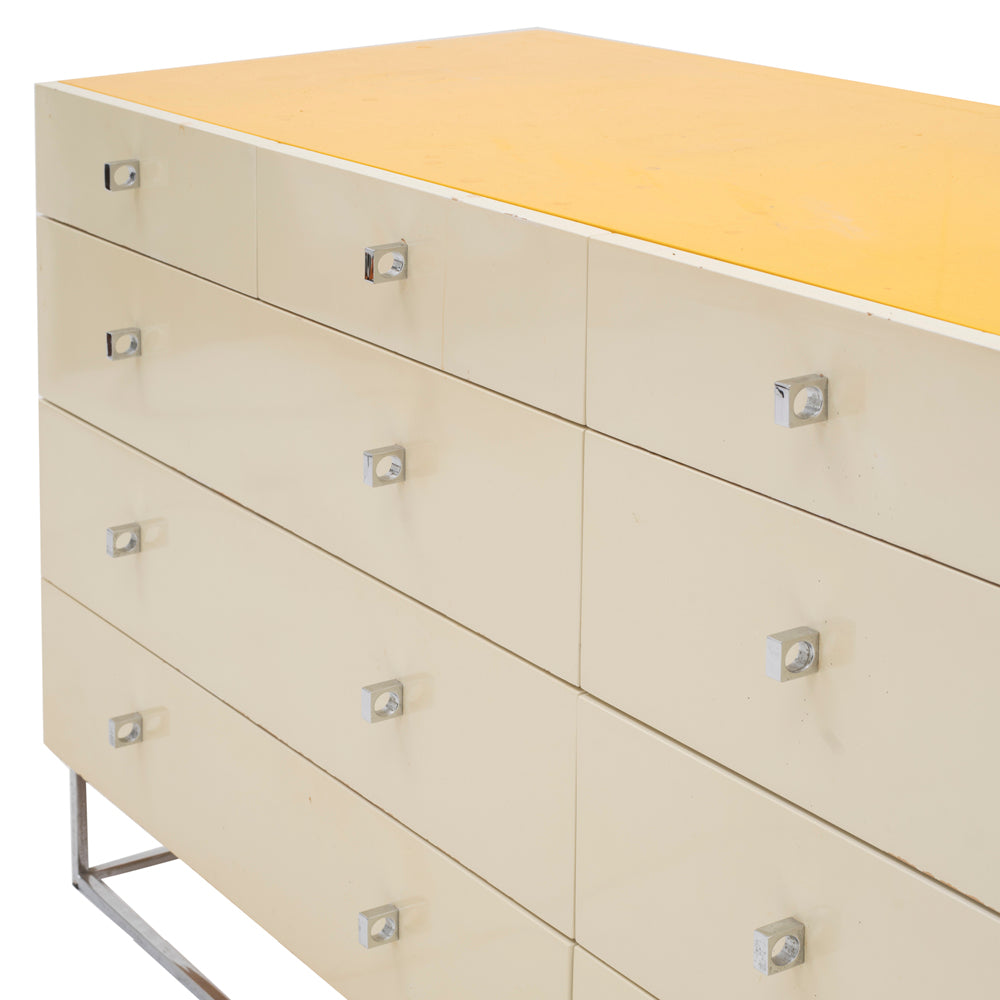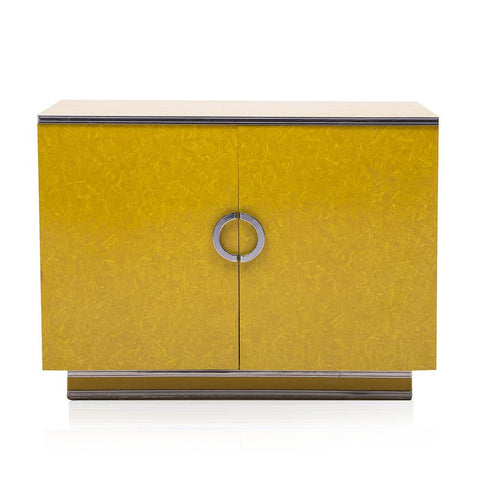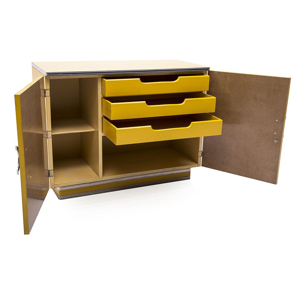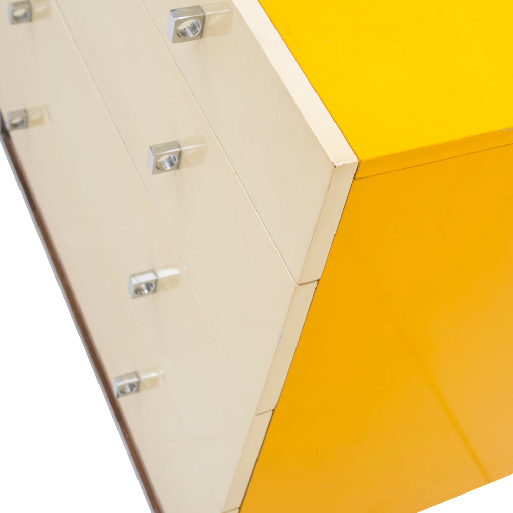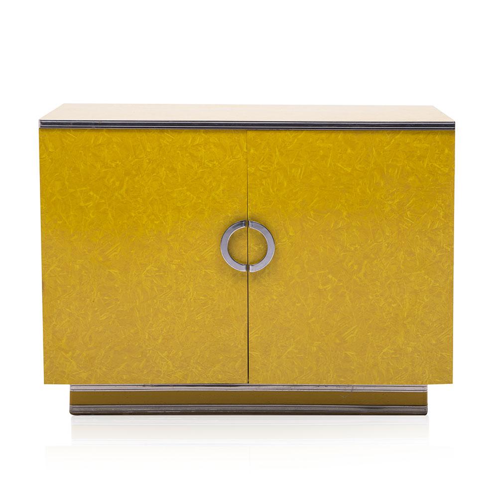 Details: Rare tanker style credenza / cabinet with yellow panels. Metallic accents / legs / corners. Part of a 4-piece set with a desk and x2 side cabinets...