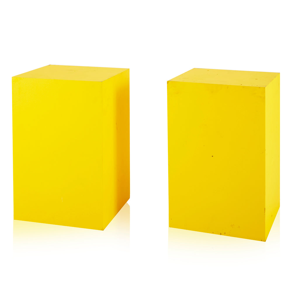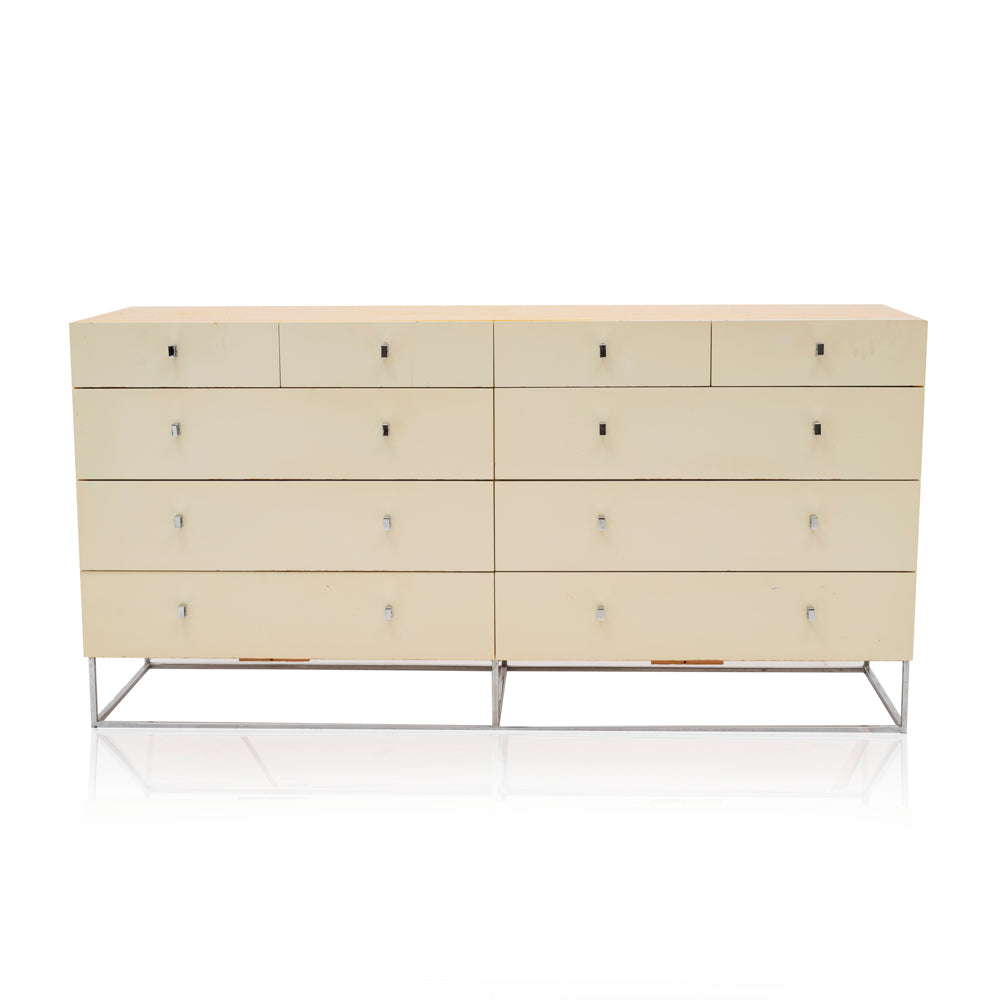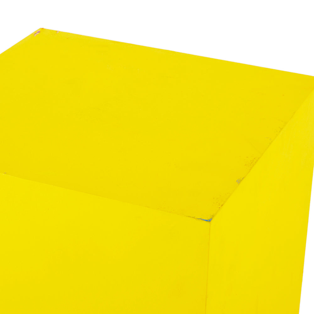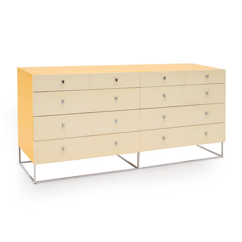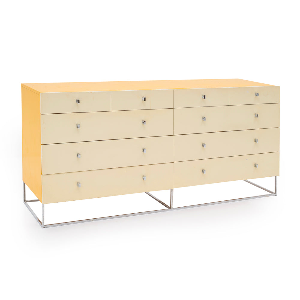 Details: Rare tanker style credenza / cabinet with yellow panels. Metallic accents / legs / corners. Part of a 4-piece set with a desk and x2 side cabinets...
