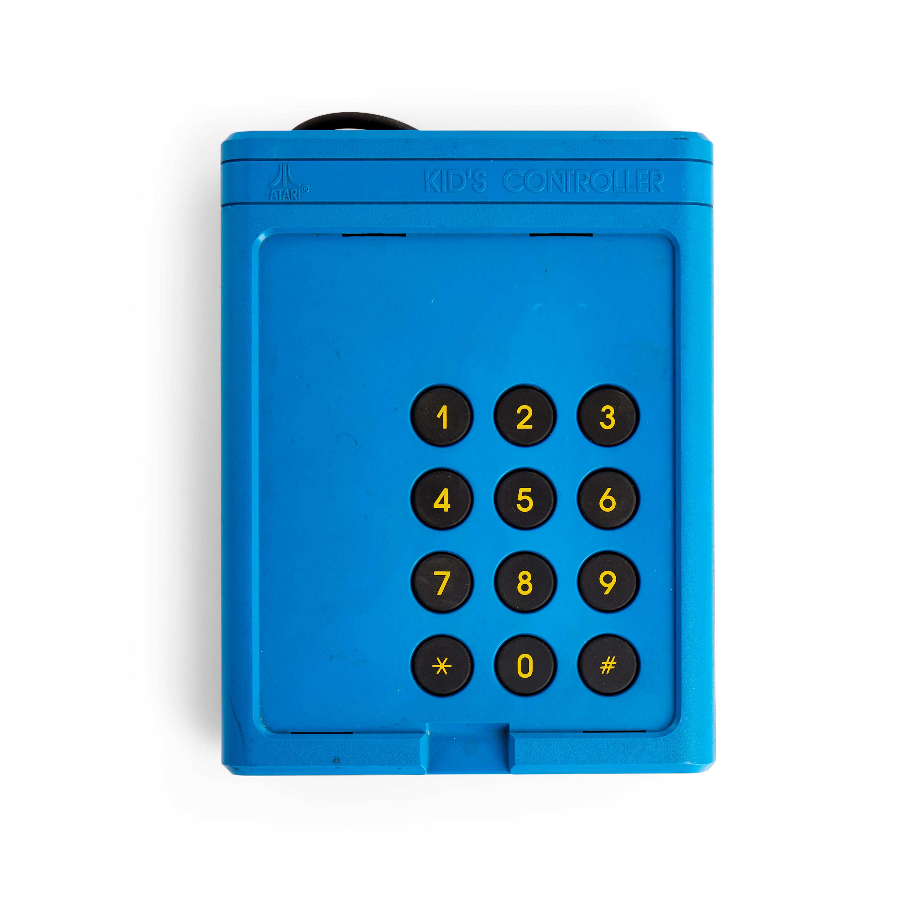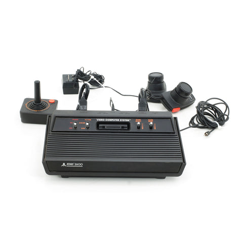 Details: Black Atari game system with joy stick and controllers Dimensions: 4" H x 14" W x 9" D Quantity: 1