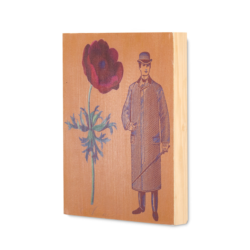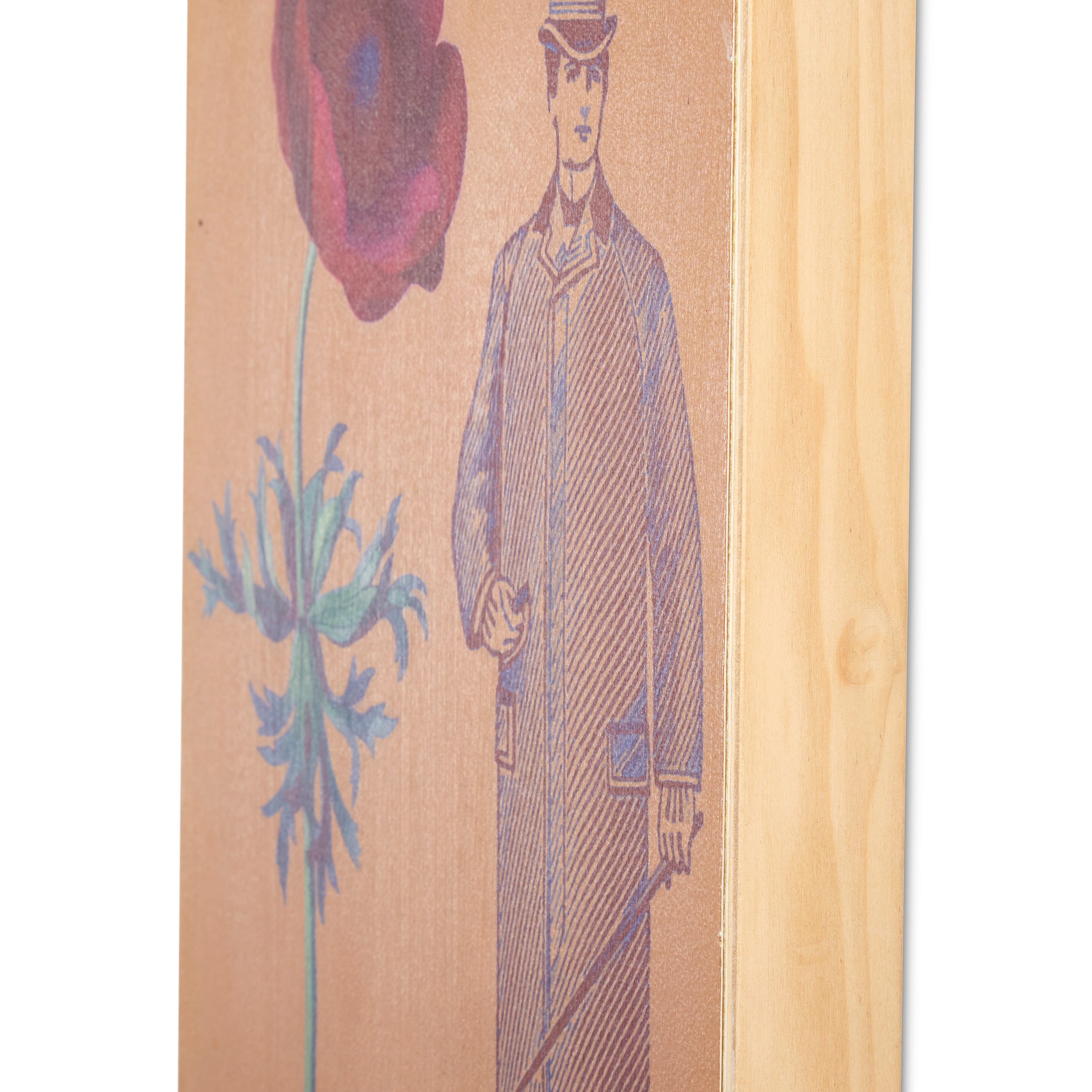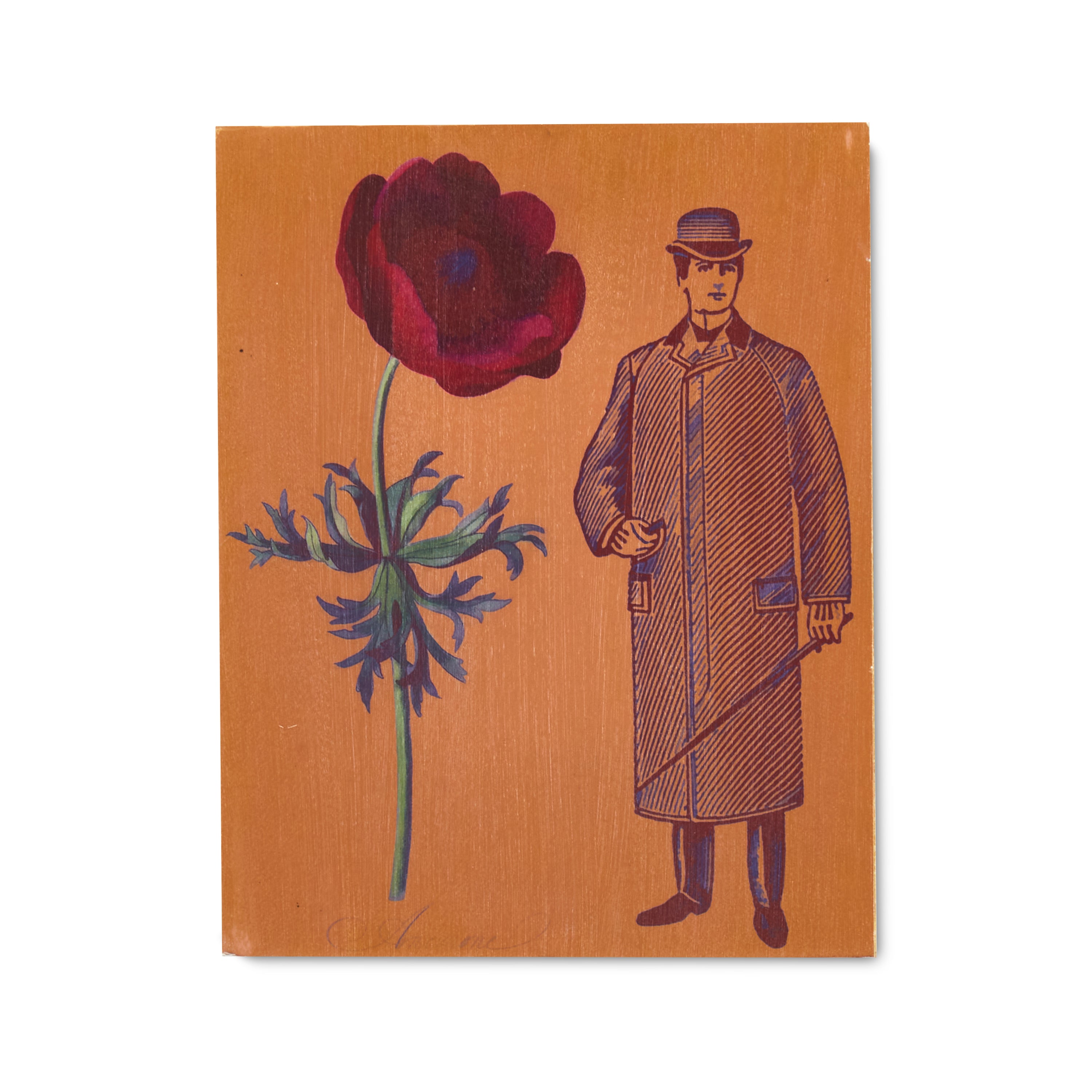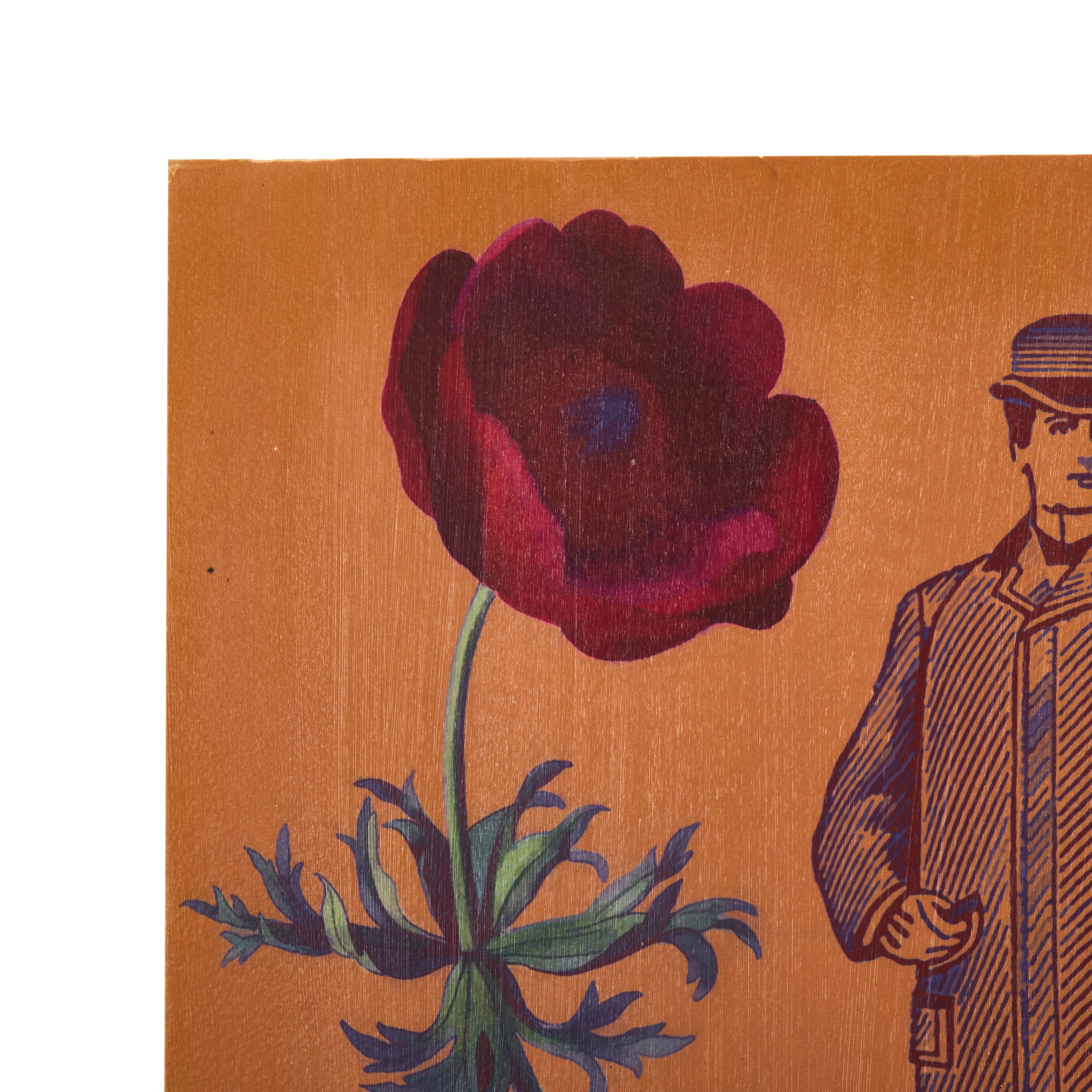 Details: Paper collage on wood panel depicting a vintage illustration of a man in a trench coat and bowler hat next to a red and green flower
