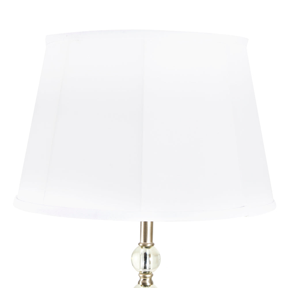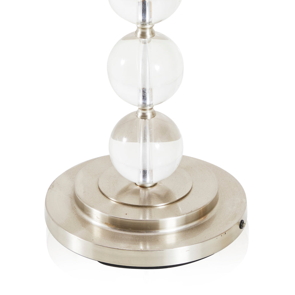 Details: Floor lamp with stacked acrylic sphere stand, metal base and a white shade