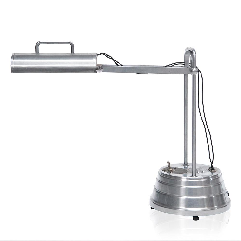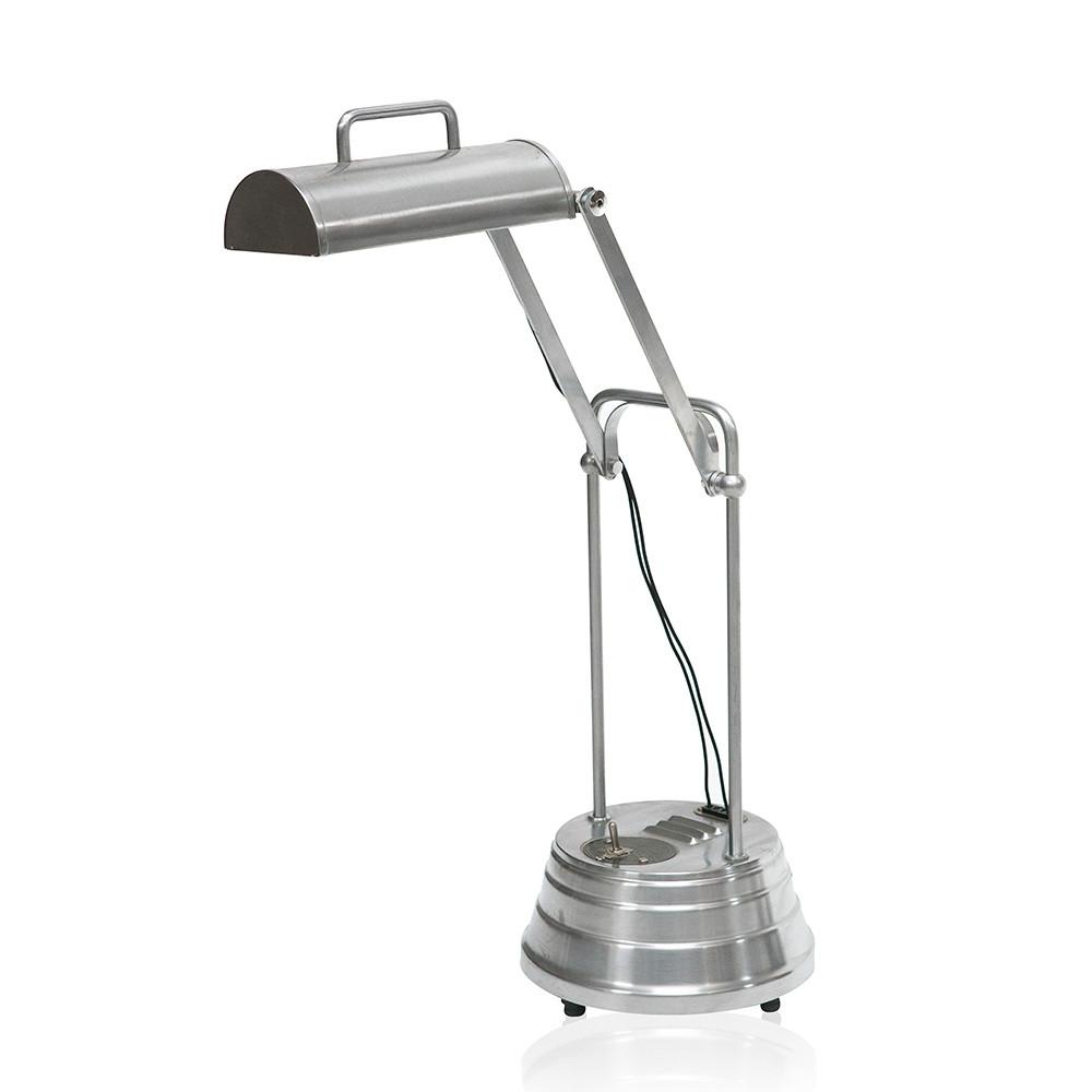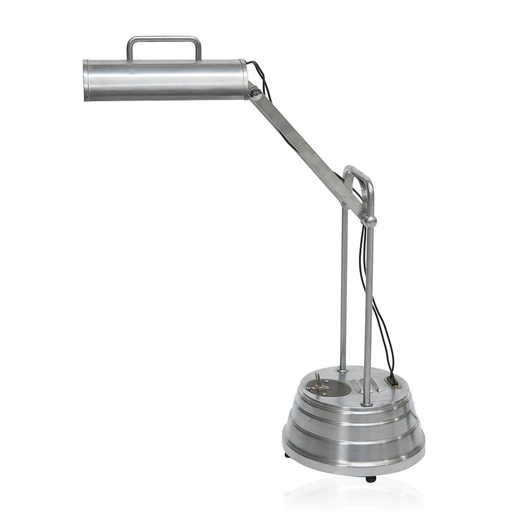 Details: Aluminum work desk lamp with shade handle, adjustable neck, and tiered base