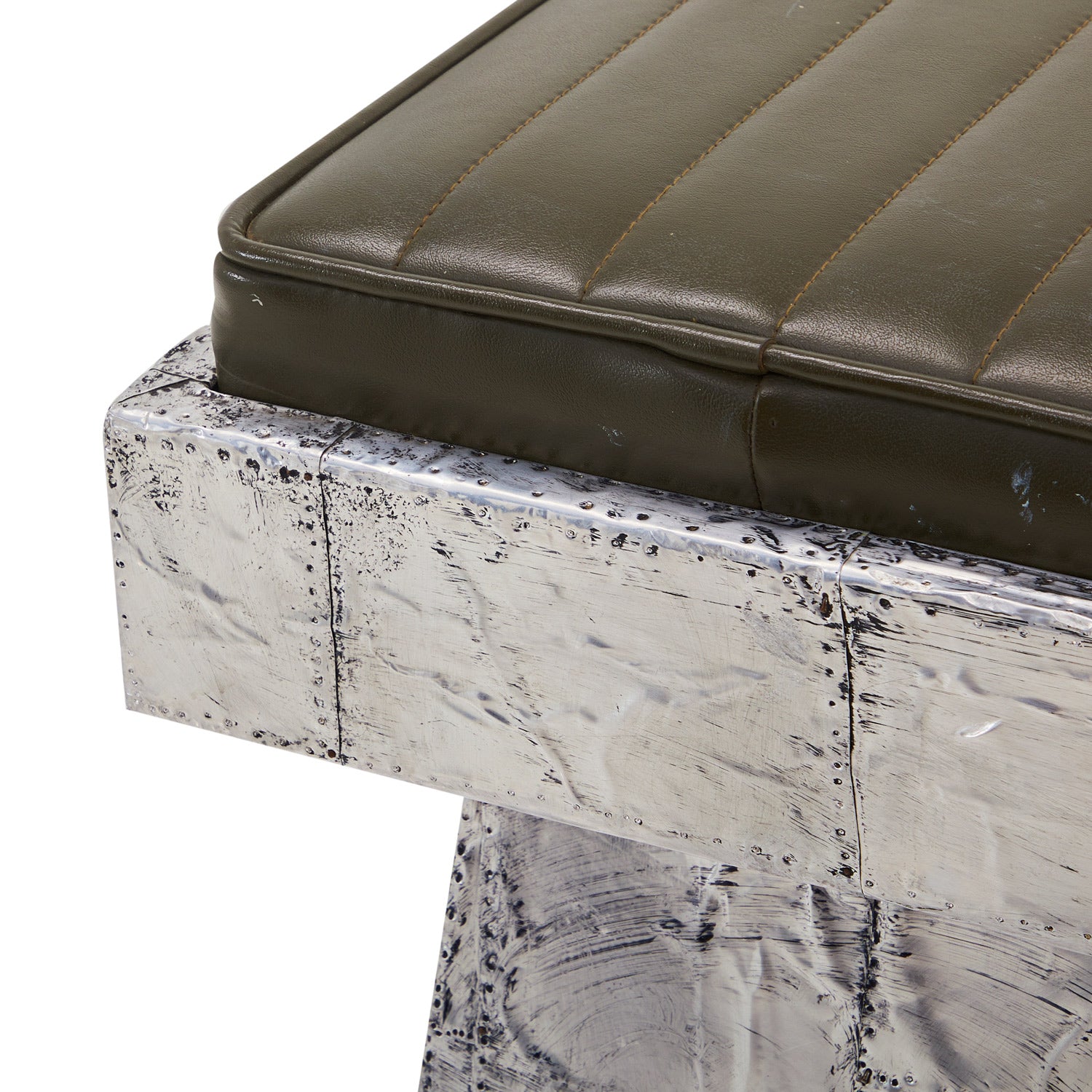 Details: Textured aluminum stool with a tapered base and a square army green cushion