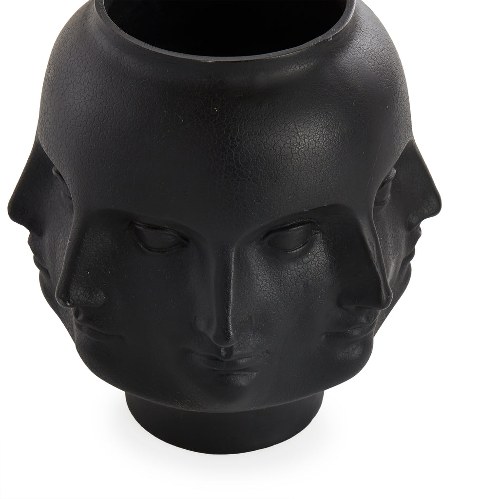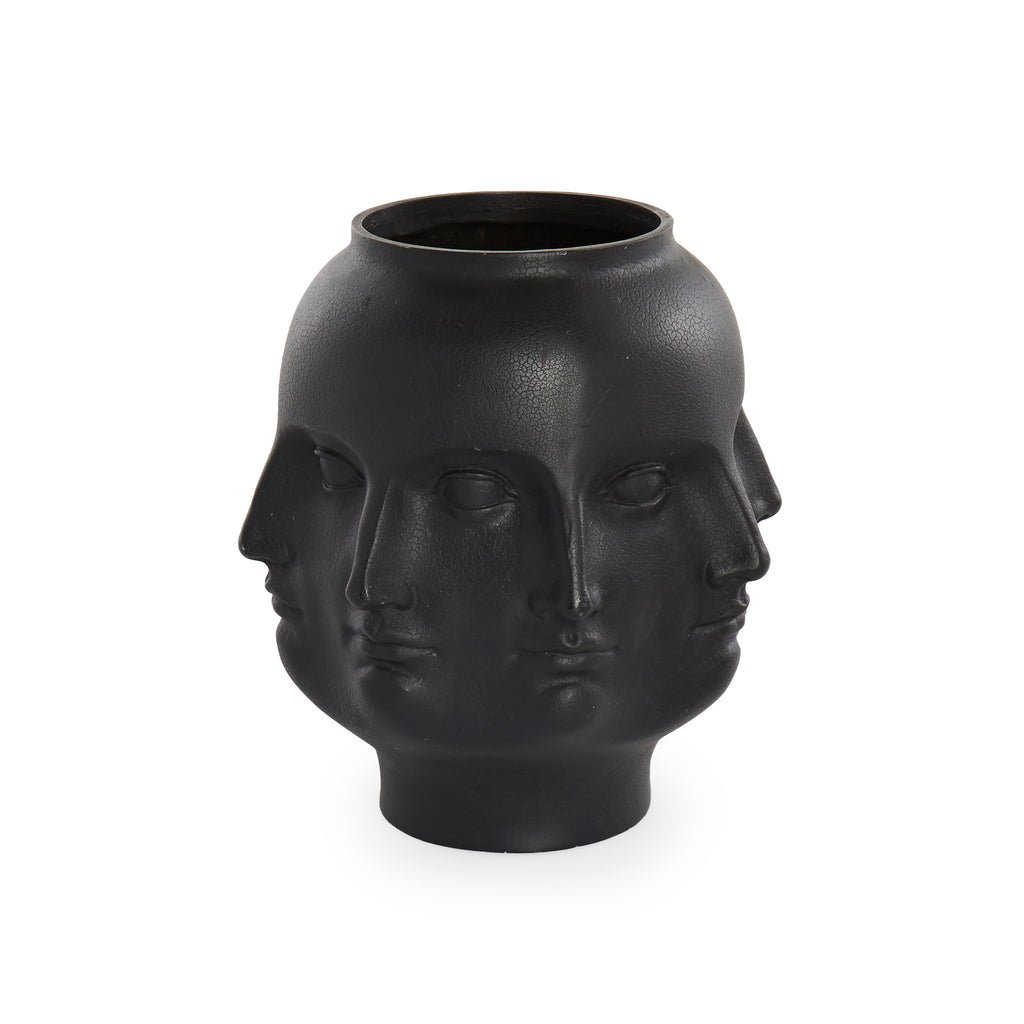Details: Black vase featuring mutliple sculpted faces that blend into one another
