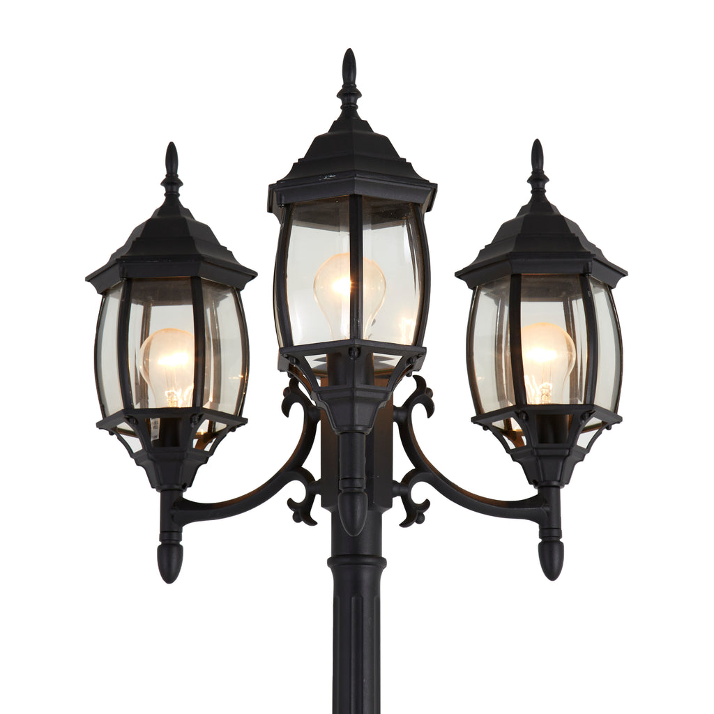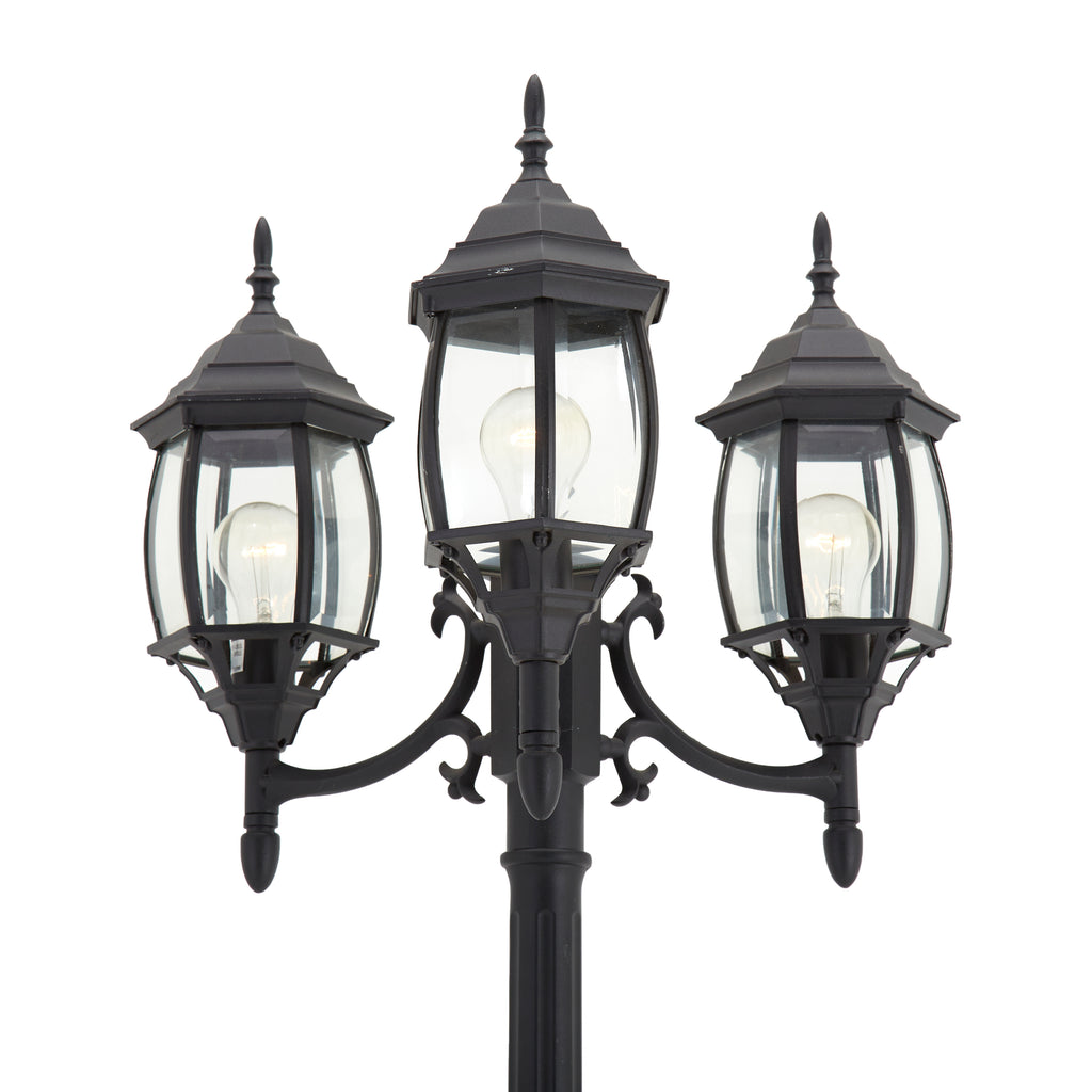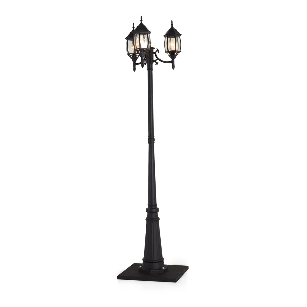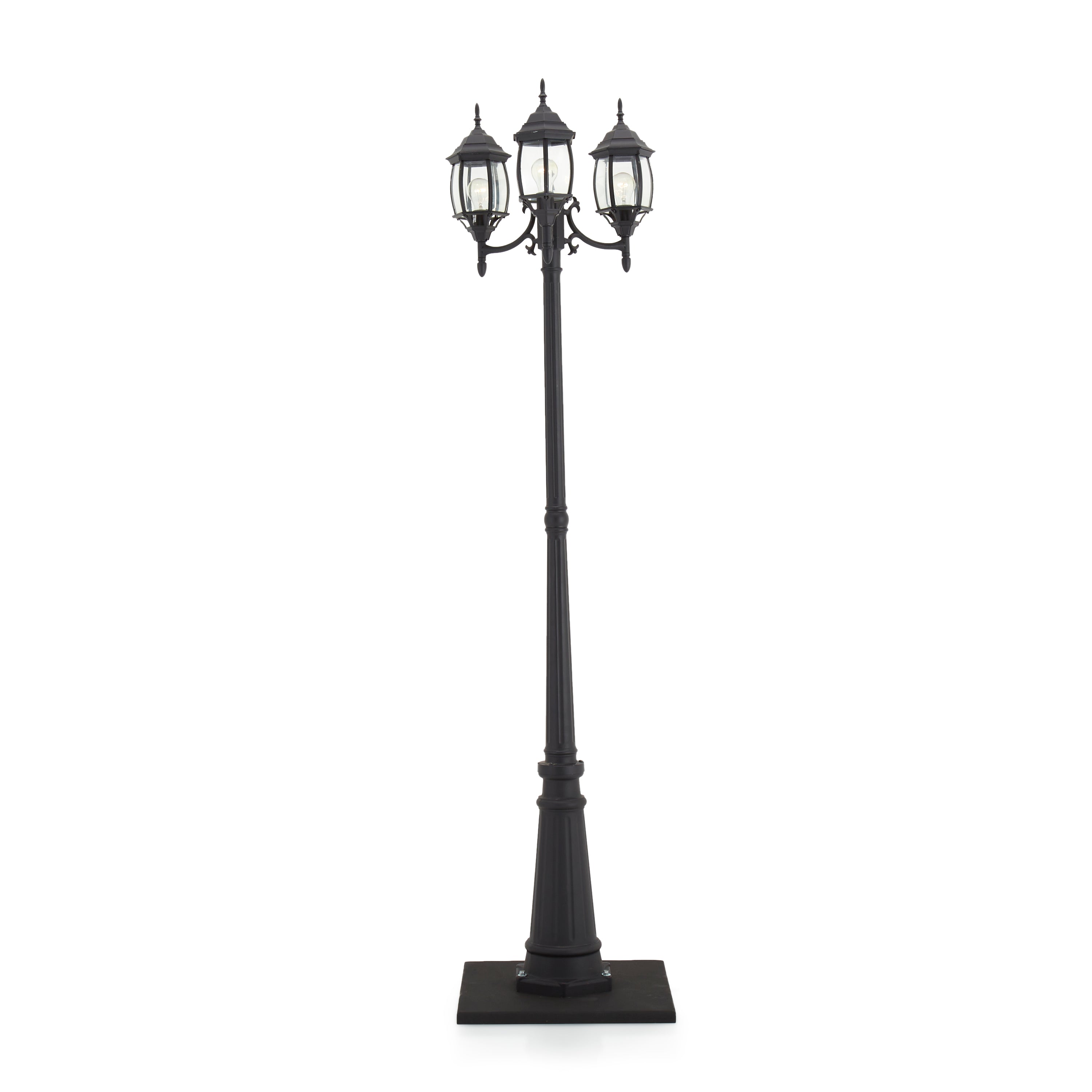 Details: Matte black street lamp with 3 bulbs, square base, and AC adaptor