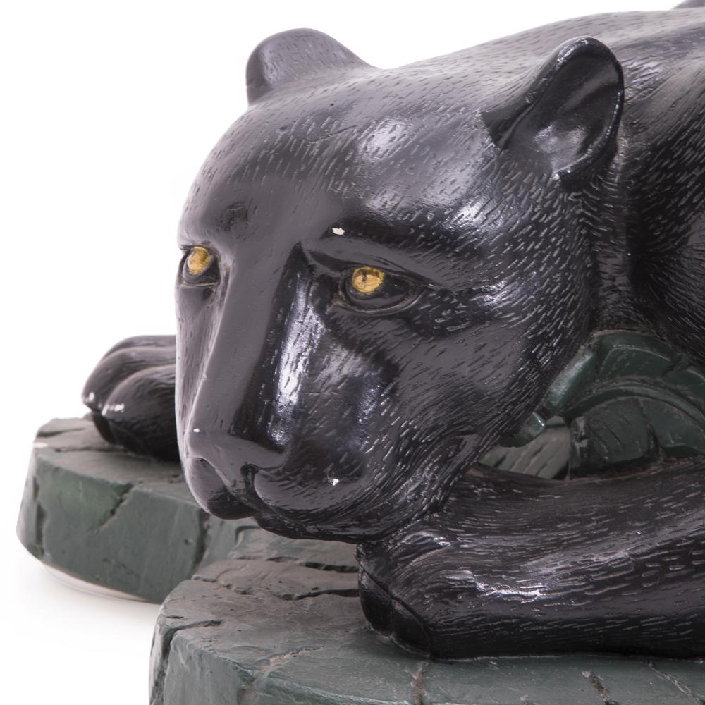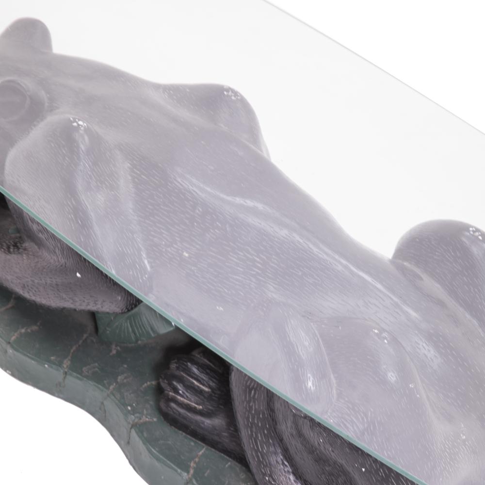 Details: Rounded rectangular glass top table with black panther sculpture base