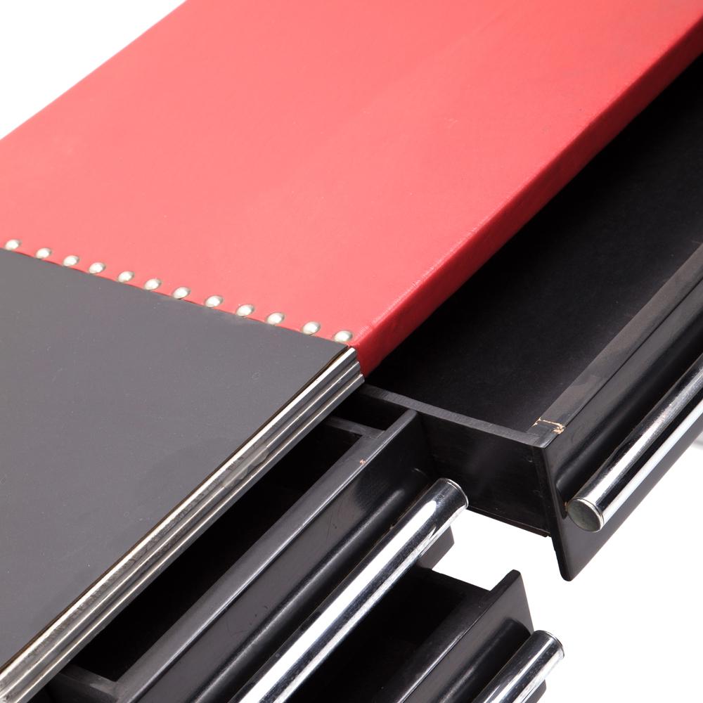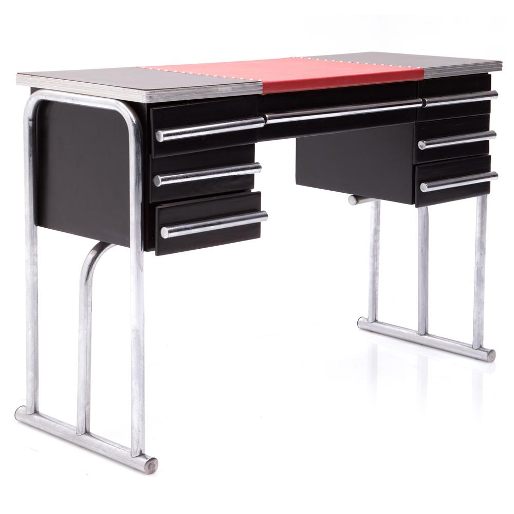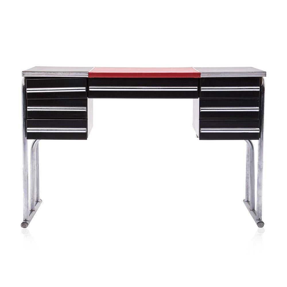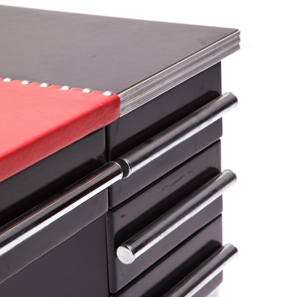 Details: Black, red, and chrome Art Deco desk with chrome frame, multiple drawers, and tubular handles