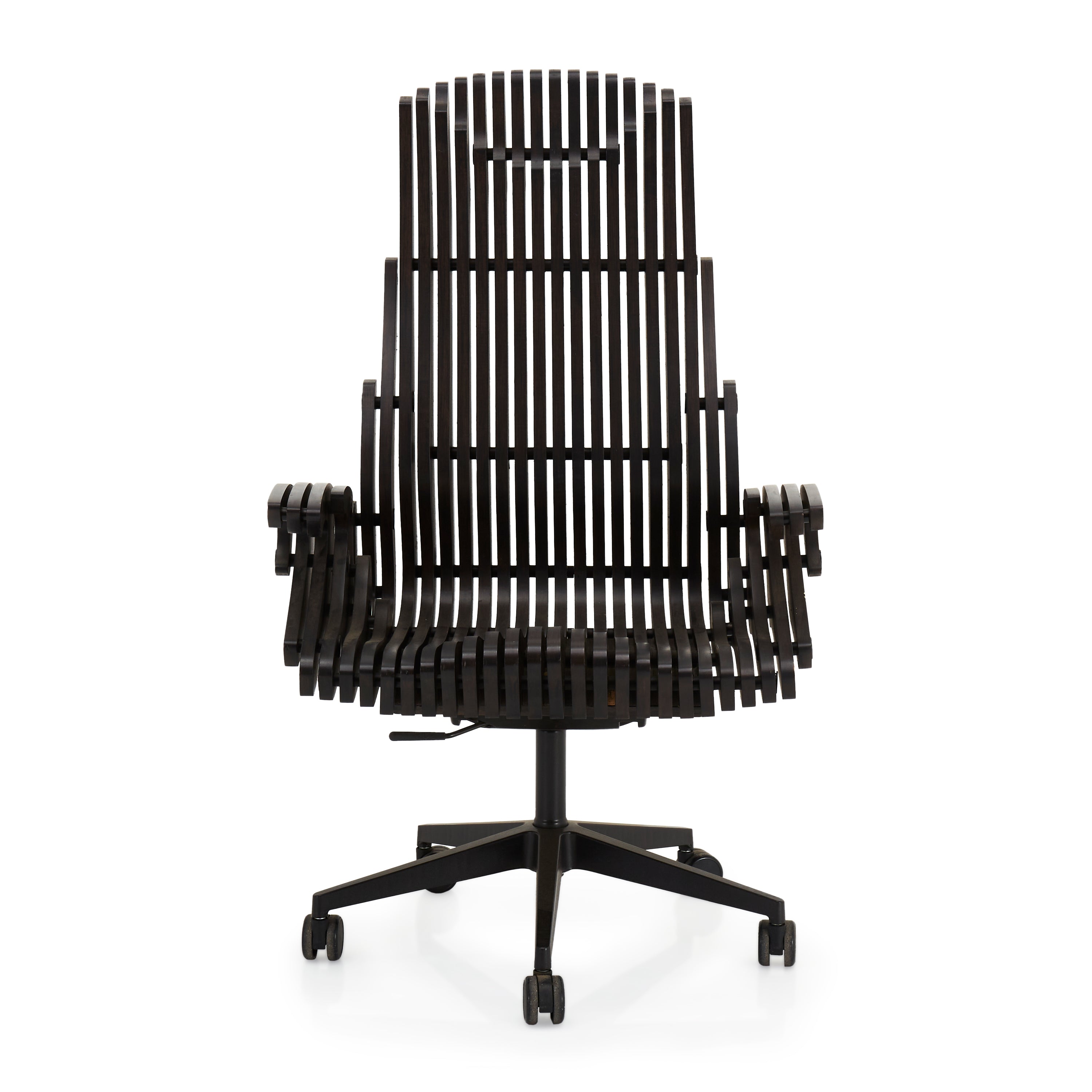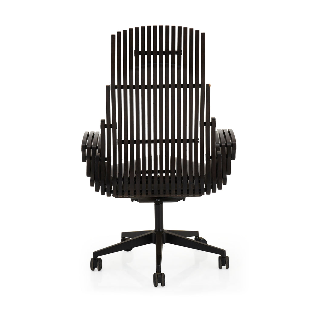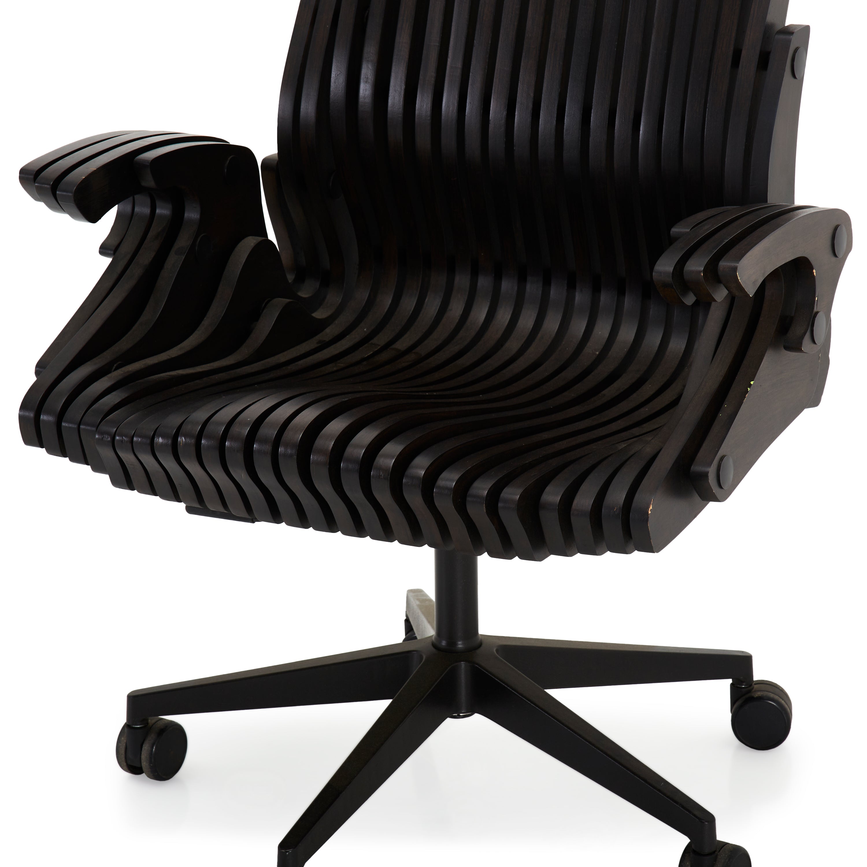 Details: Slatted black wood office chair with arm rests, metal legs, and plastic wheels