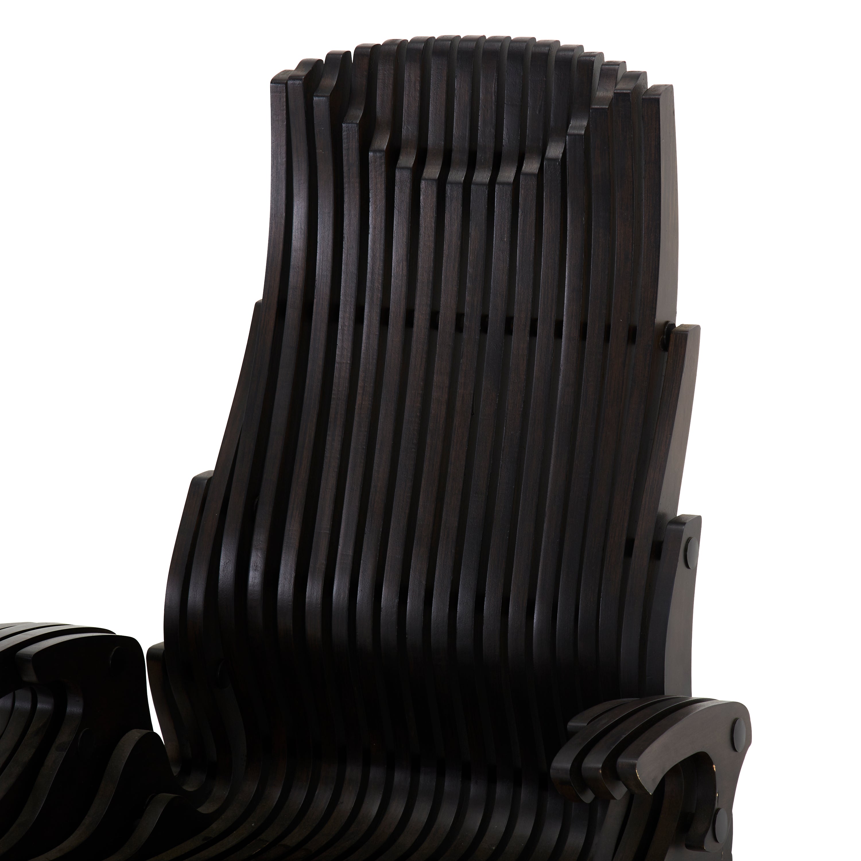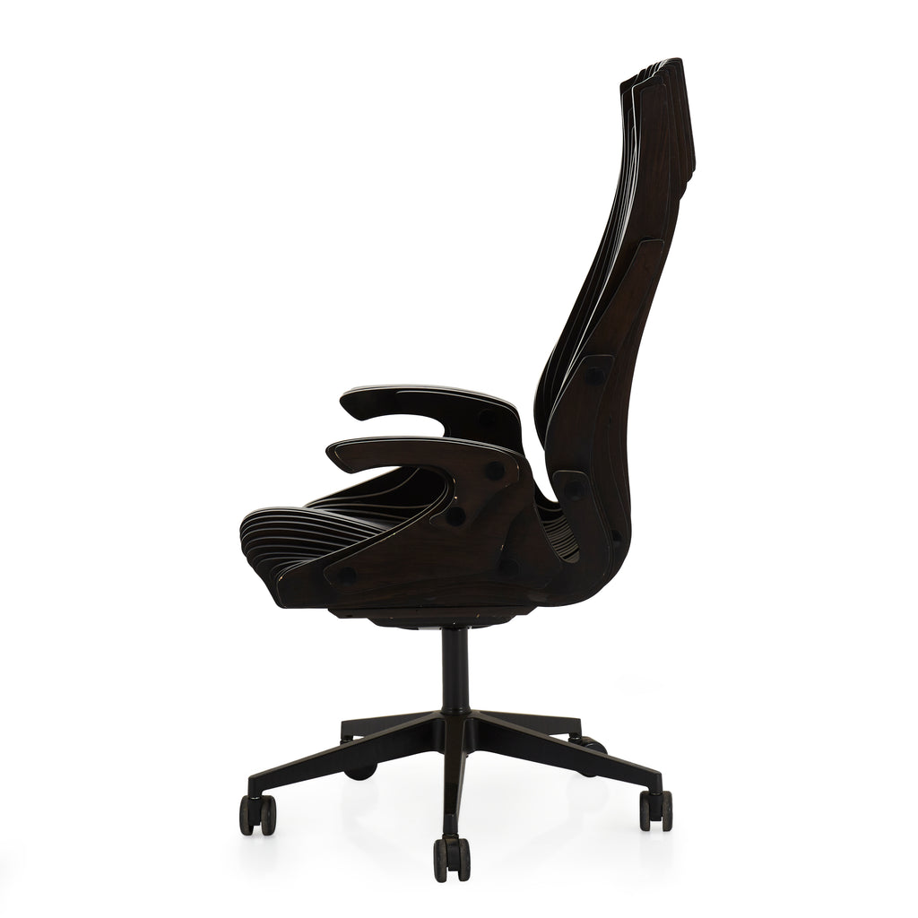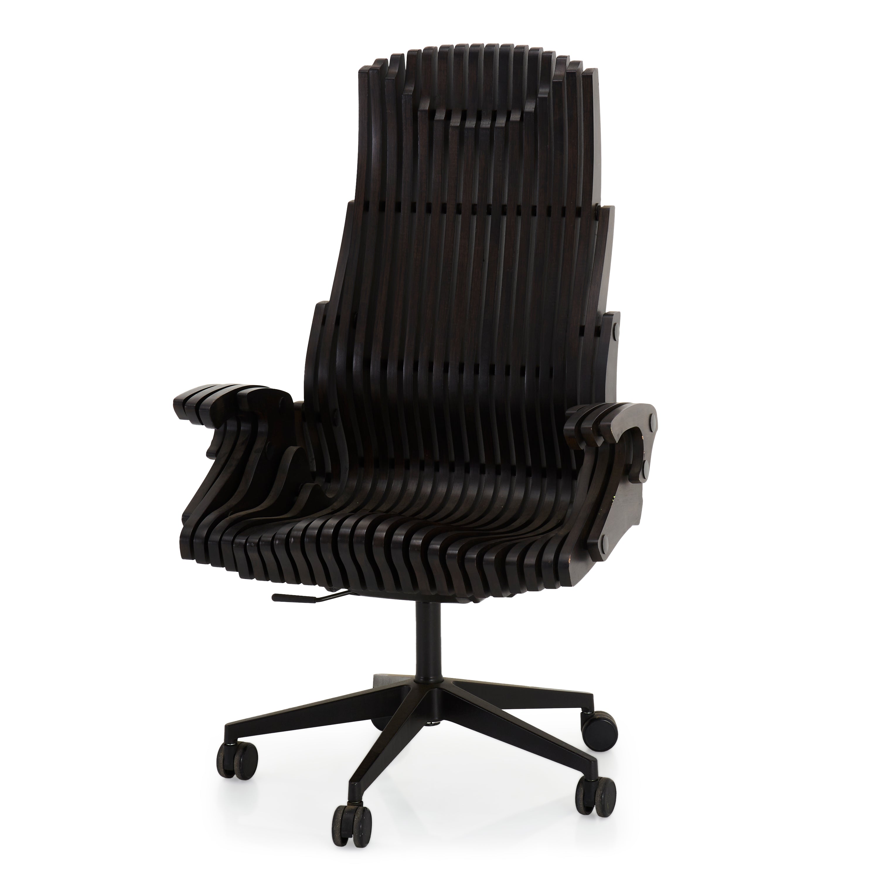 Details: Slatted black wood office chair with arm rests, metal legs, and plastic wheels