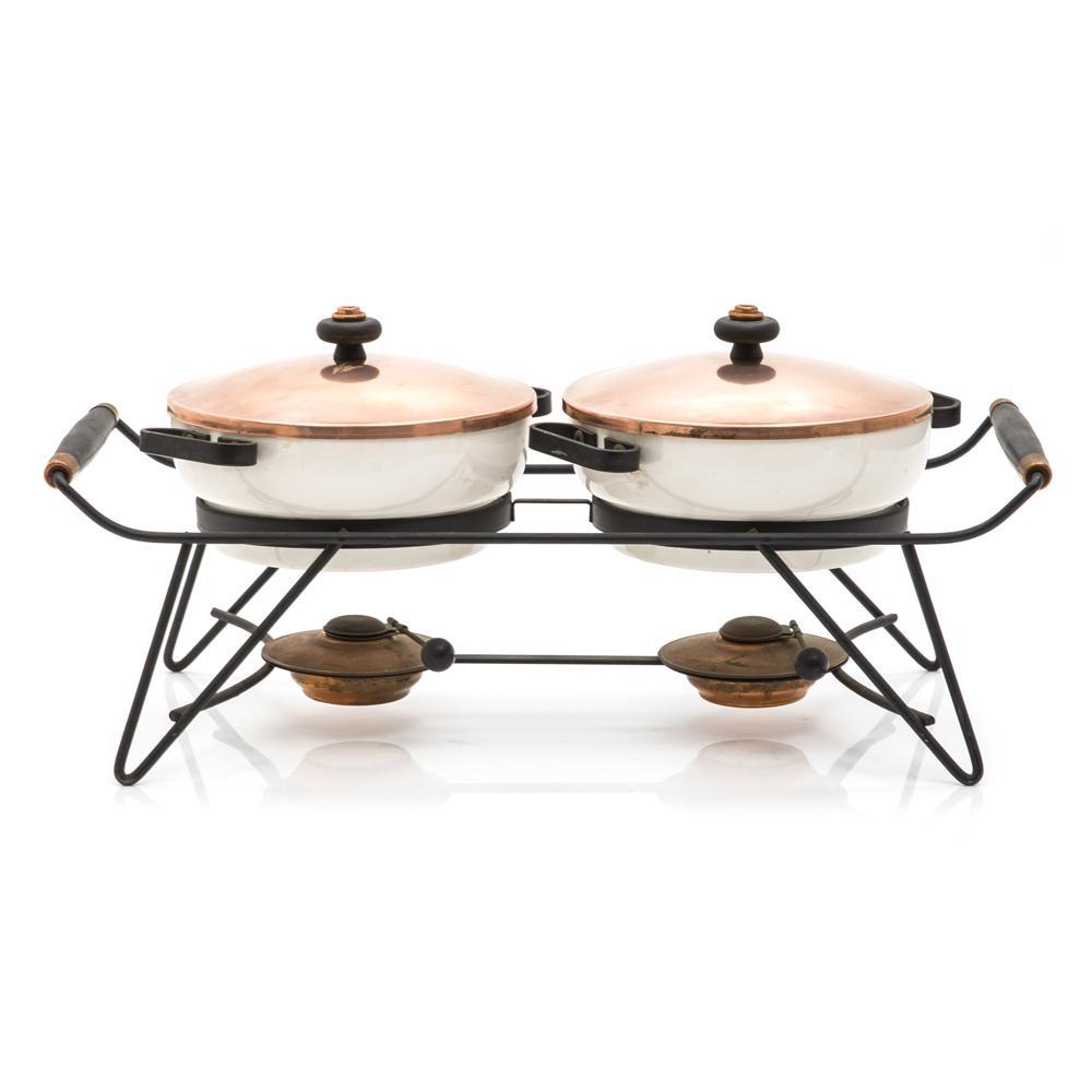 Details: Dual set of fondue pots with heaters on wire rack and pots with copper lids