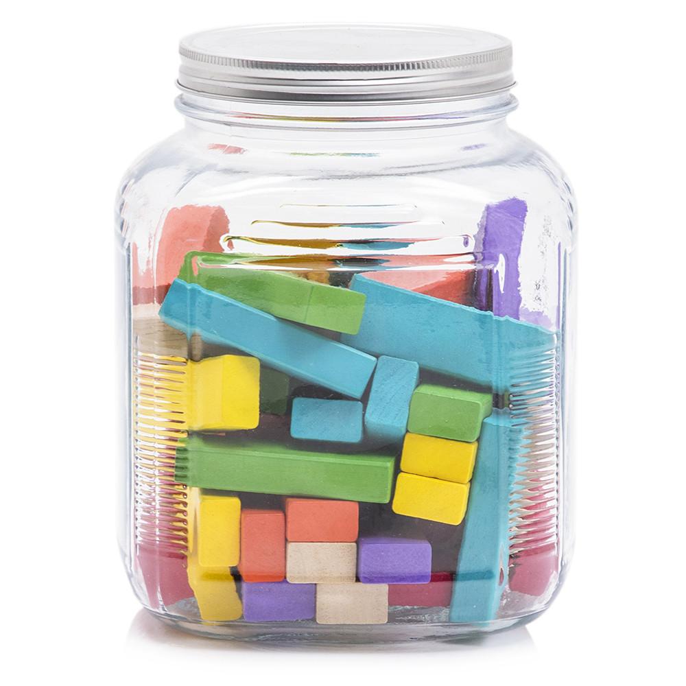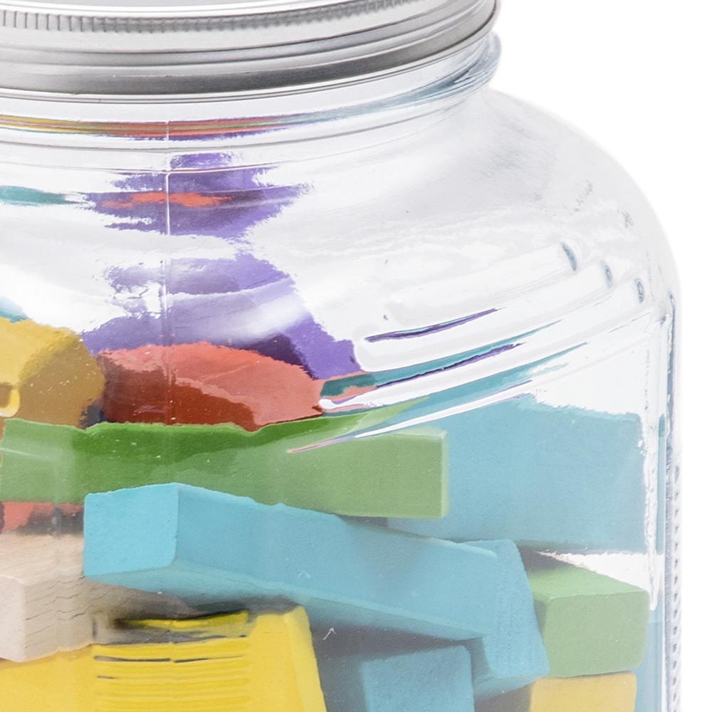 Details: Multicolored blocks in a glass jar.