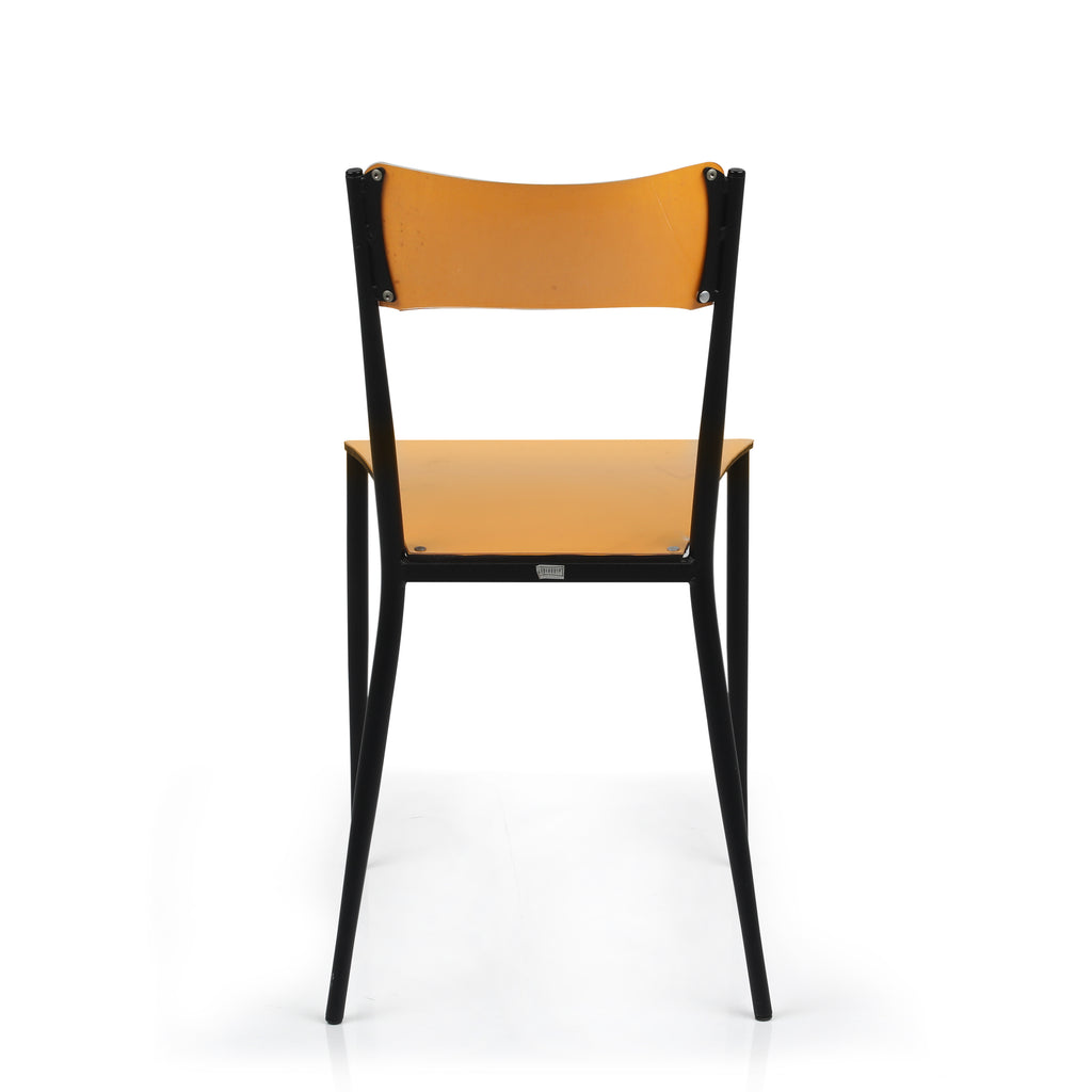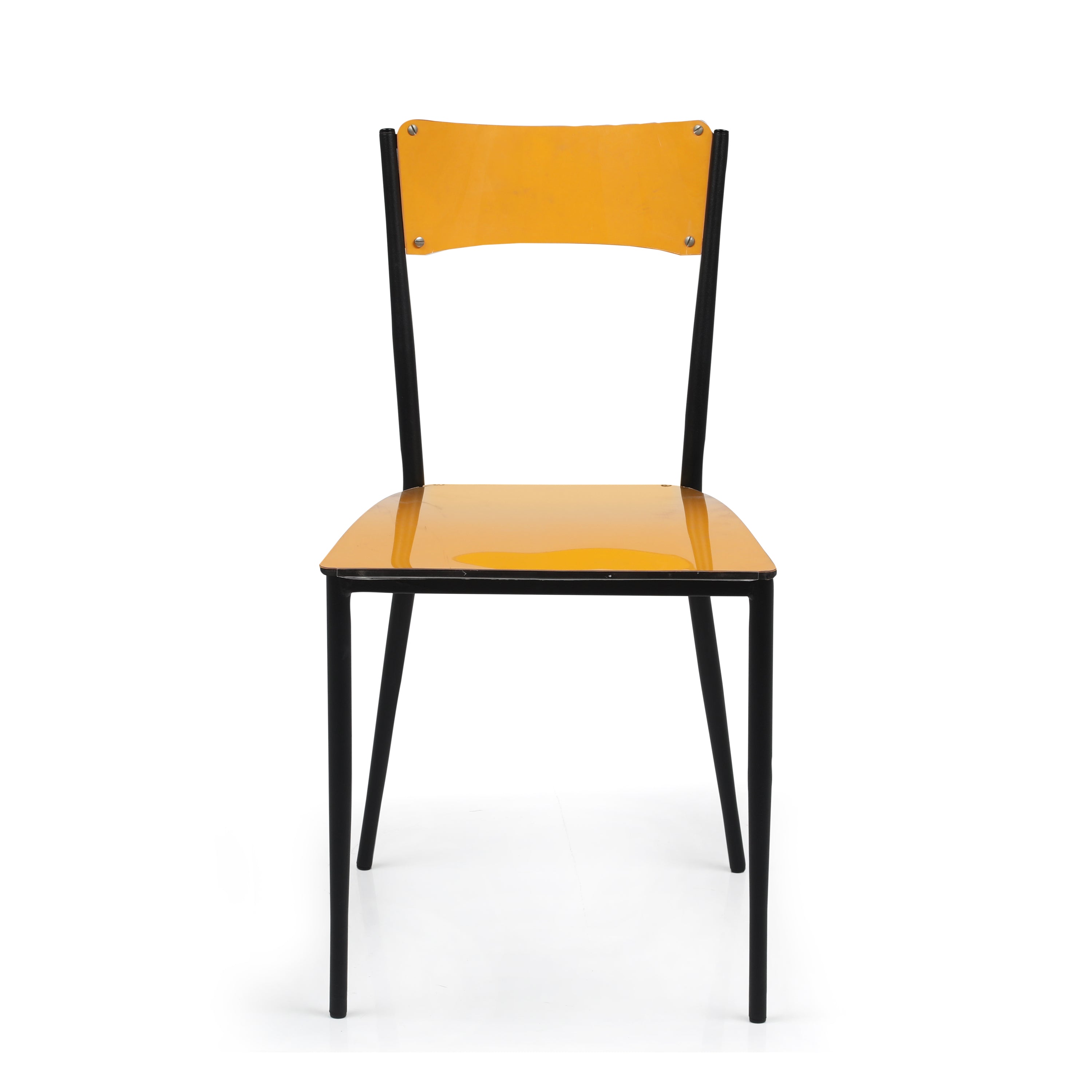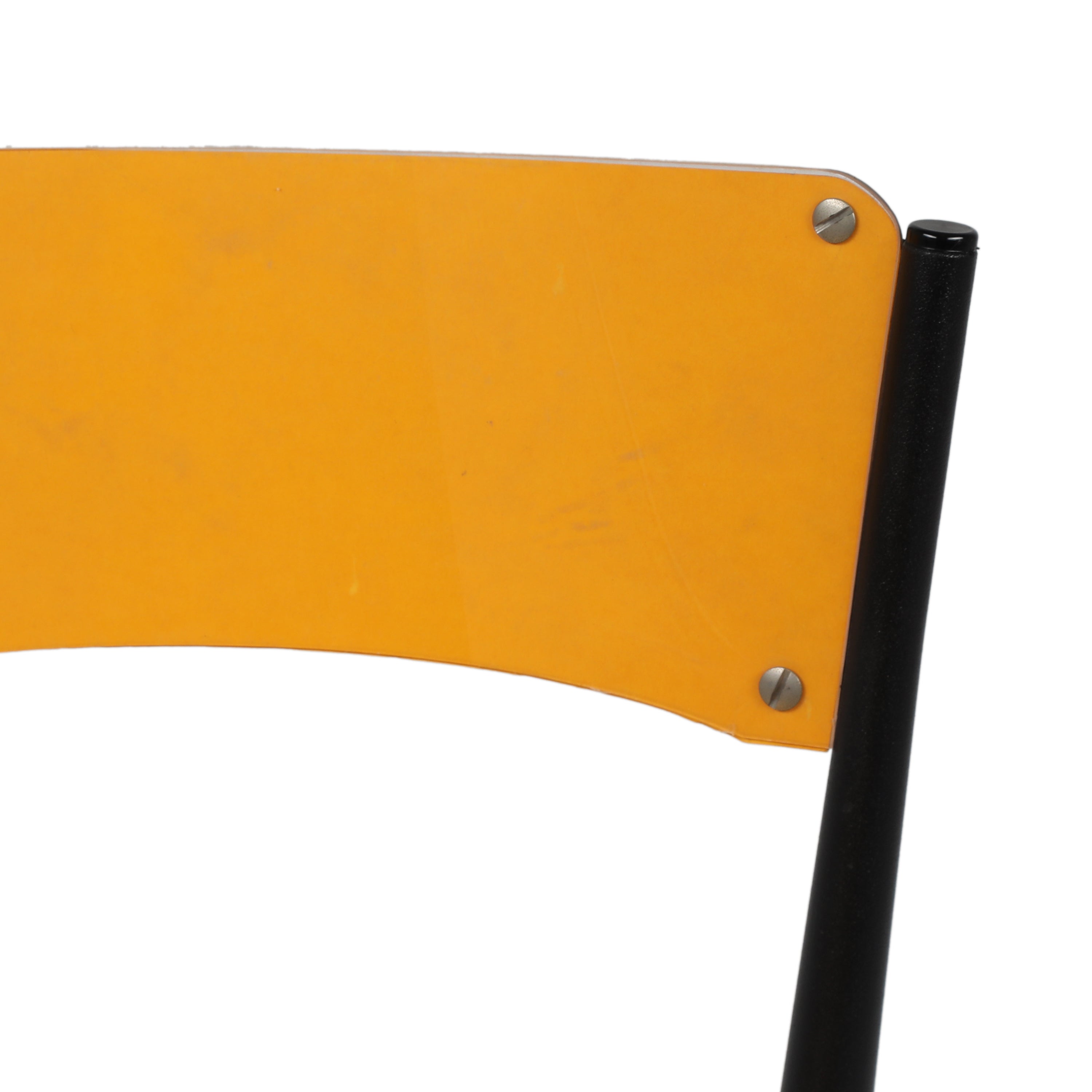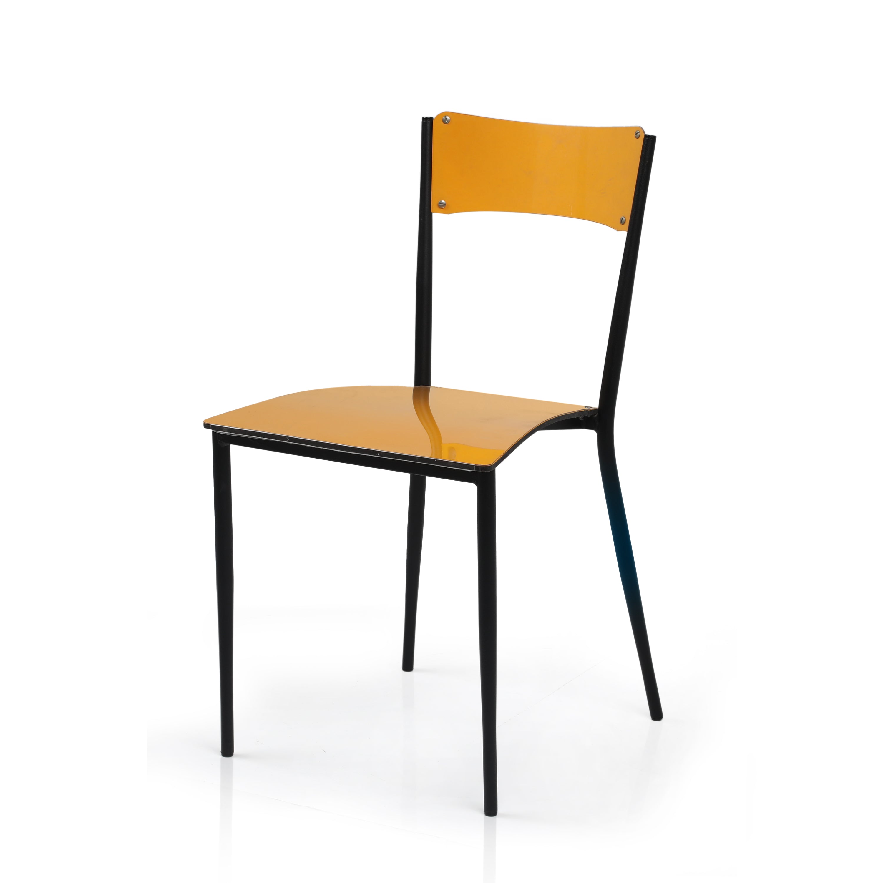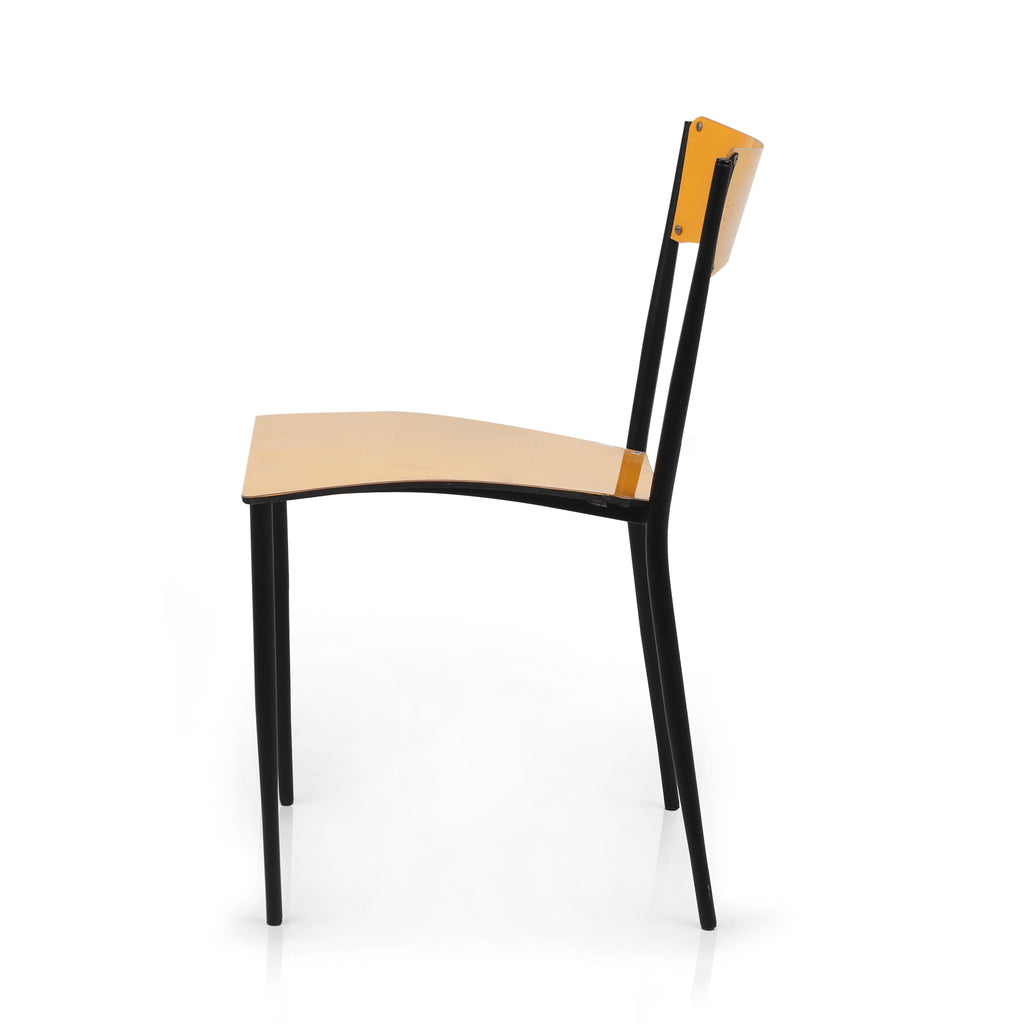 Details: Simple acrylic dinette chair with yellow seat and back. Metal frame.