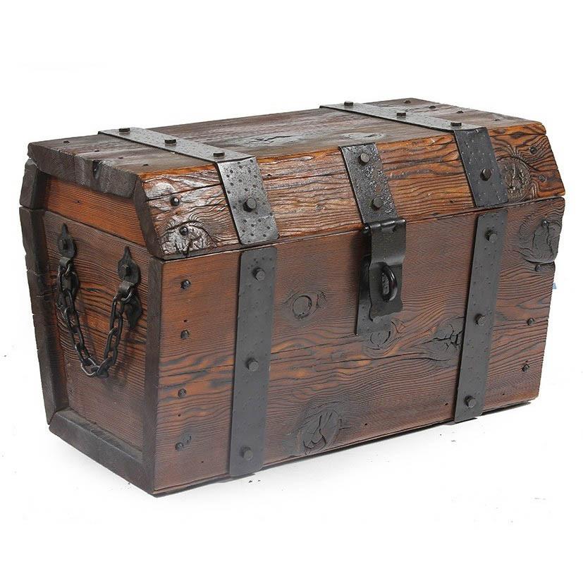 Details: Trunk with dark carved wood in classic treasure chest shape with black hinges, chains, and wrapping.