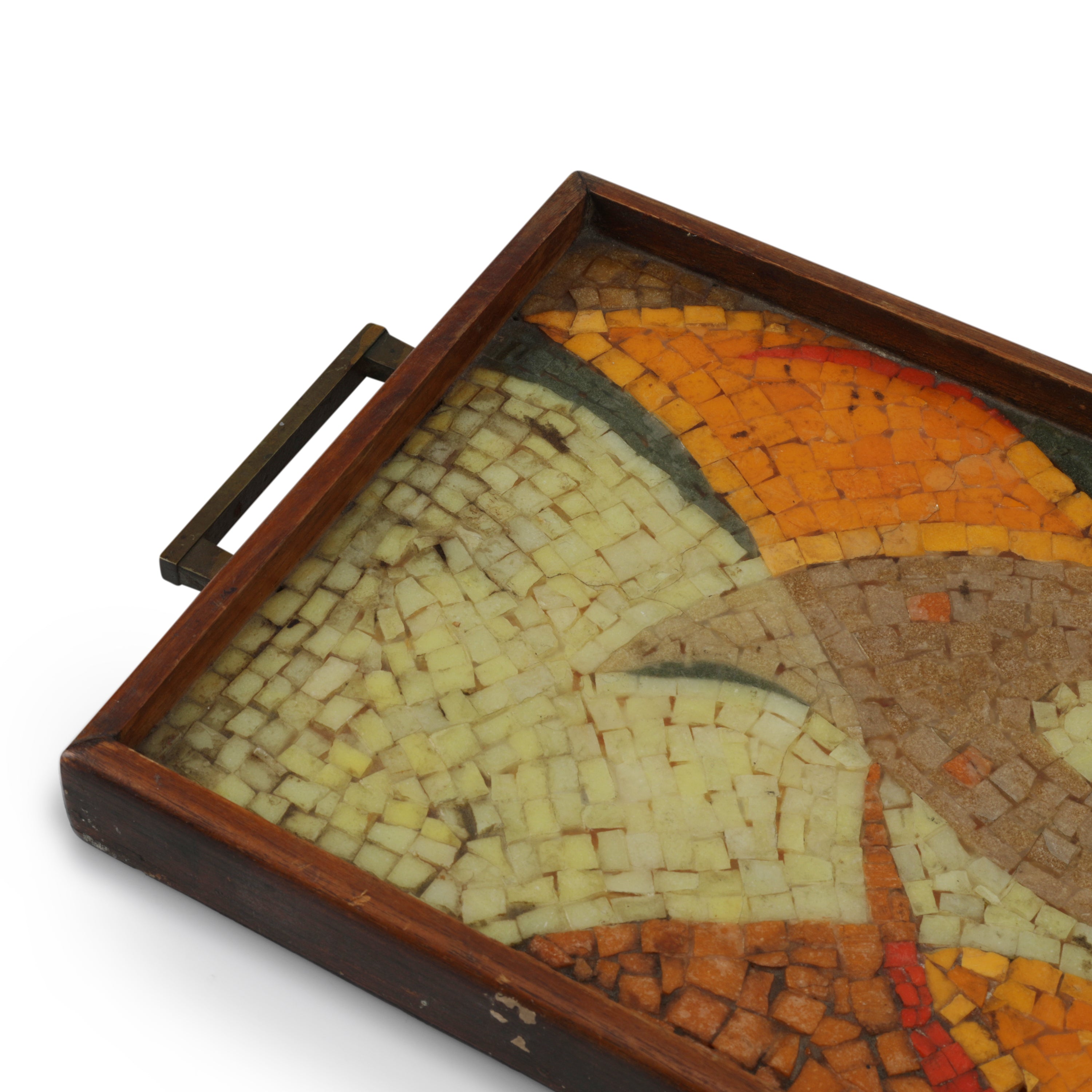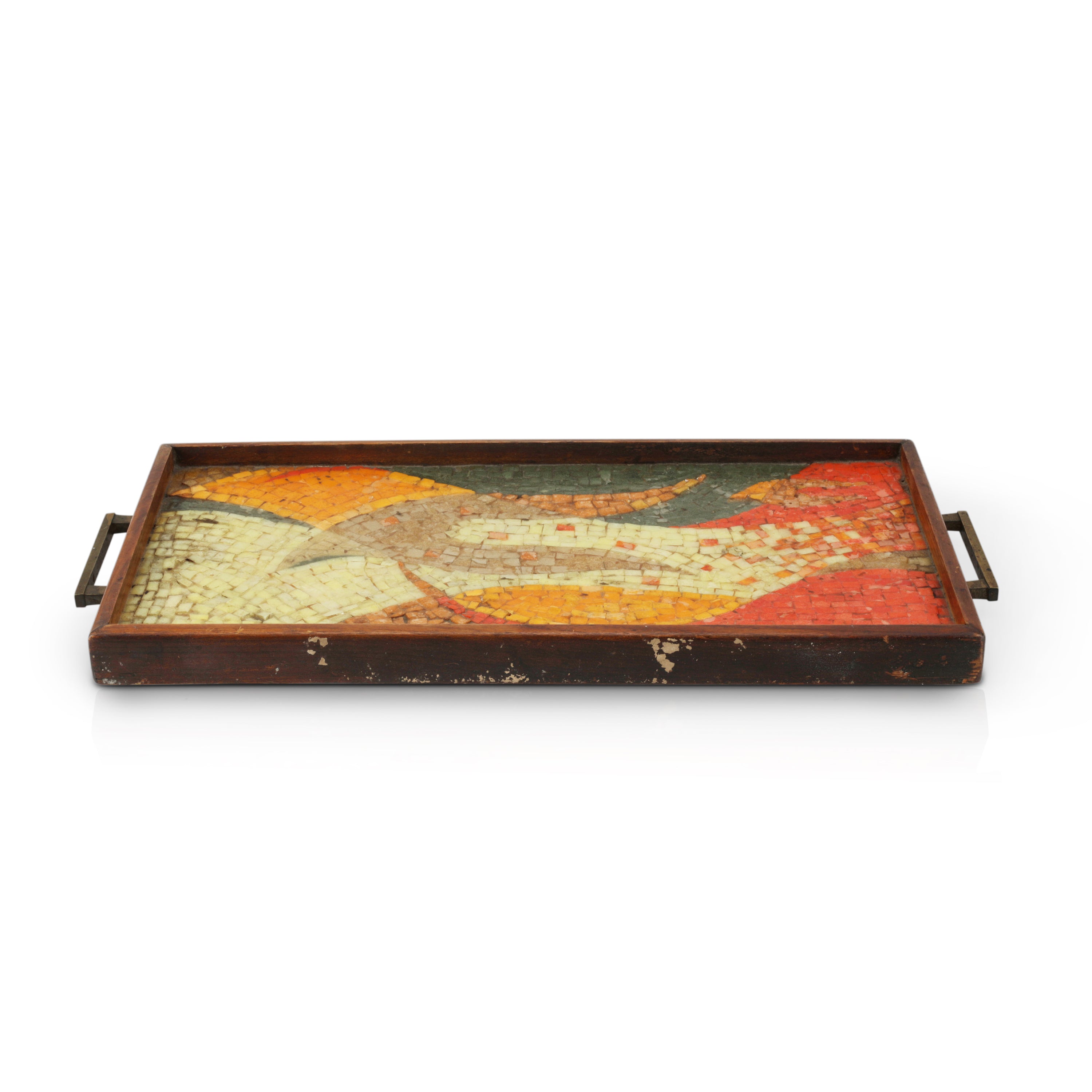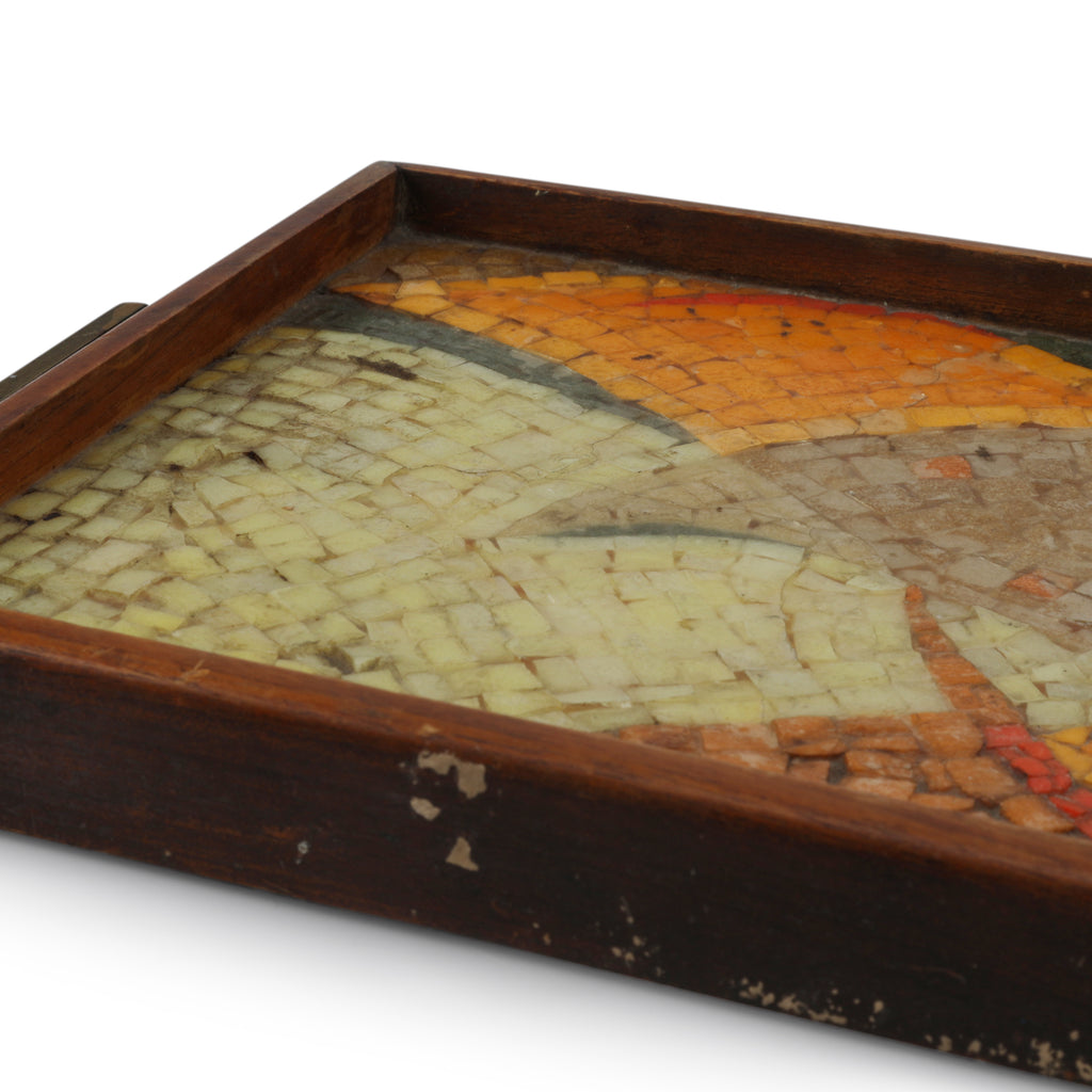 Details: Mosaic decorative tray with worn wooden frame and brass handles.