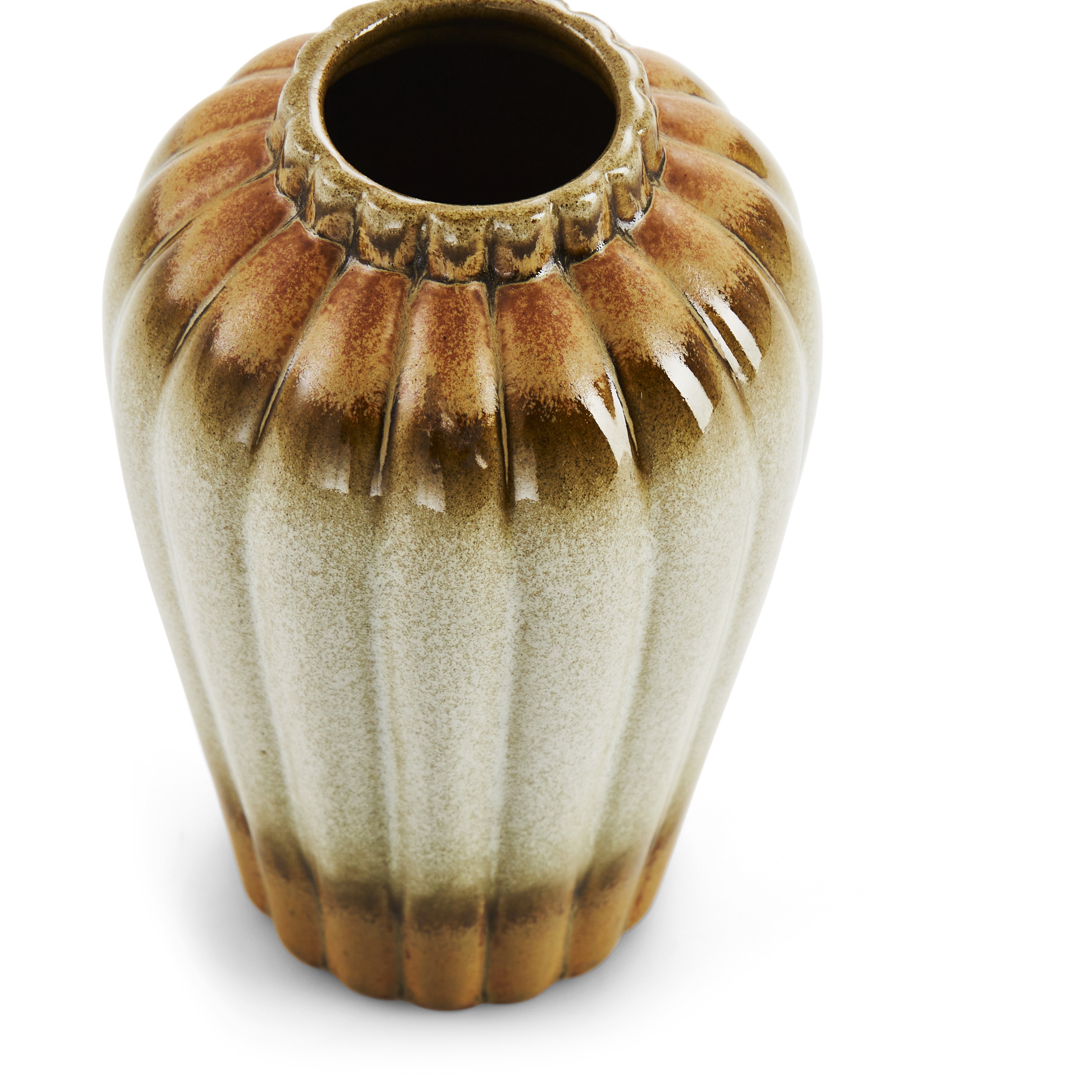 Details: Tapered ceramic vase with fluted texture in natural browns and tans glaze