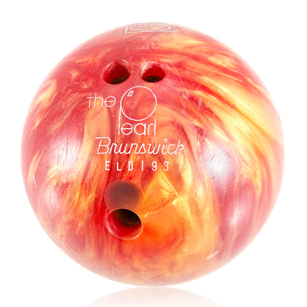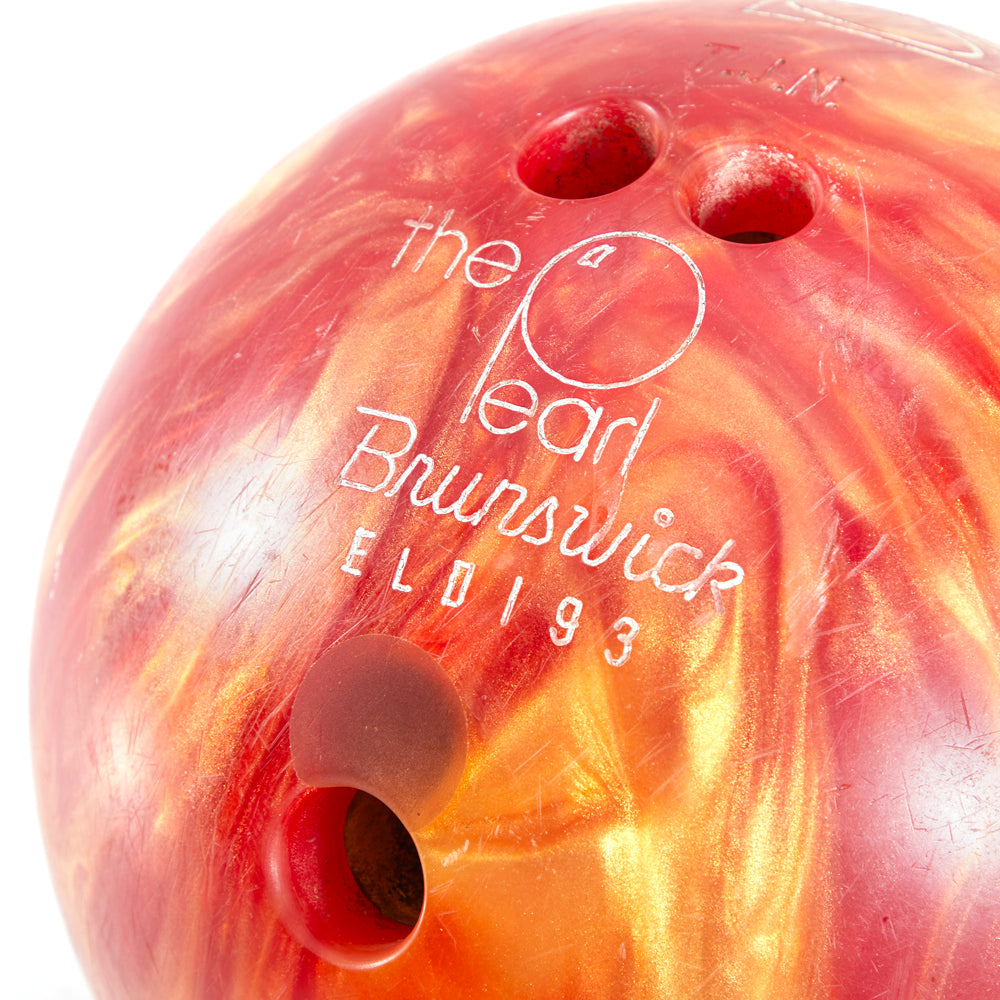 Details: Fire-colored (red, orange marbled) Brunswick 'the Pearl' vintage bowling ball