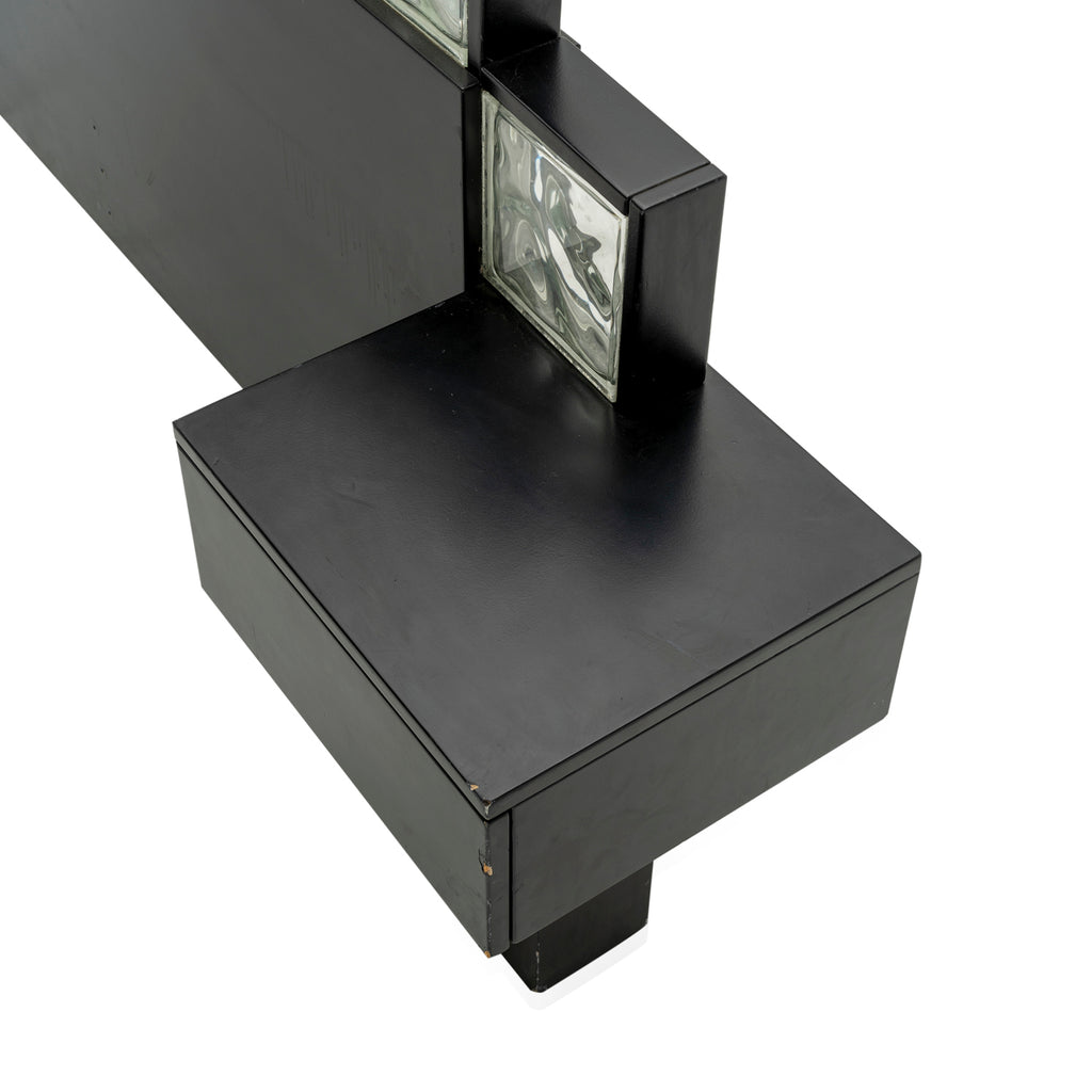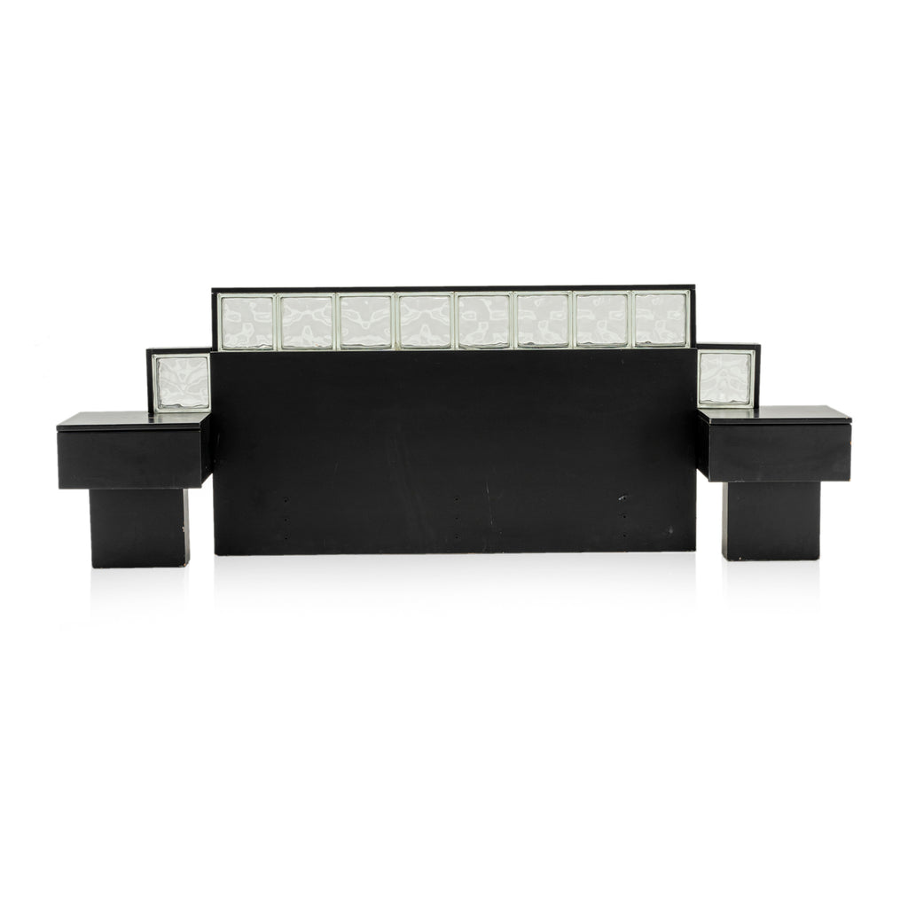 Details: Geometric black painted wood headboard with glass cube border, with attached black 1-drawer side tables on both sides