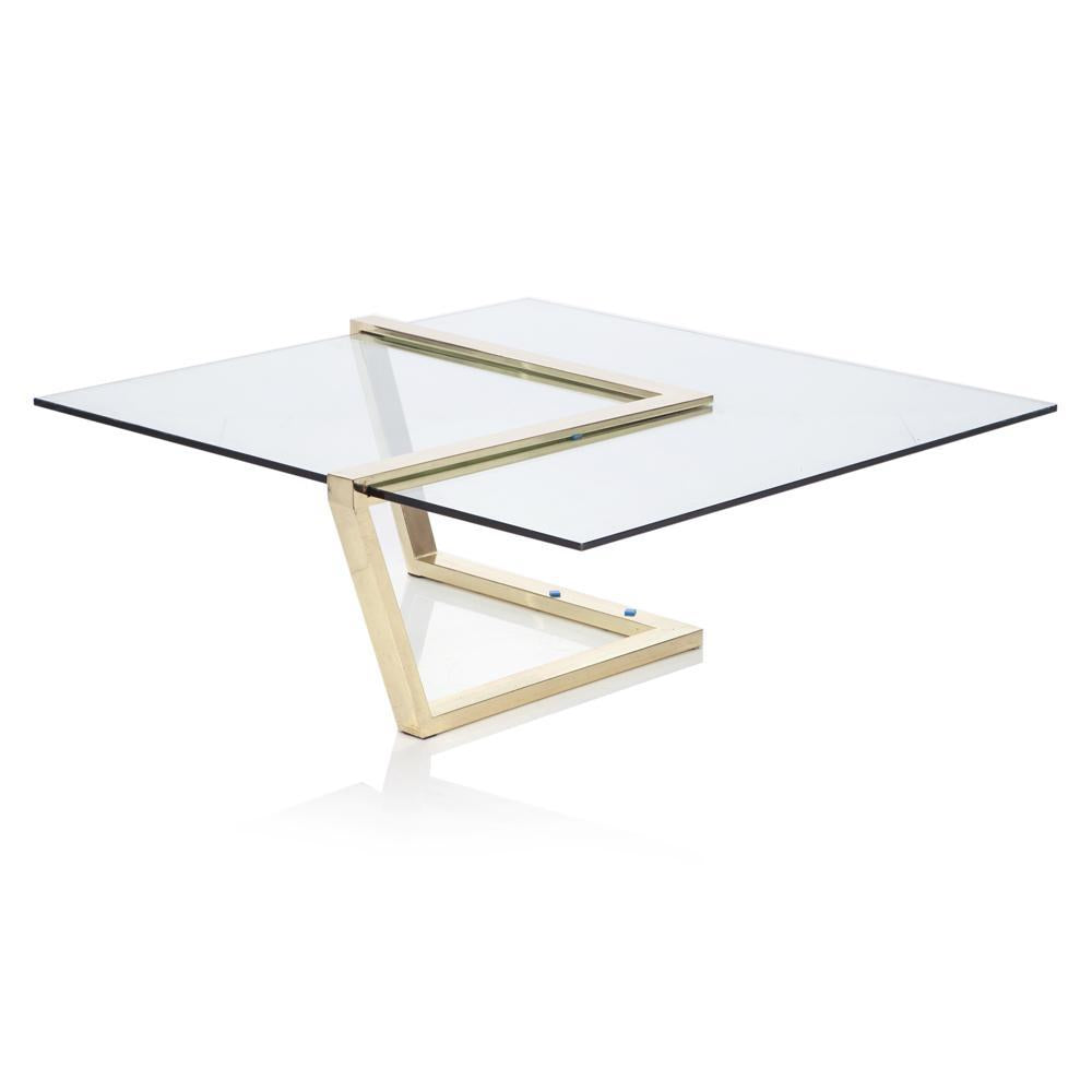 Details: Square table with glass top and golden frame in a zig-zag design