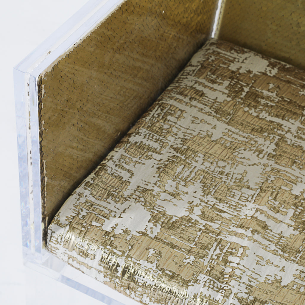Details: Gold sequin embedded in lucite. White / gold cushion.