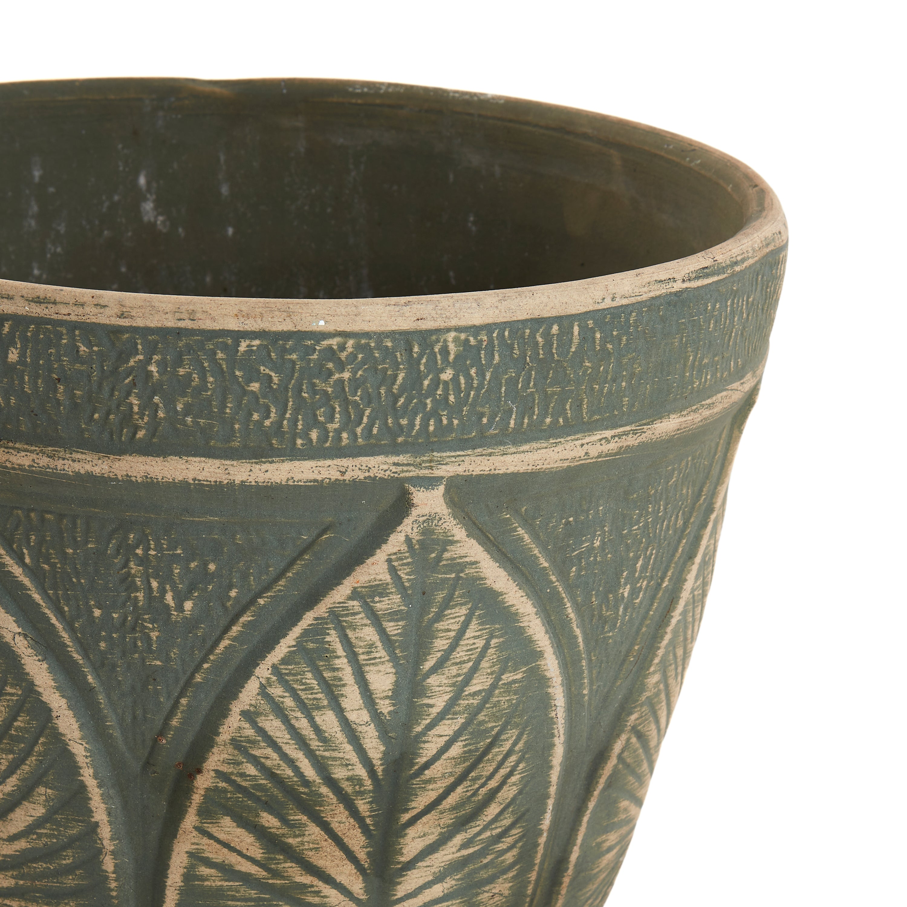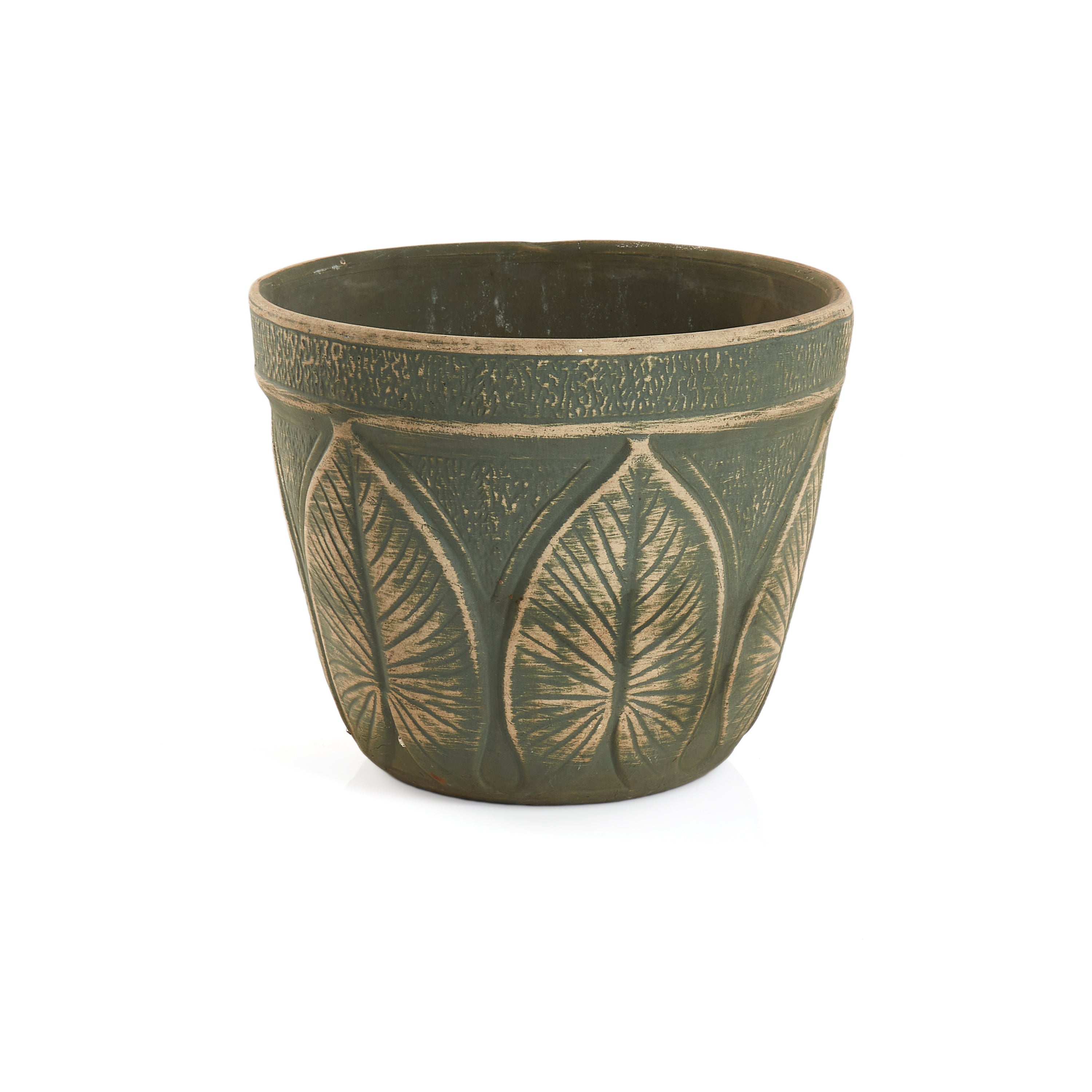 Details: Medium-sized olive green ceramic planter with leaf designs around exterior