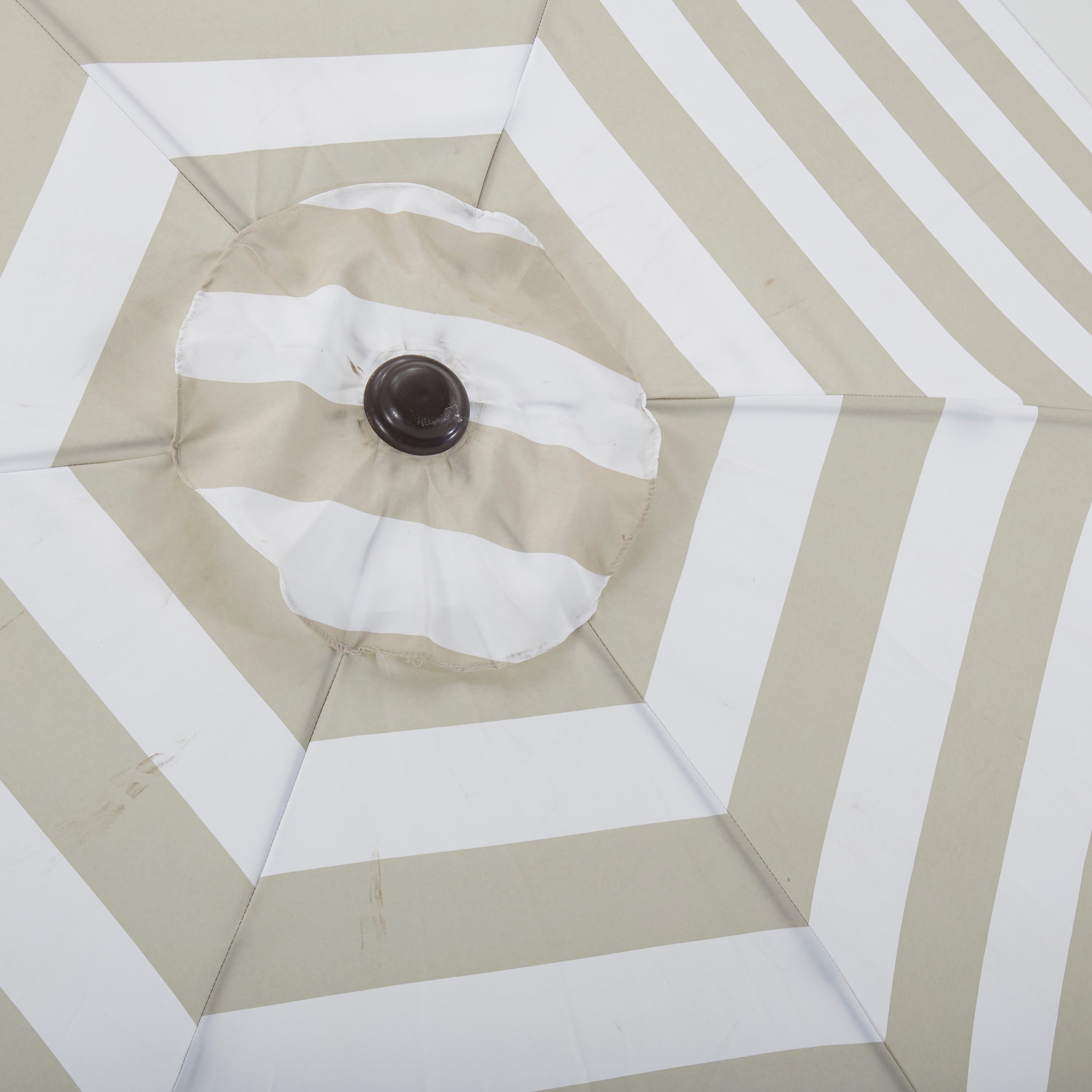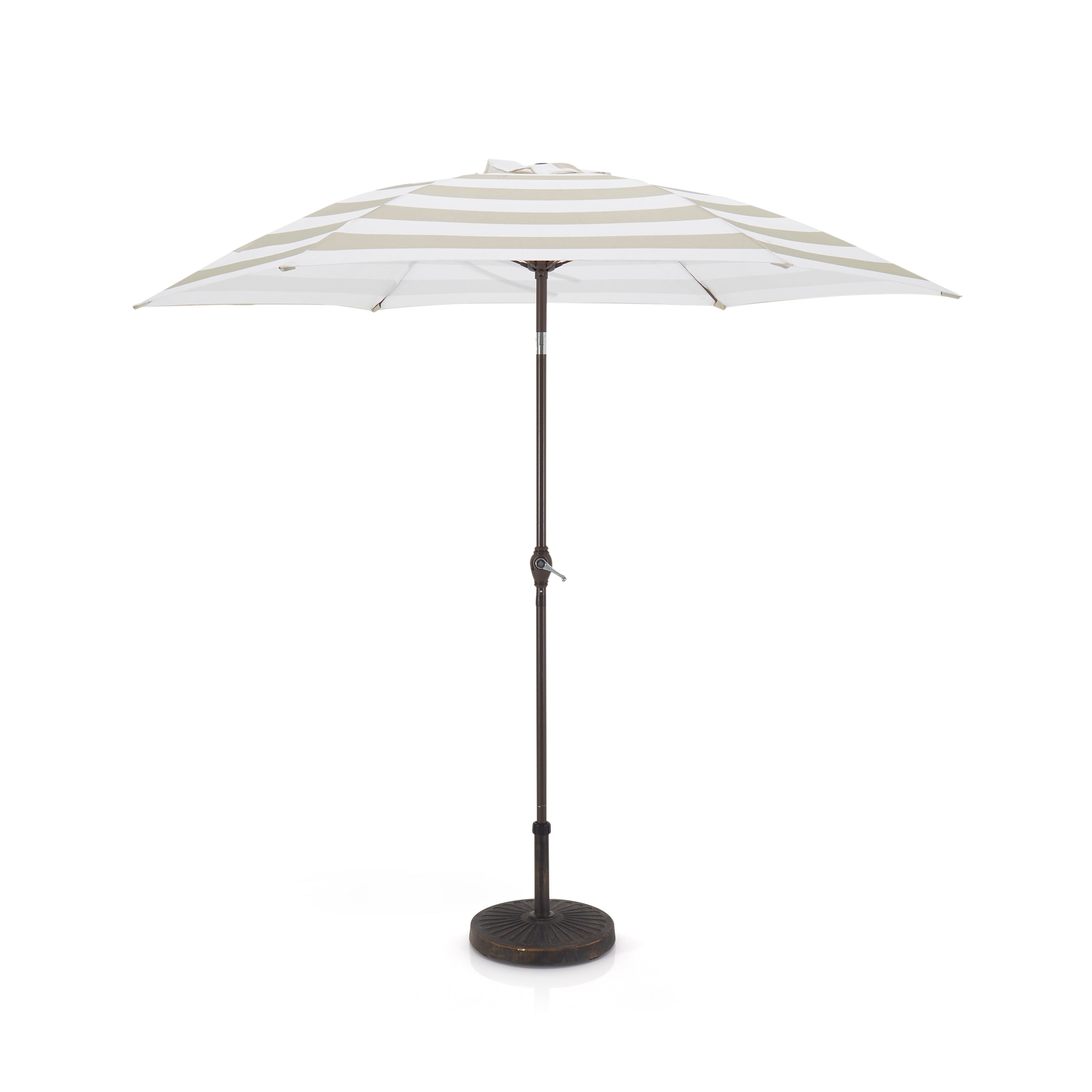 Description: Gray and white striped outdoor patio umbrella with black metal stand.