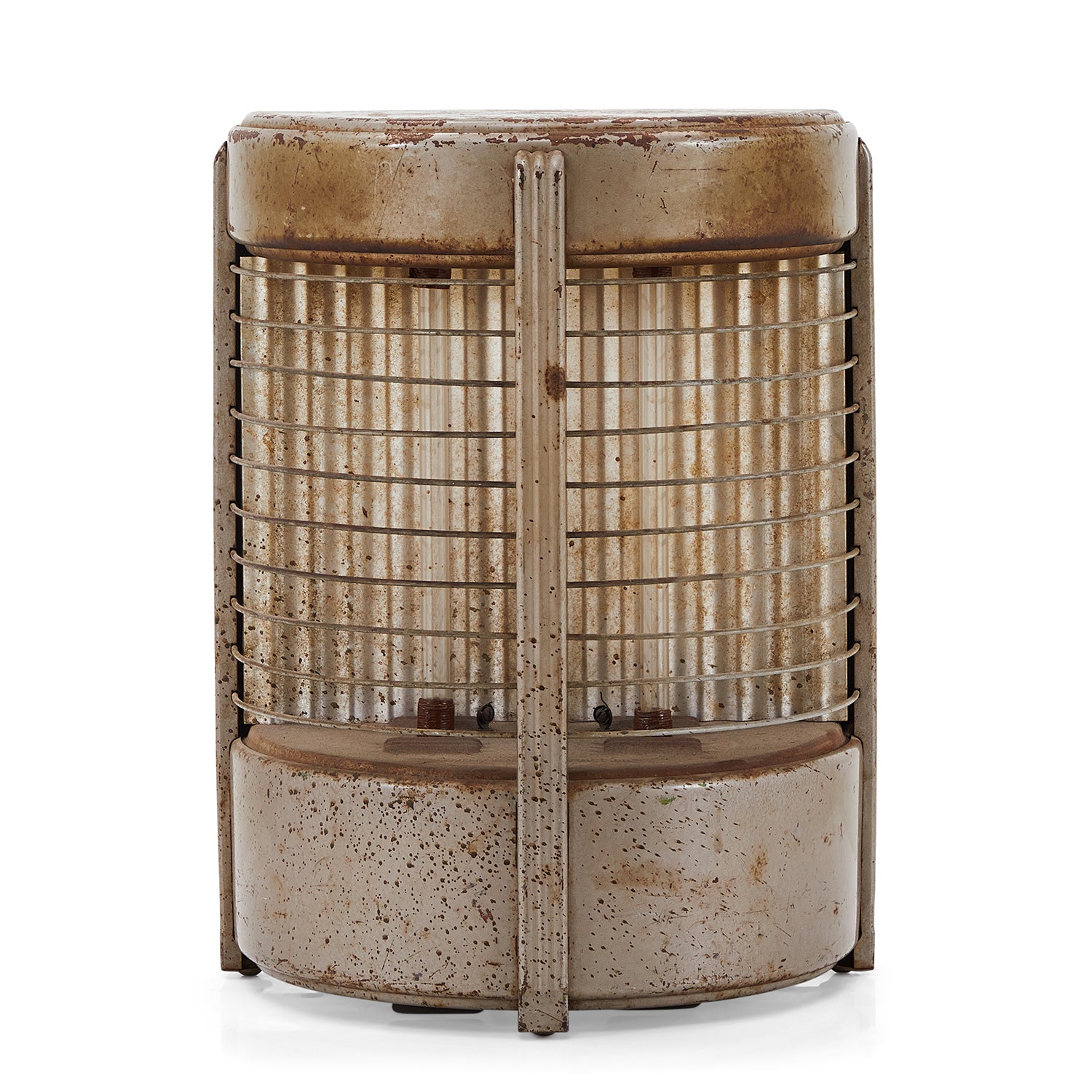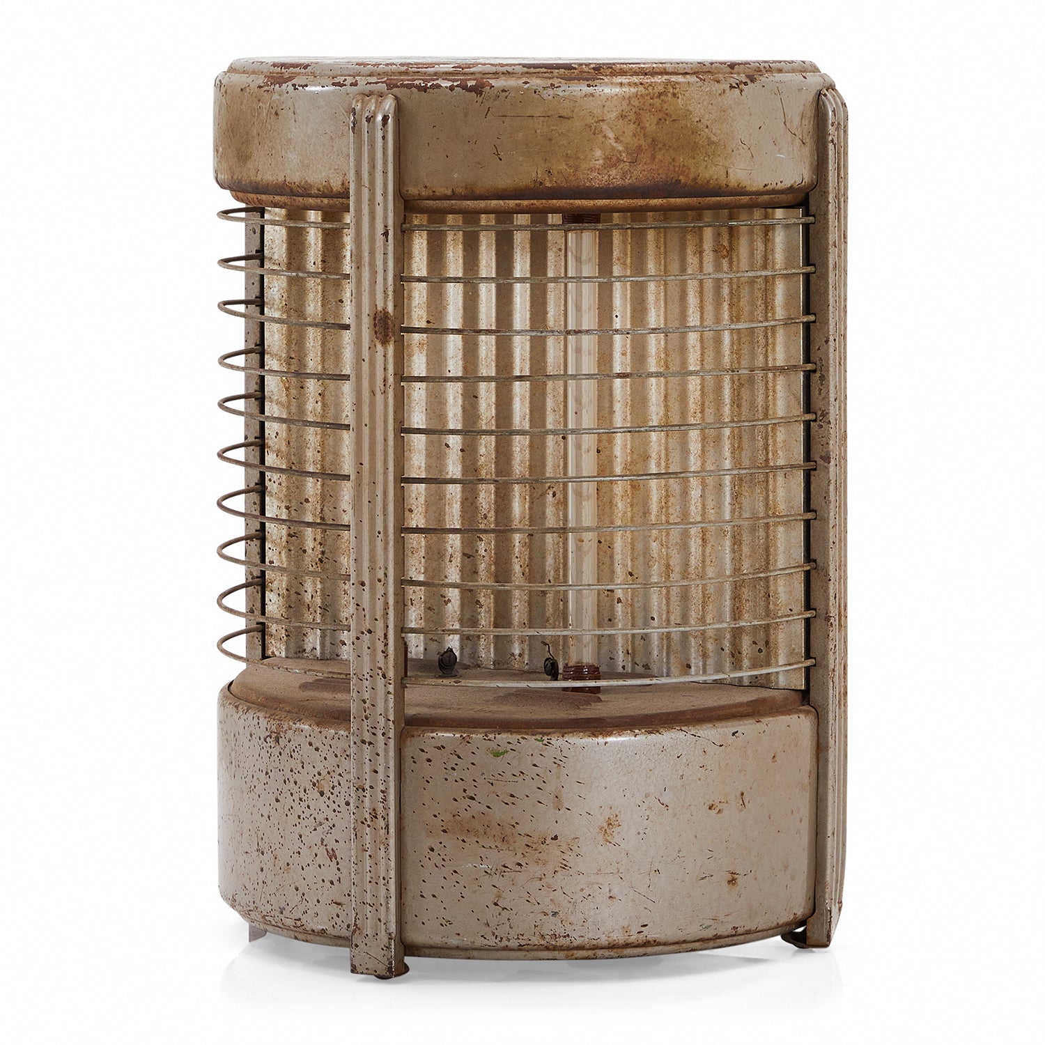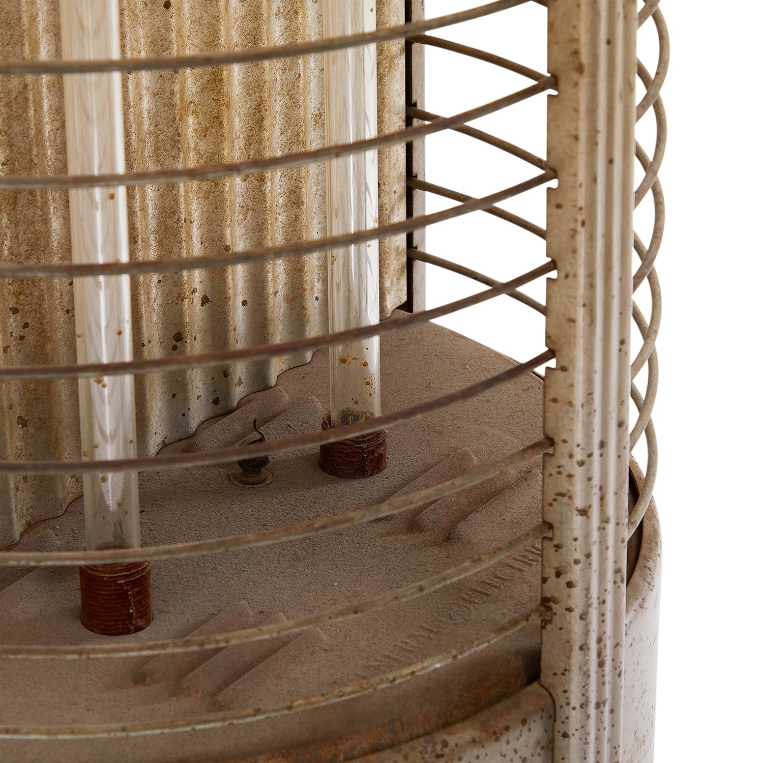 Details: Vintage space heater with semi-cylindrical shape and signs of rust and age