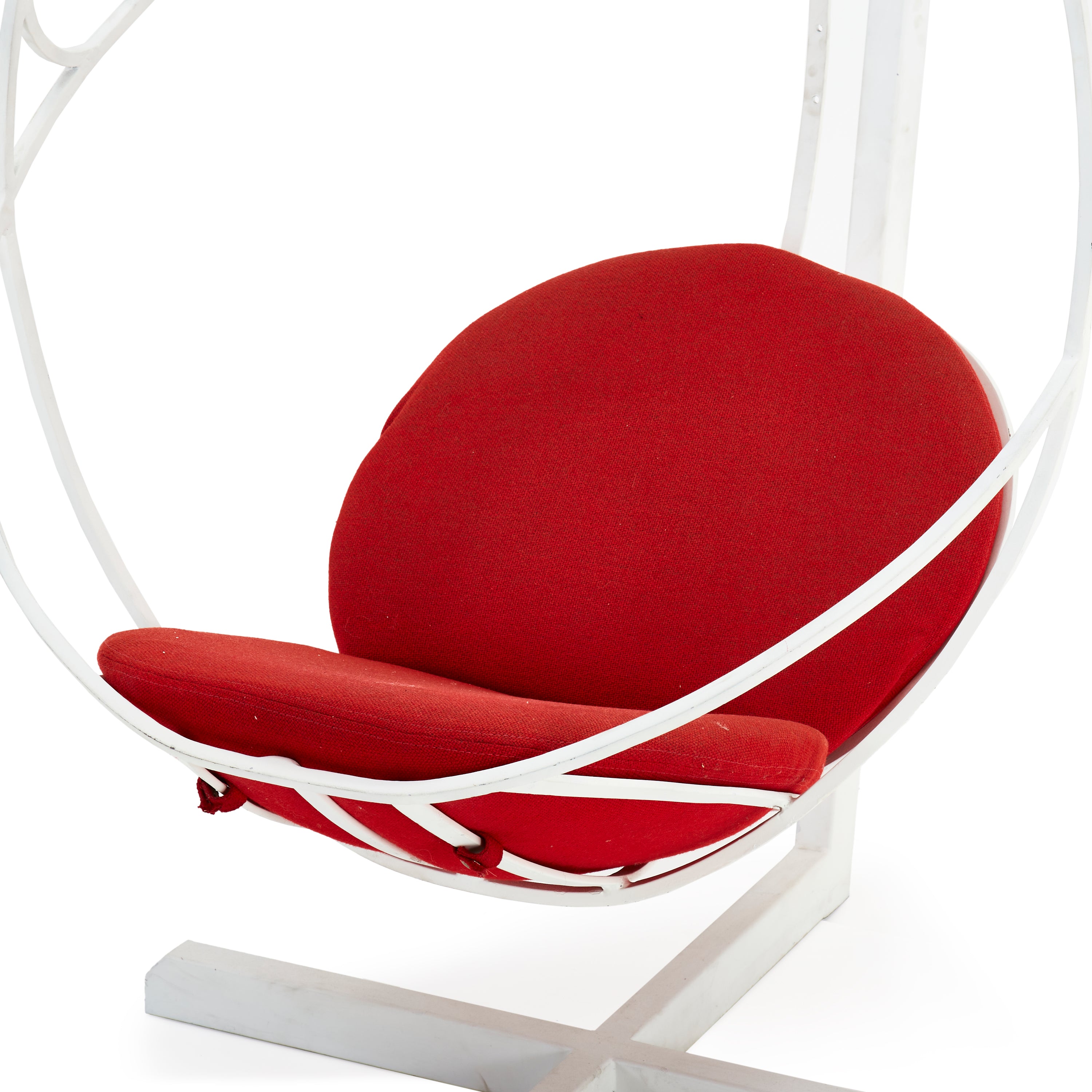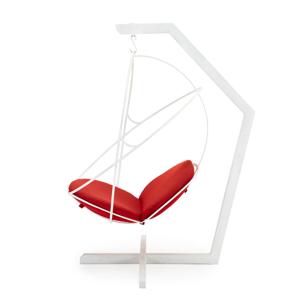 Details: Harper lounge chair by Neuvo with white hanging seat contraption, red cushions, and large white metal frame