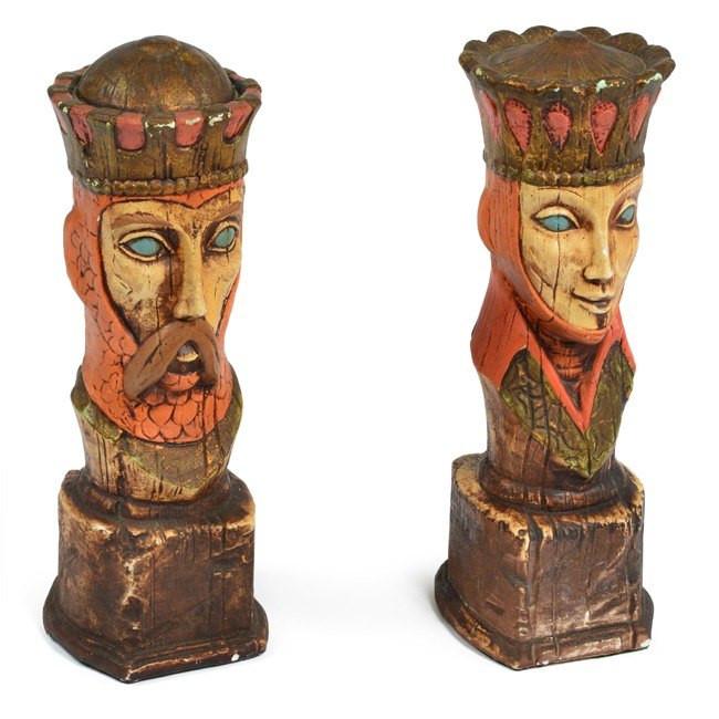 Details: Carved wooden busts of a king and a queen with orange head coverings, blue eyes, and forest green crowns