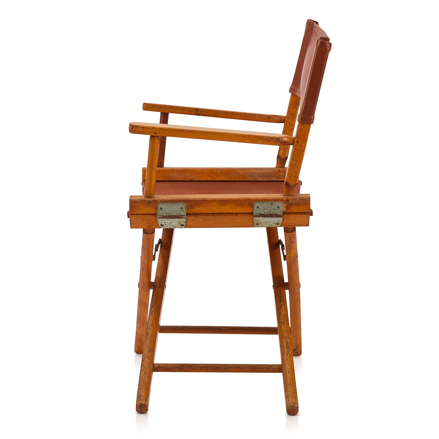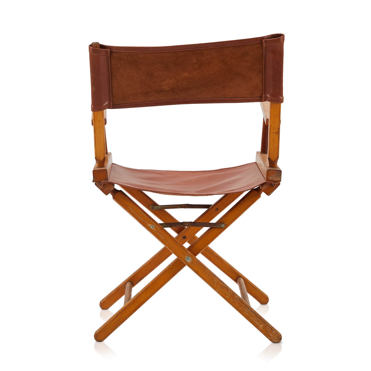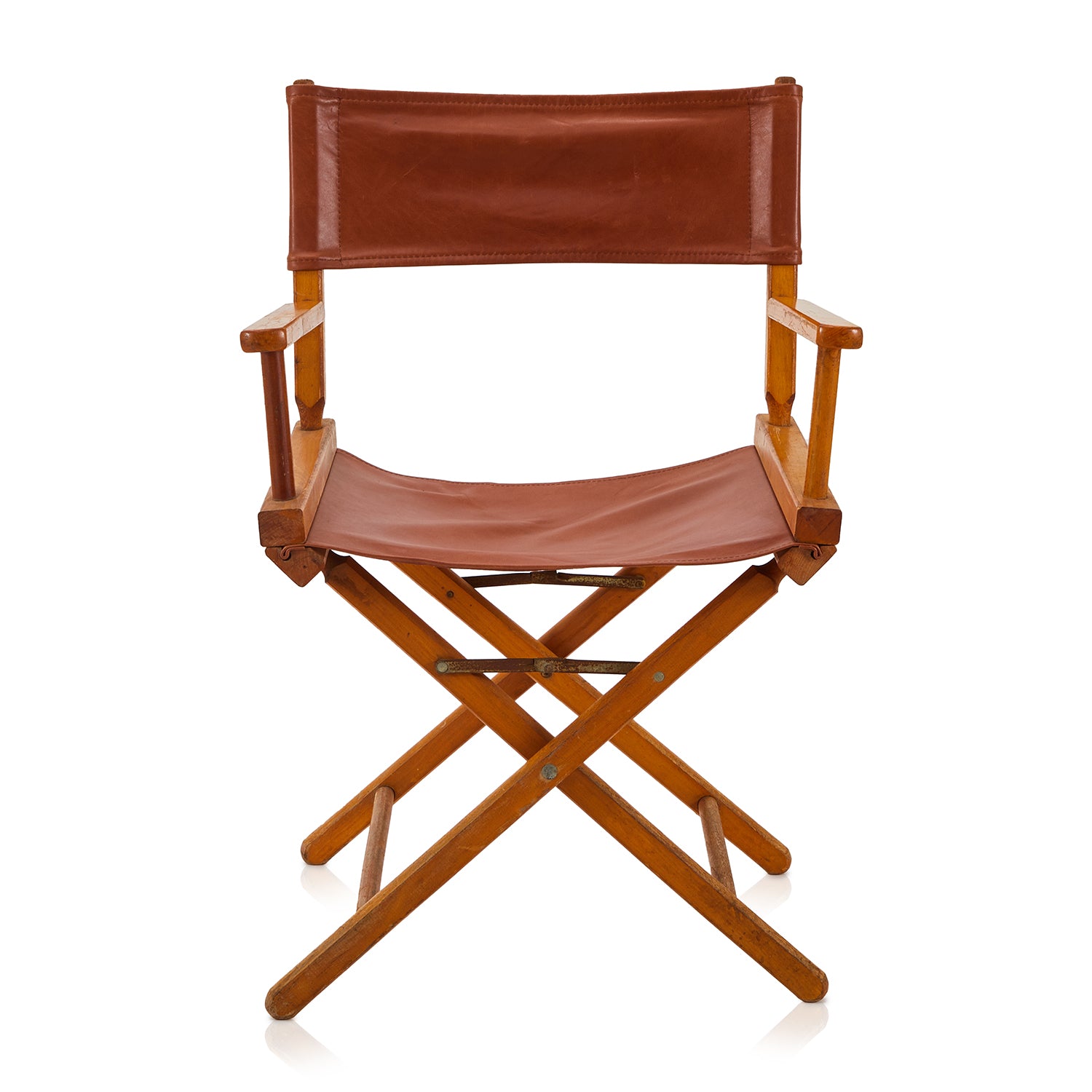 Details: Classic wooden folding director's chair with a leather sling seat and back rest
