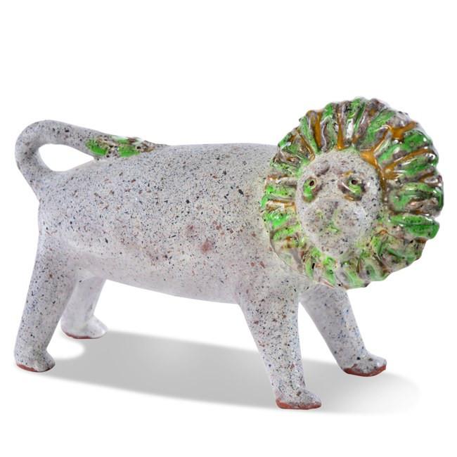 Details: Vintage, handmade sculpture of a grey lion with a green mane and tail