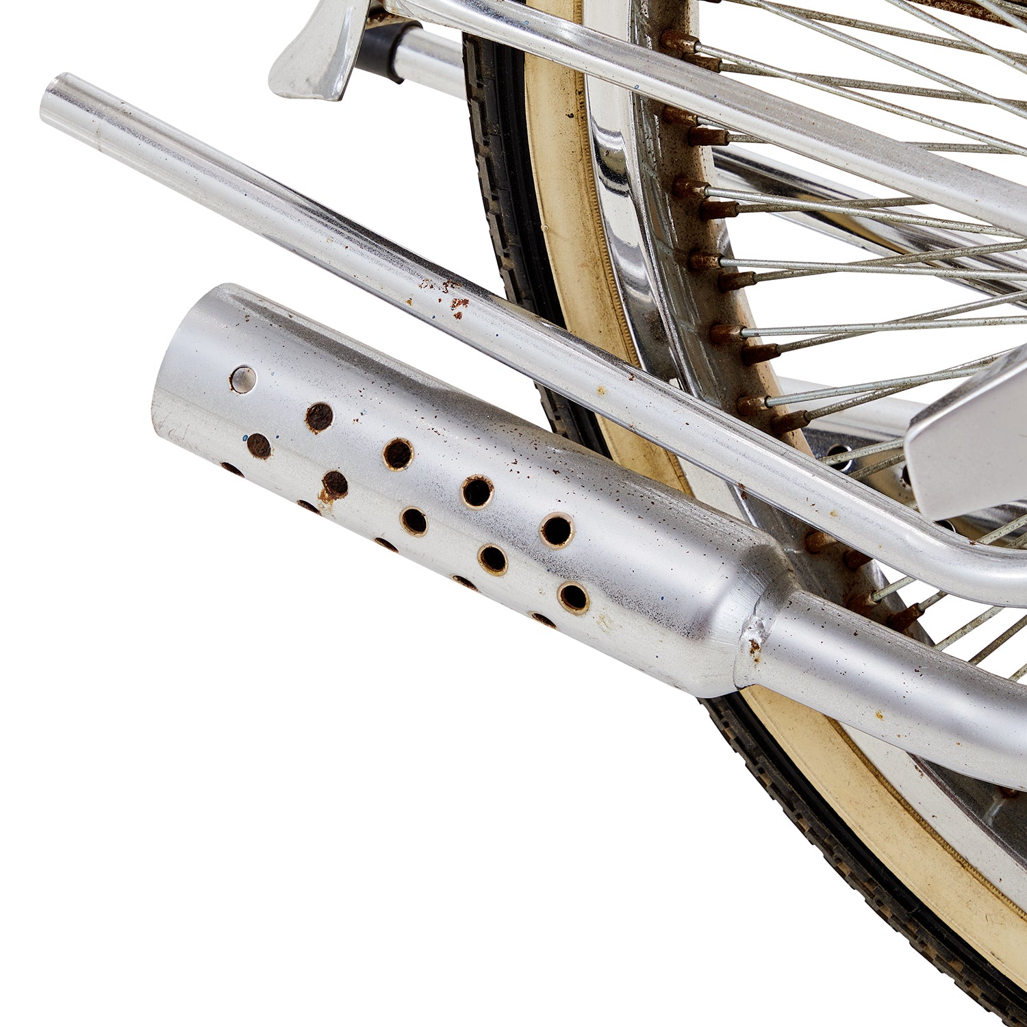 Details: Chrome lowrider bicycle with stylish ornamentations including two horns, mirrors, fake exhaust pipes and spare tire