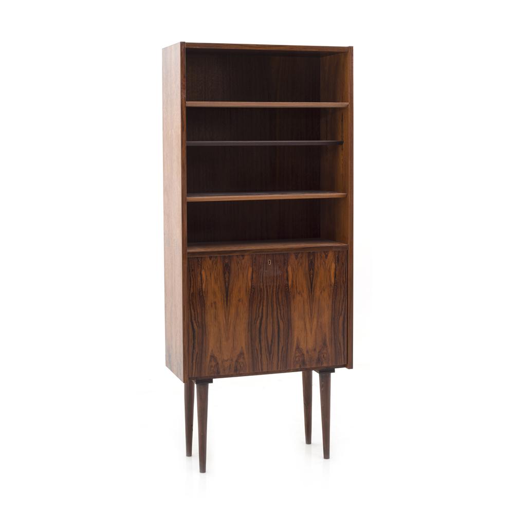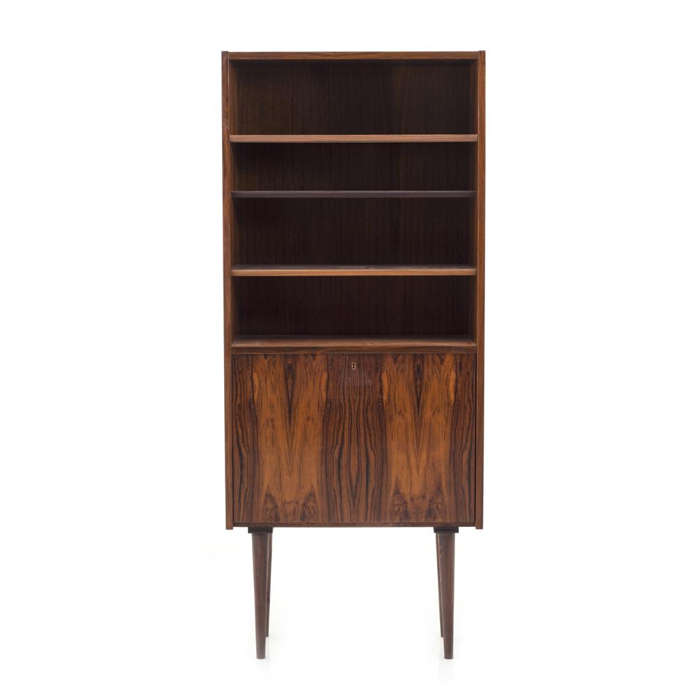 Details: Mid century Skinny Wood Bookcase Cabinet with Tall Legs and additional bottom storage.