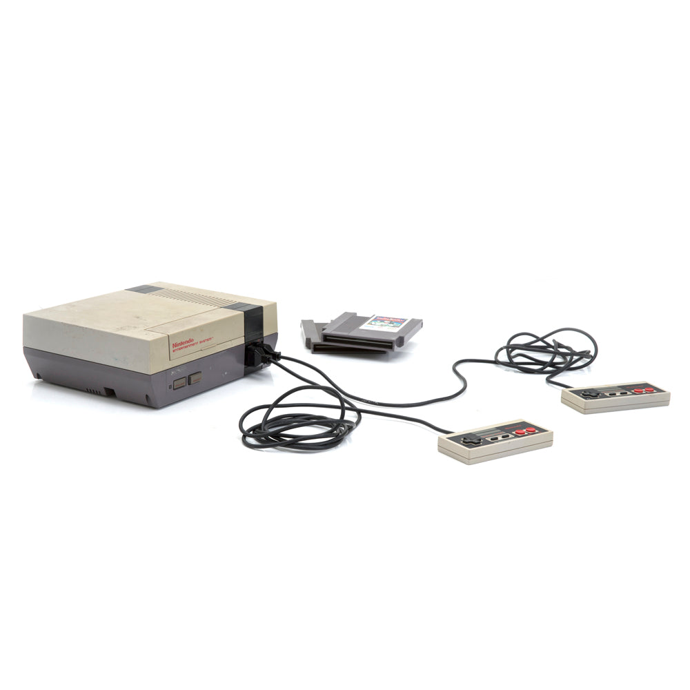 Details: Original Nintento Entertainment System with controllers and video game cartridges