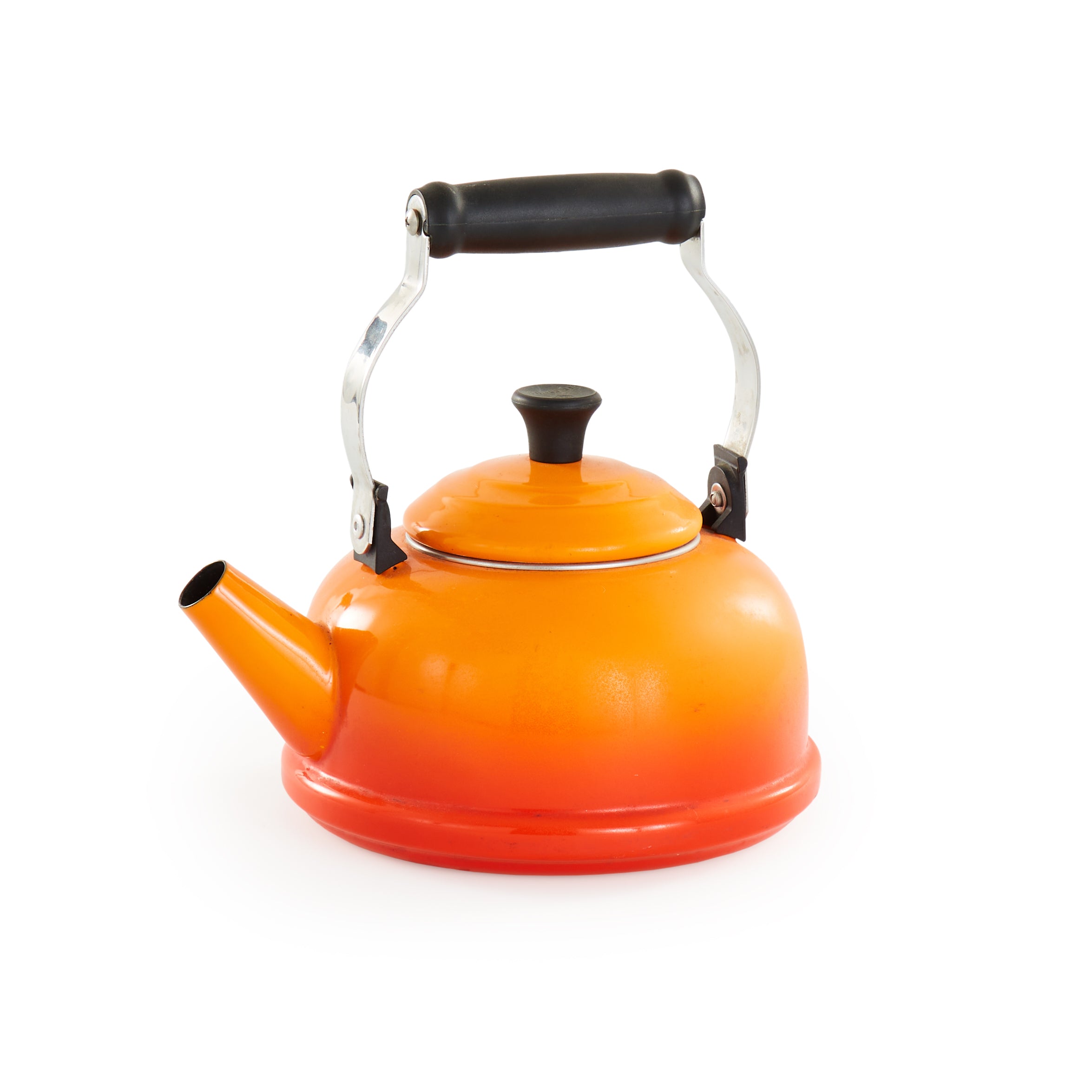 Details: Metal tea kettle with red to orange gradient color and siler and black handle