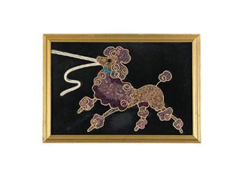 Details: Black velvet artwork in a gold frame of a manicured poodle tugging on a rope