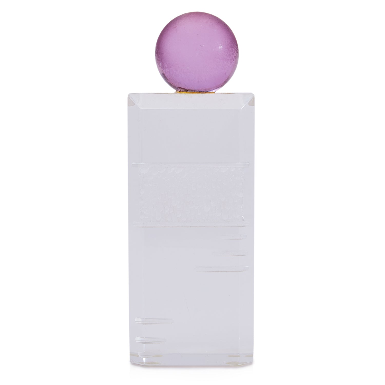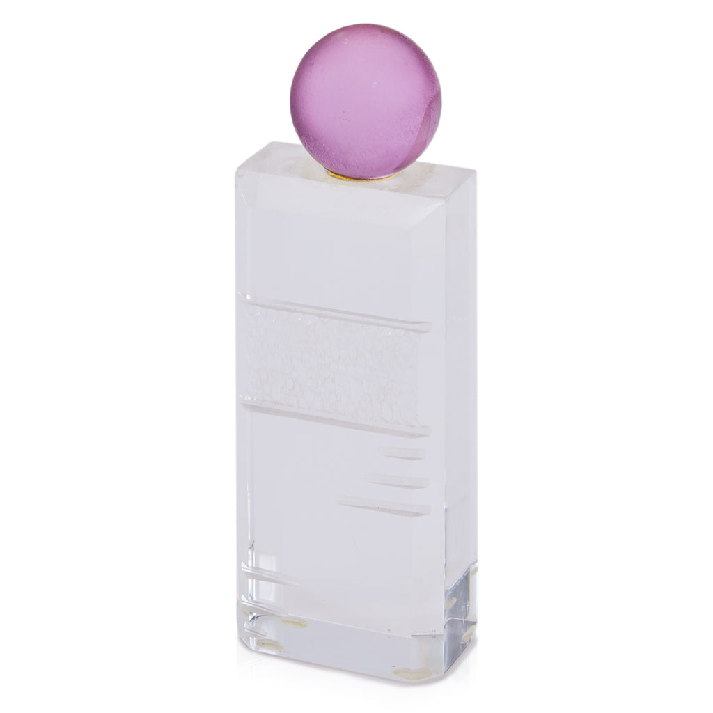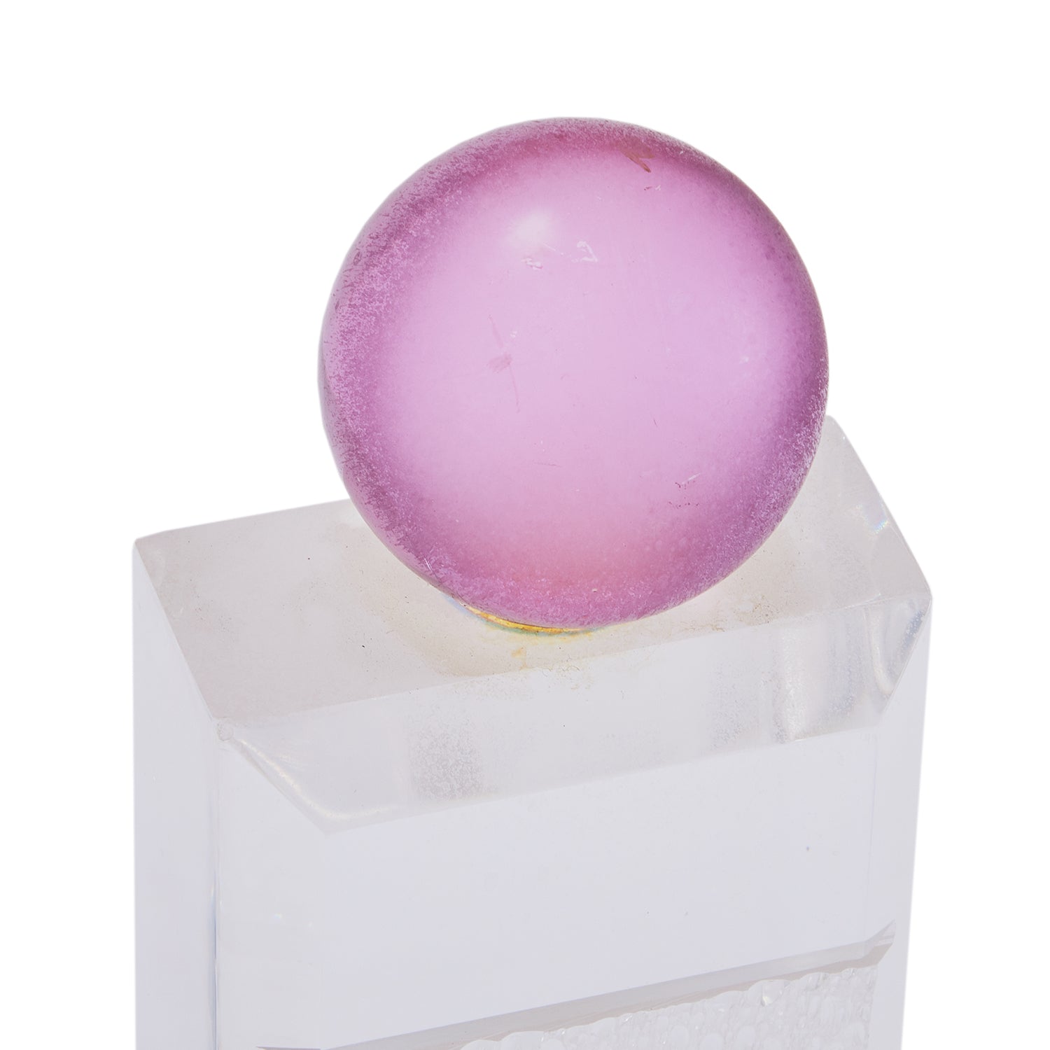 Details: Acrylic sculpture composed of a translucent purple sphere sitting atop a clear rectangular body with sporadic ridges