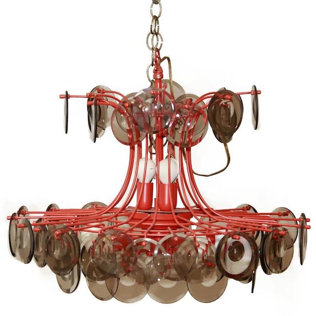 Details: Red Wire Chandelier, Curved, Metal, Hanging Lamp, Light, Round Smoked Glass Hanging Discs