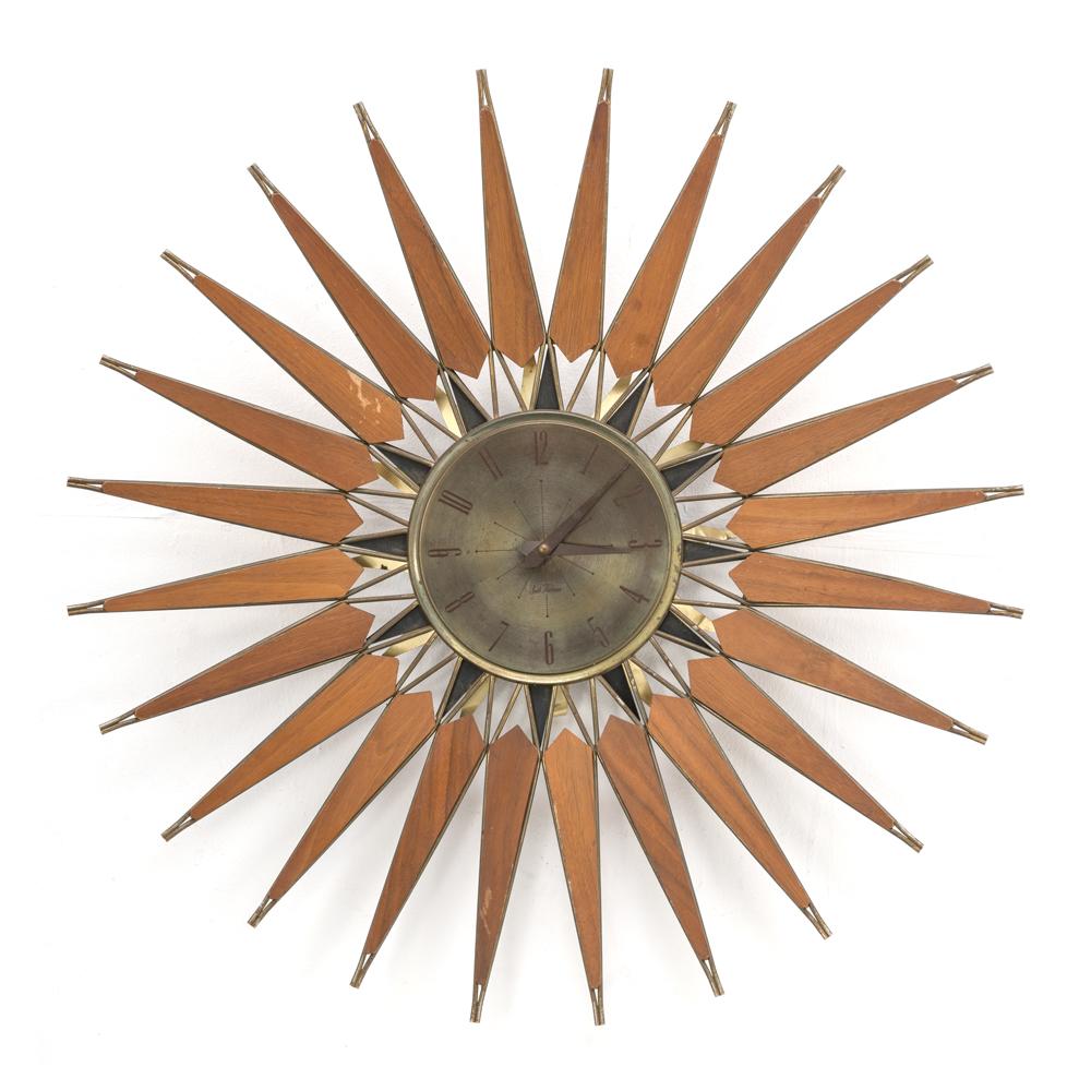 Details: Seth Thomas, Wooden Sun Wall Clock, Brass Accents, Starburst