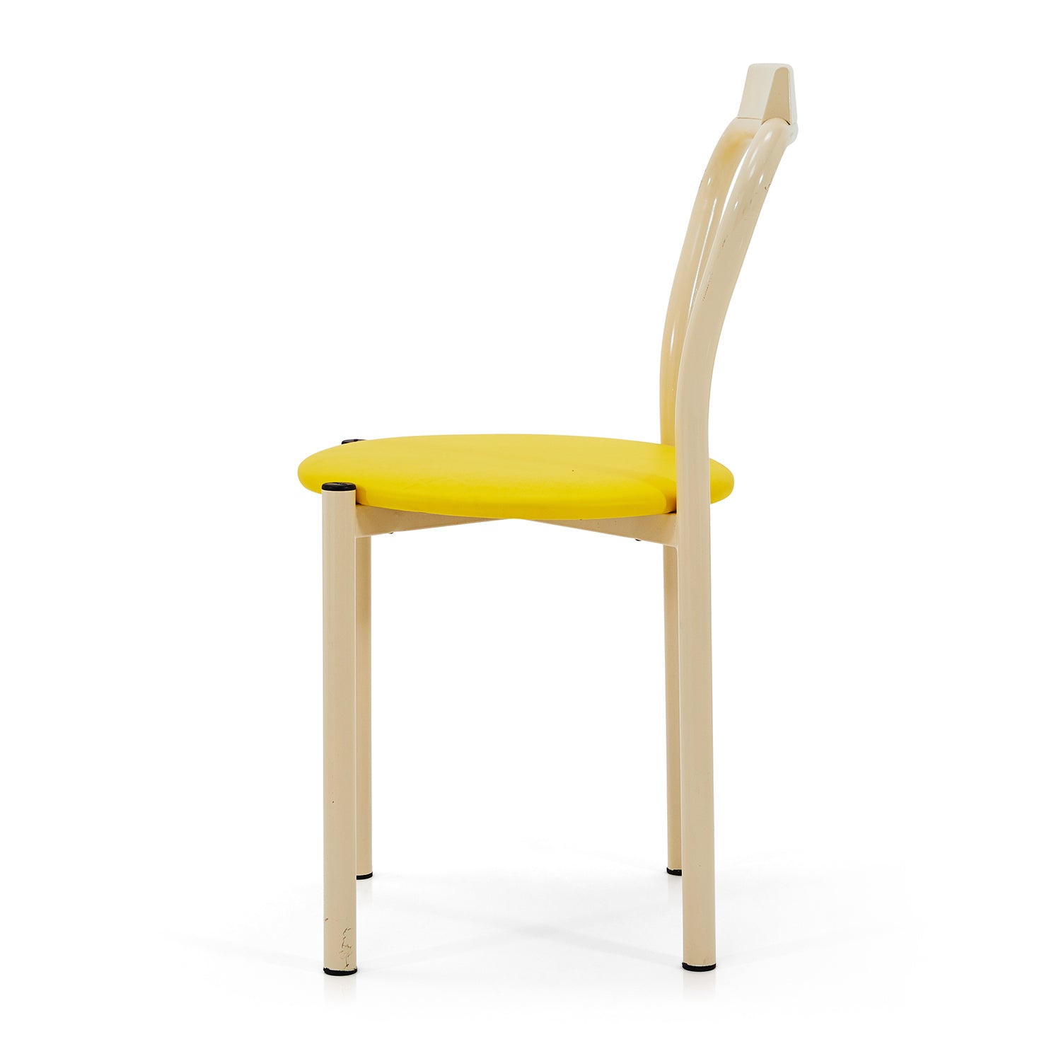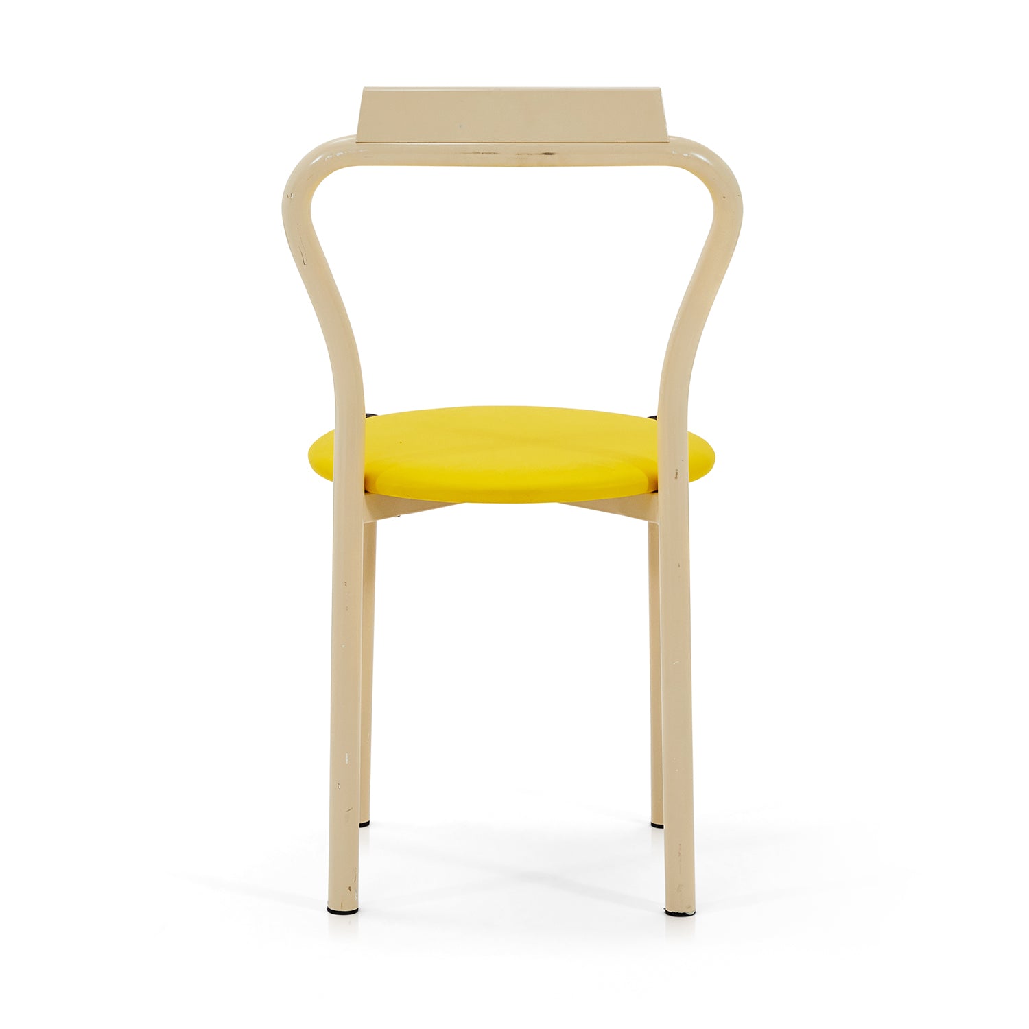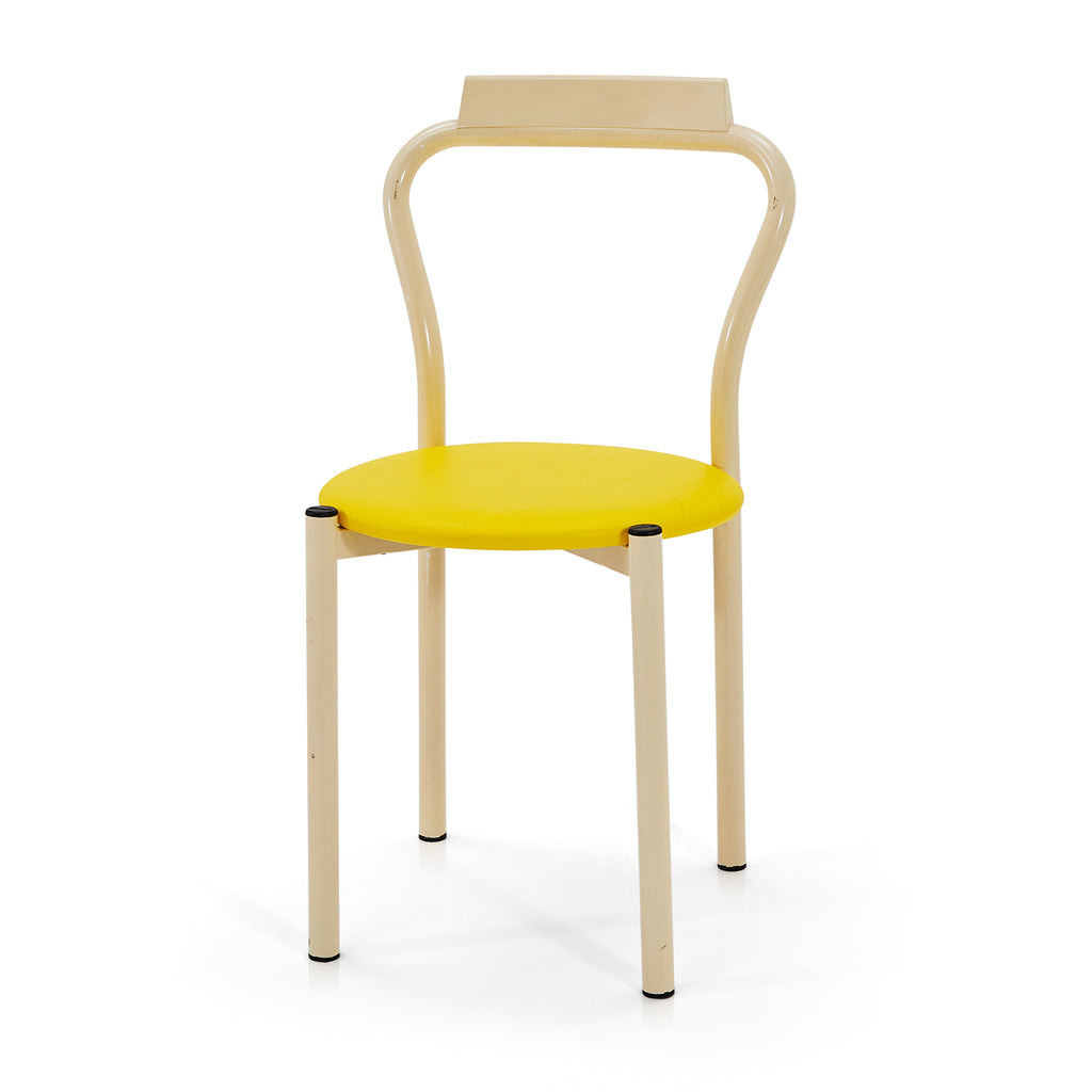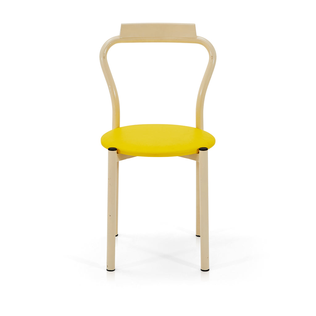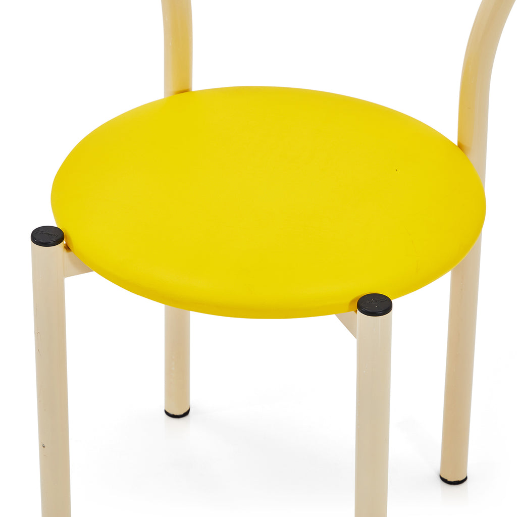 Details: Dining chair with white metal frame and yellow circular seat cushion