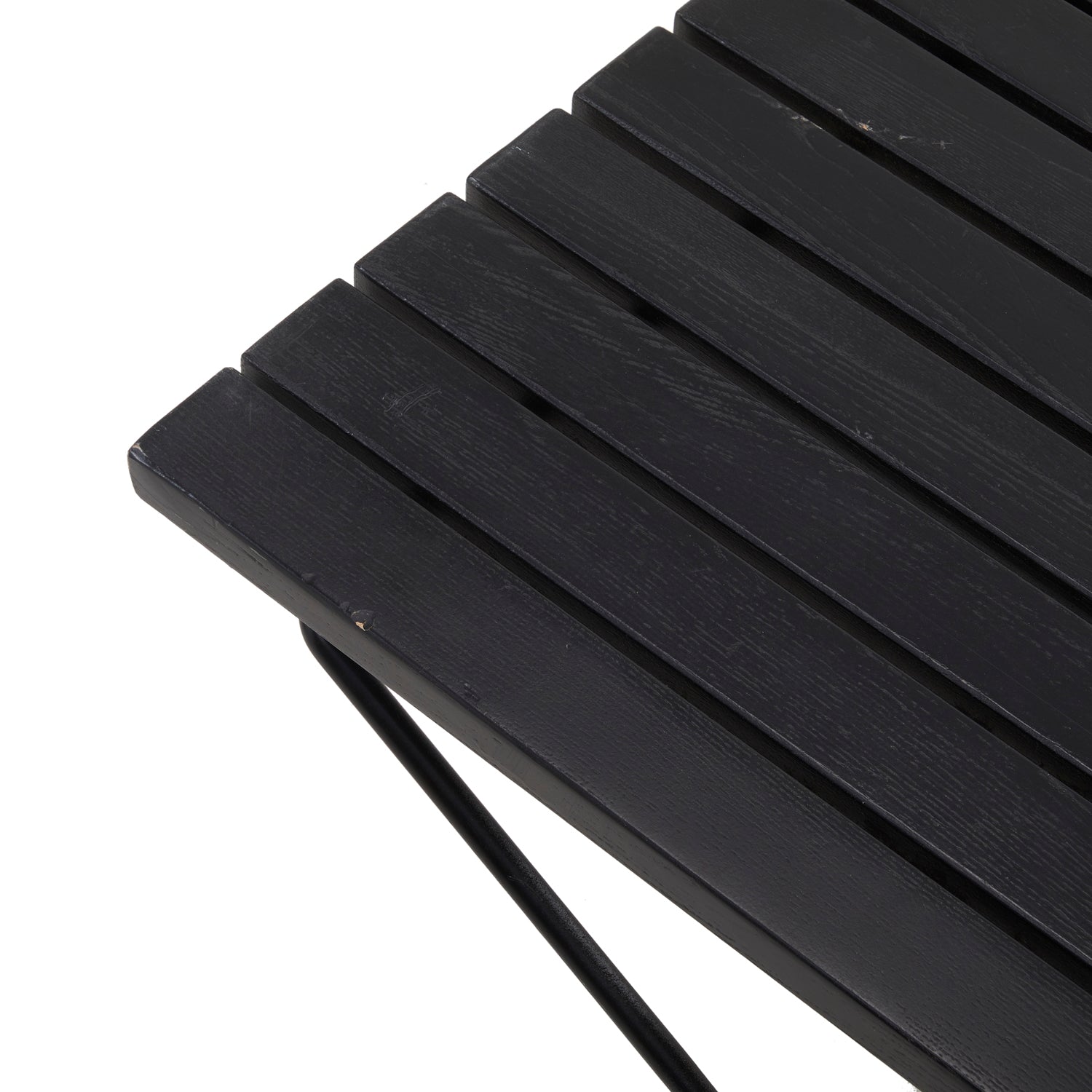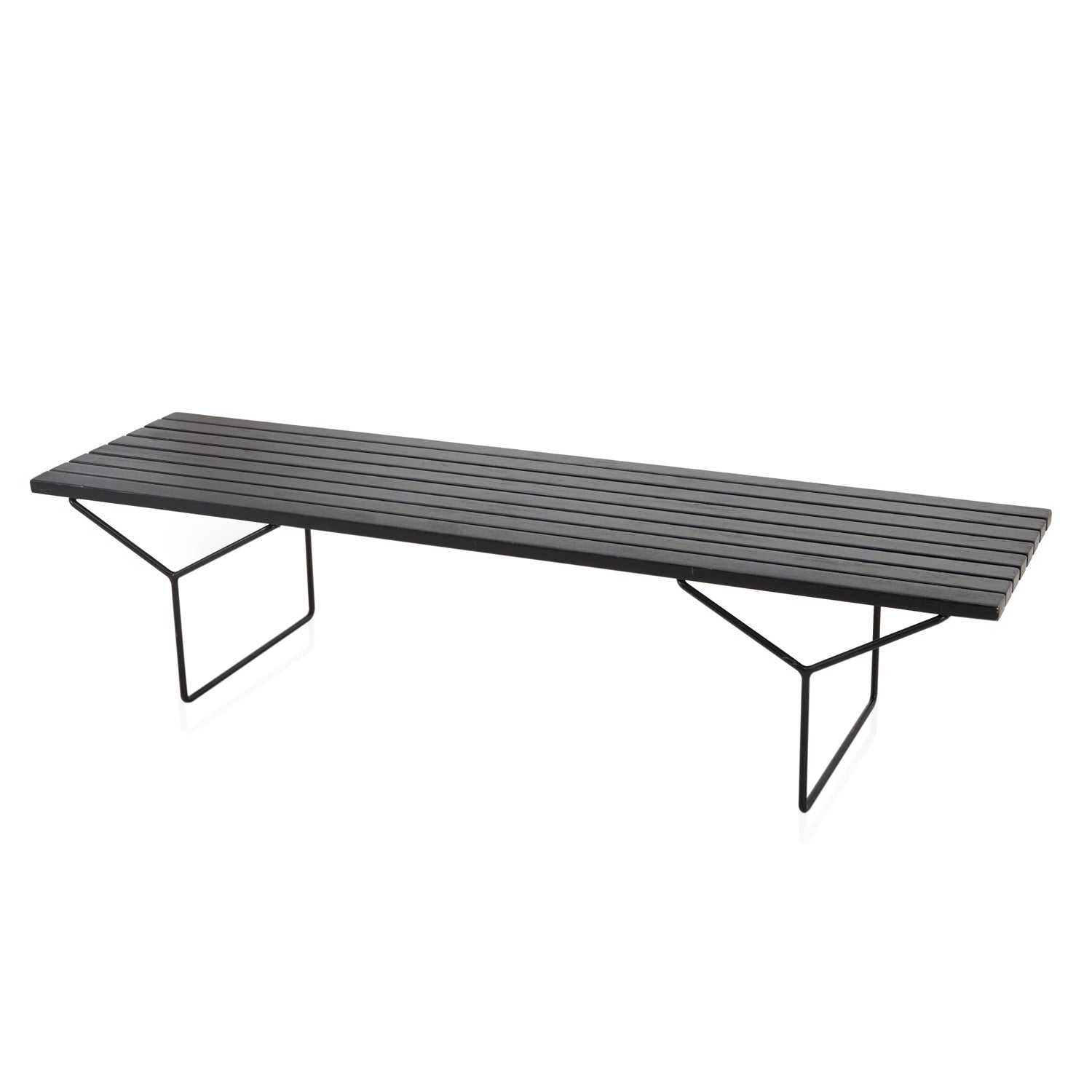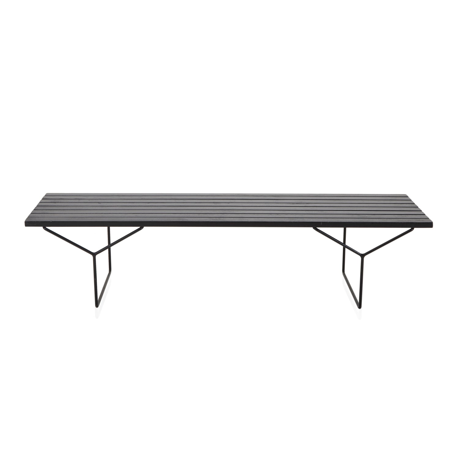 Details: Long Bertoia-style wood slat bench and black Y-rod metal frame