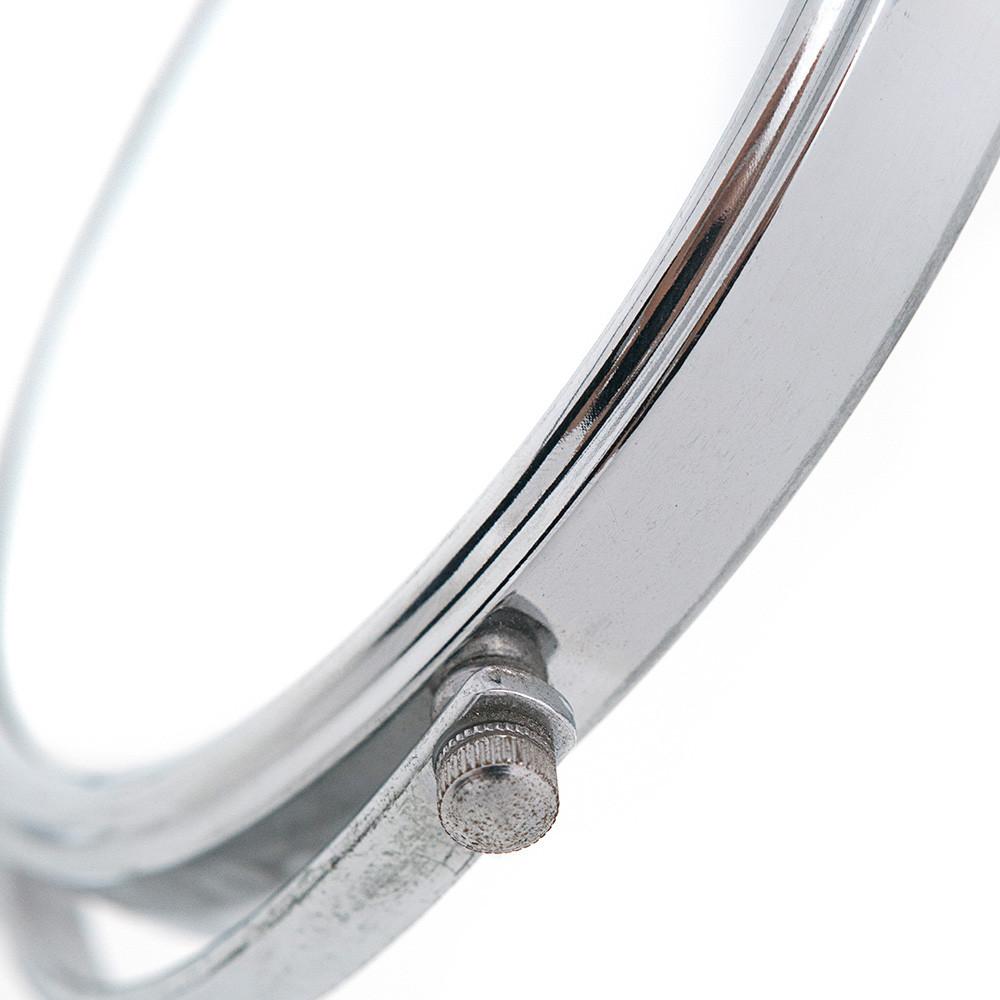 Details: Silver mirror with circular base and frame and adjustable angle