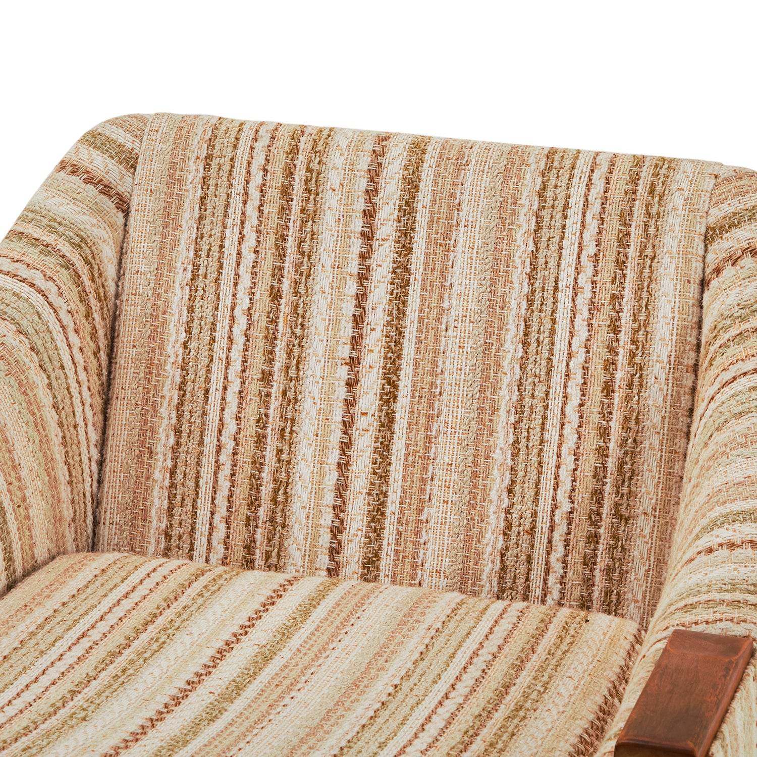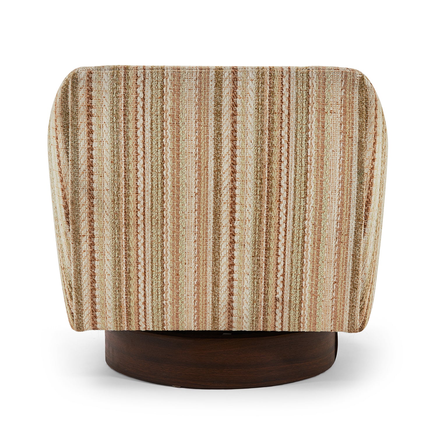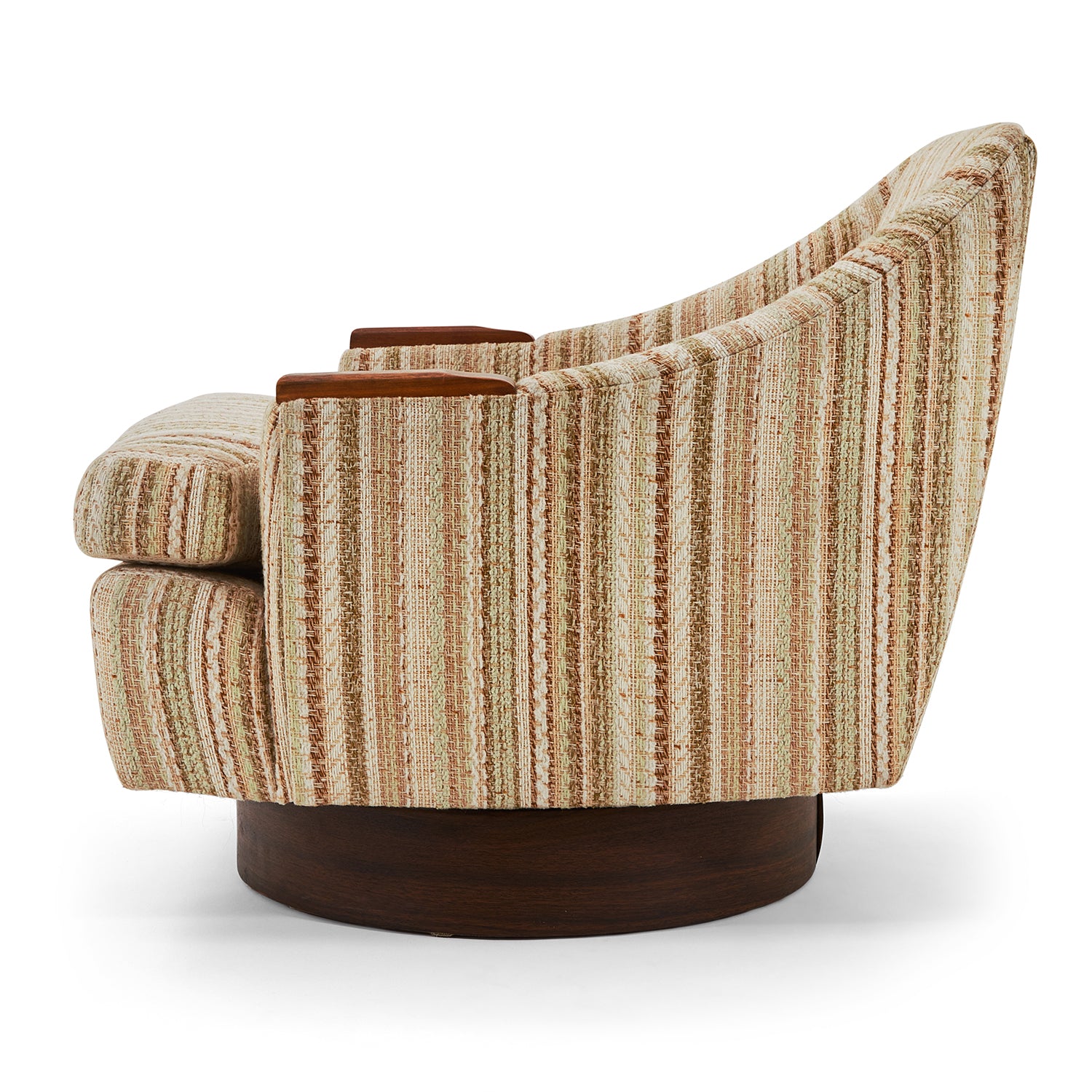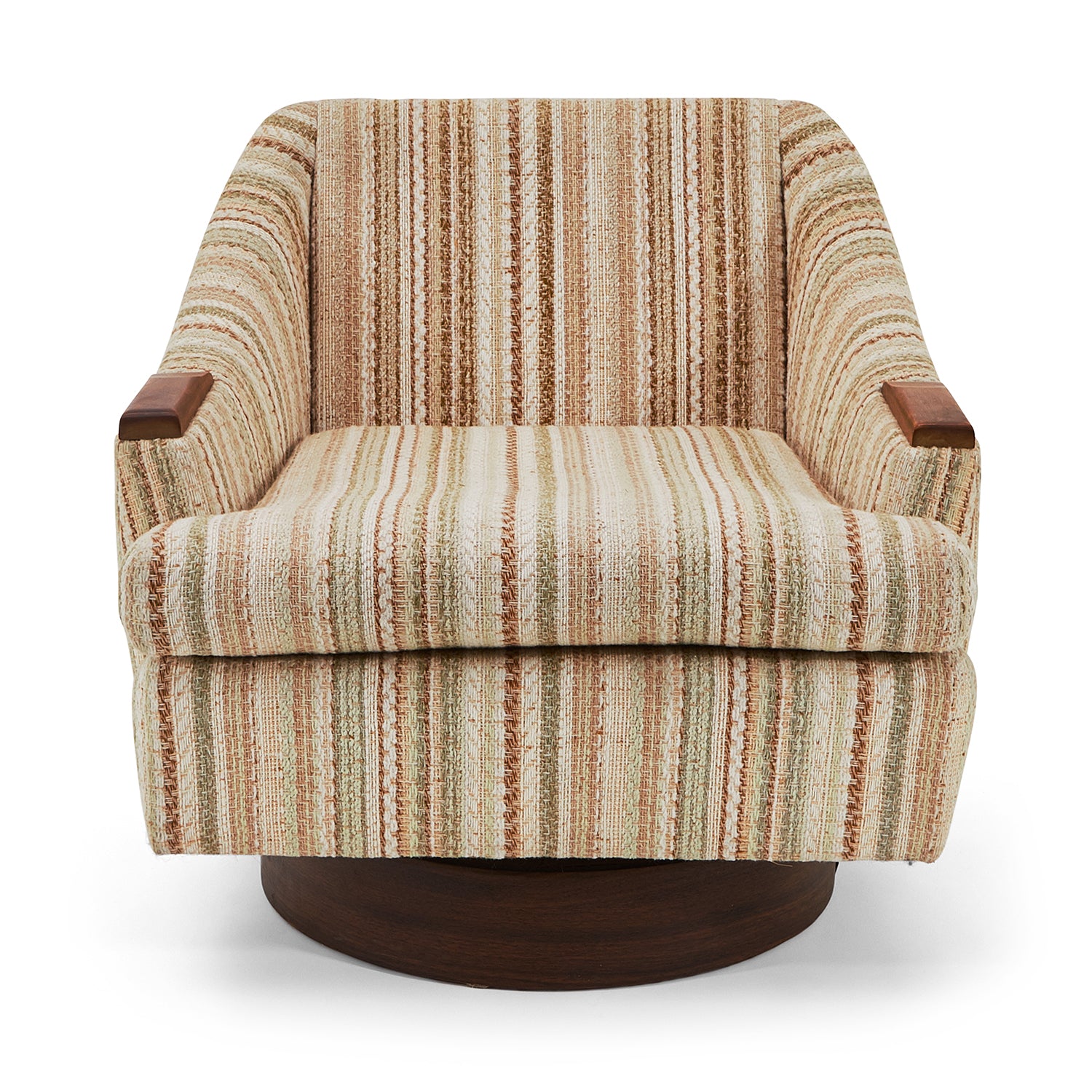 Striped Tan-Brown-Light Green Fabric (Vintage), Wood Armrests, Round Wood Swivel Base