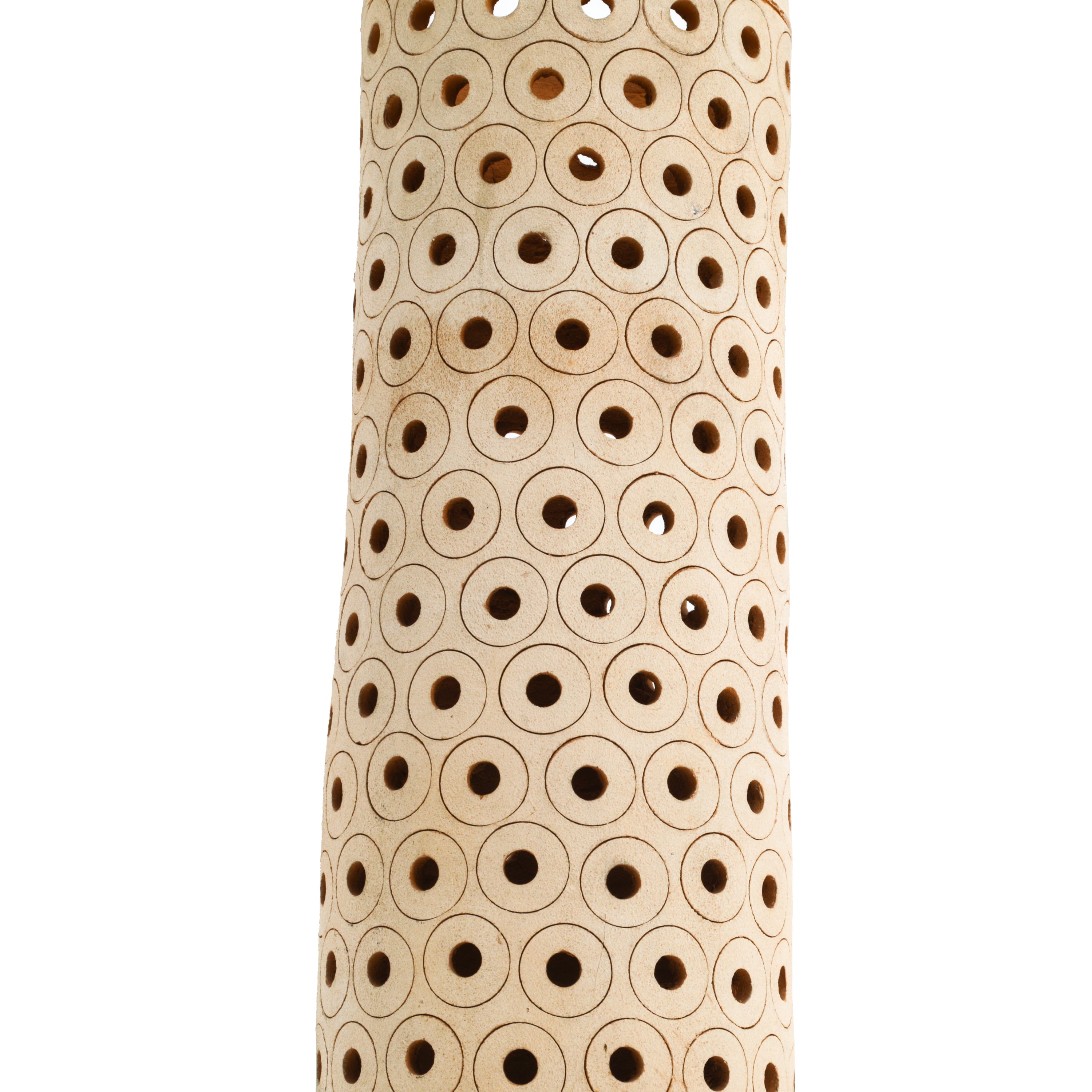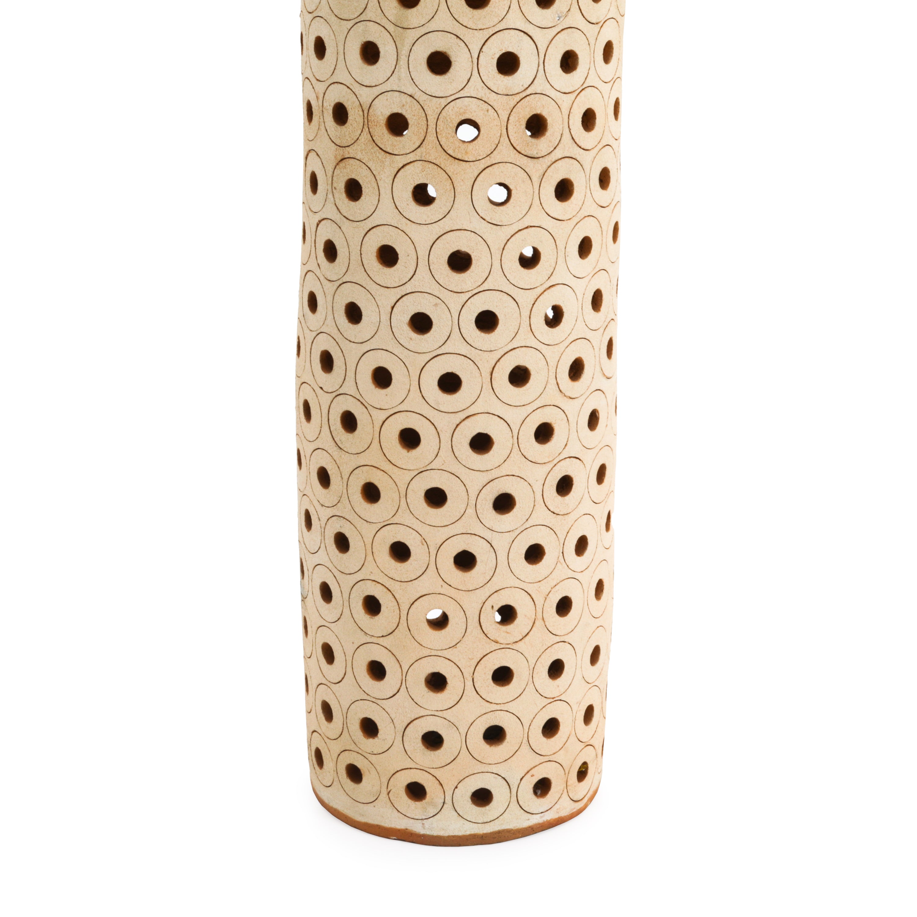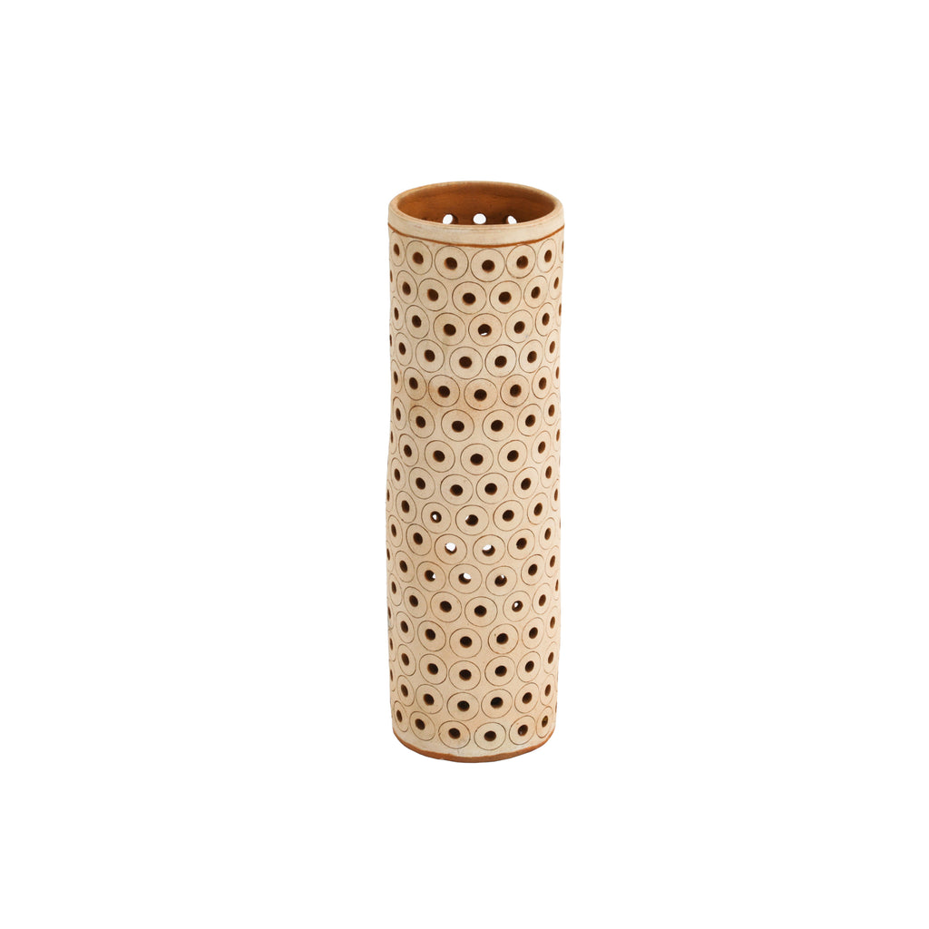 Details: Ceramic cylinder vase with holes throughout.