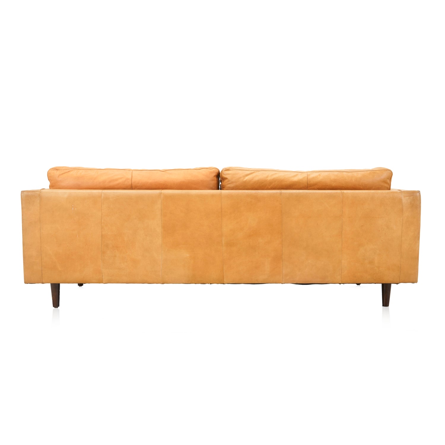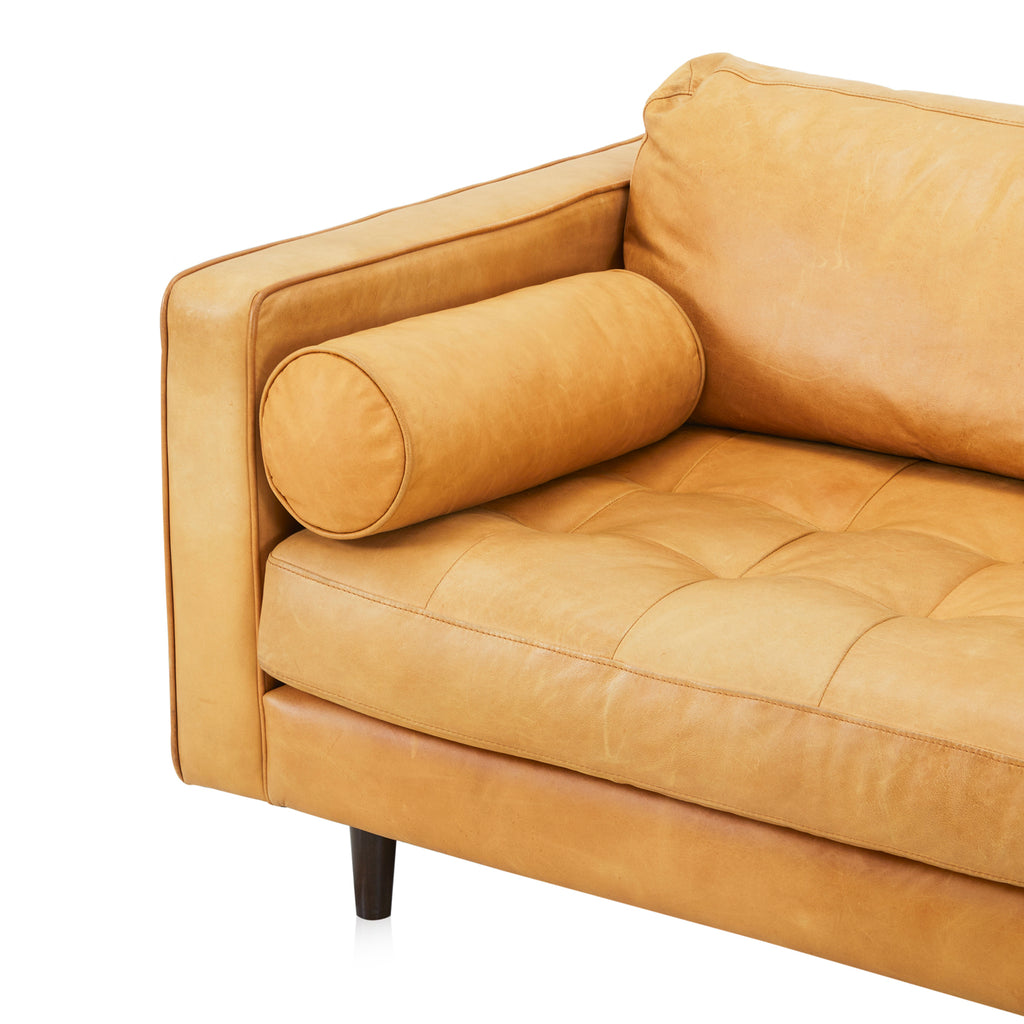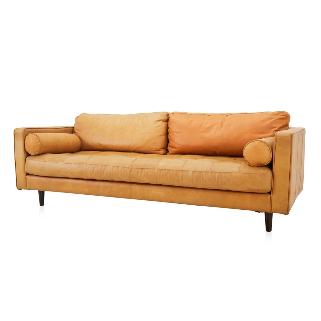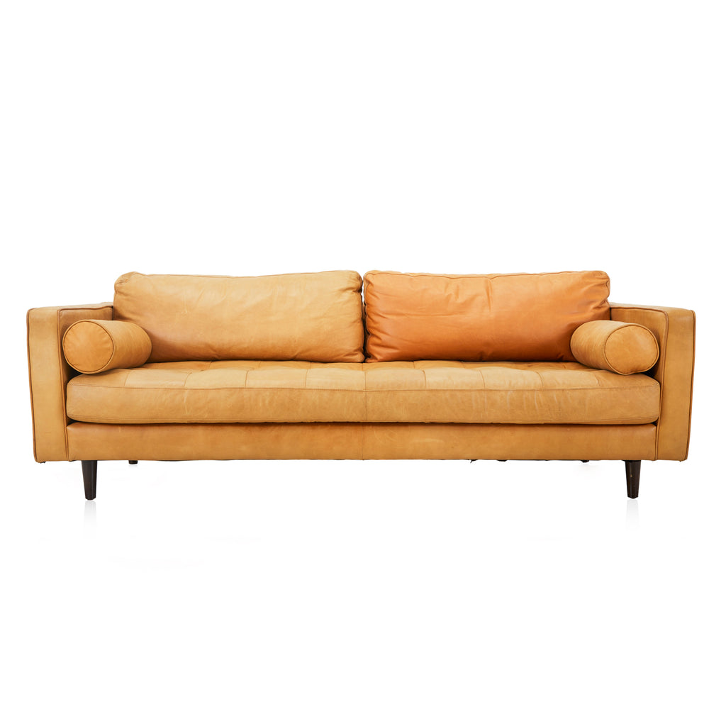 Details: Mid-century modern inspired modern tan/camel leather sofa w. 2 bolsters