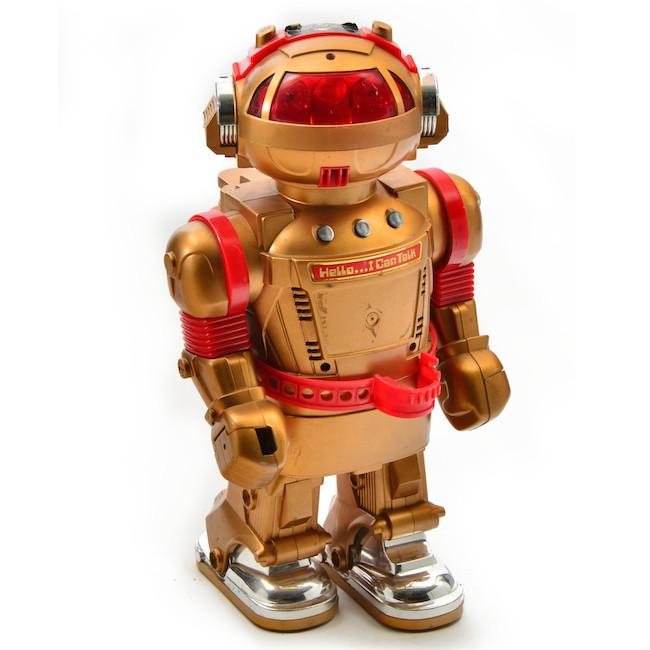 Details: Toy Robot, Moveable Arms and Legs, Gold and Red, Chrome Buttons and Accents